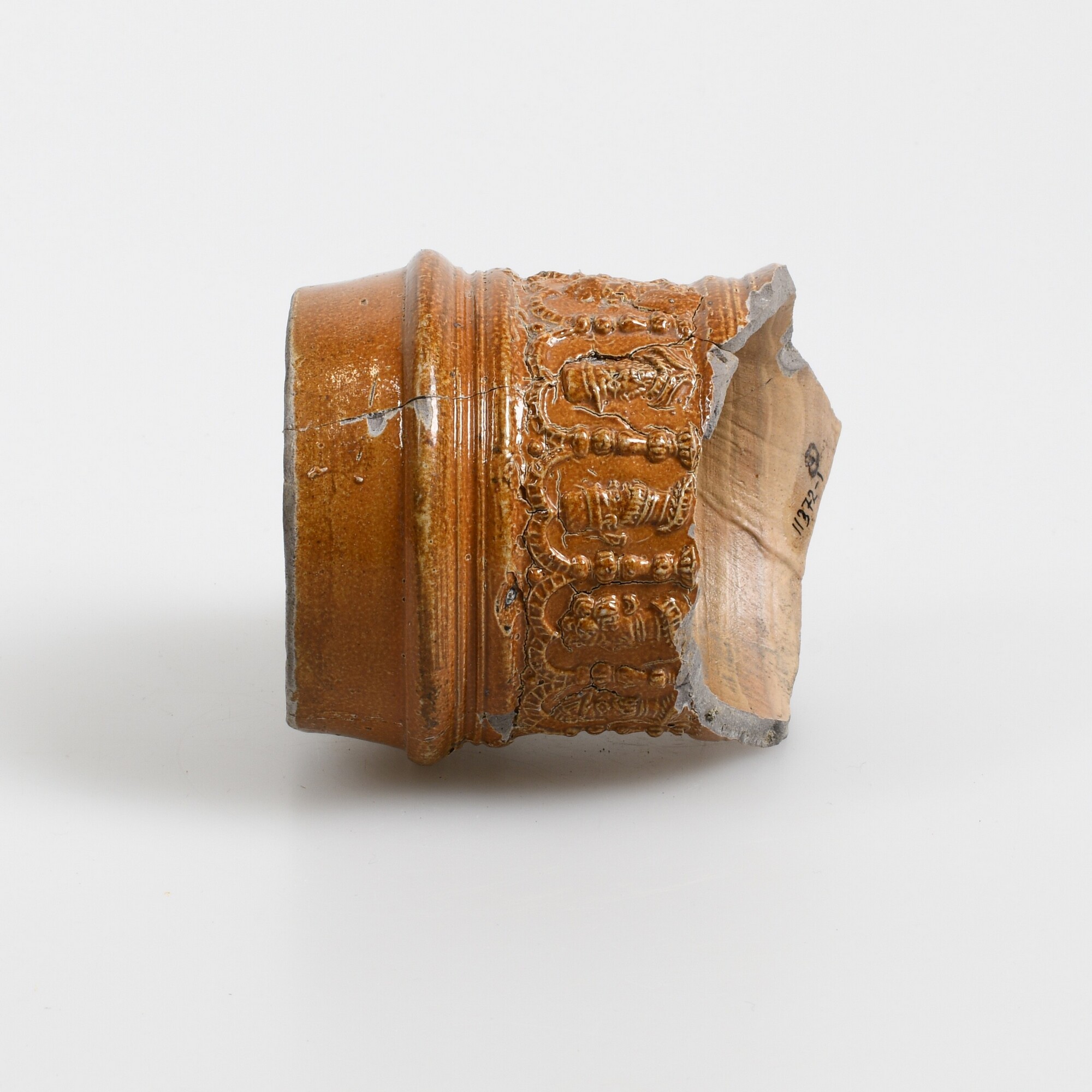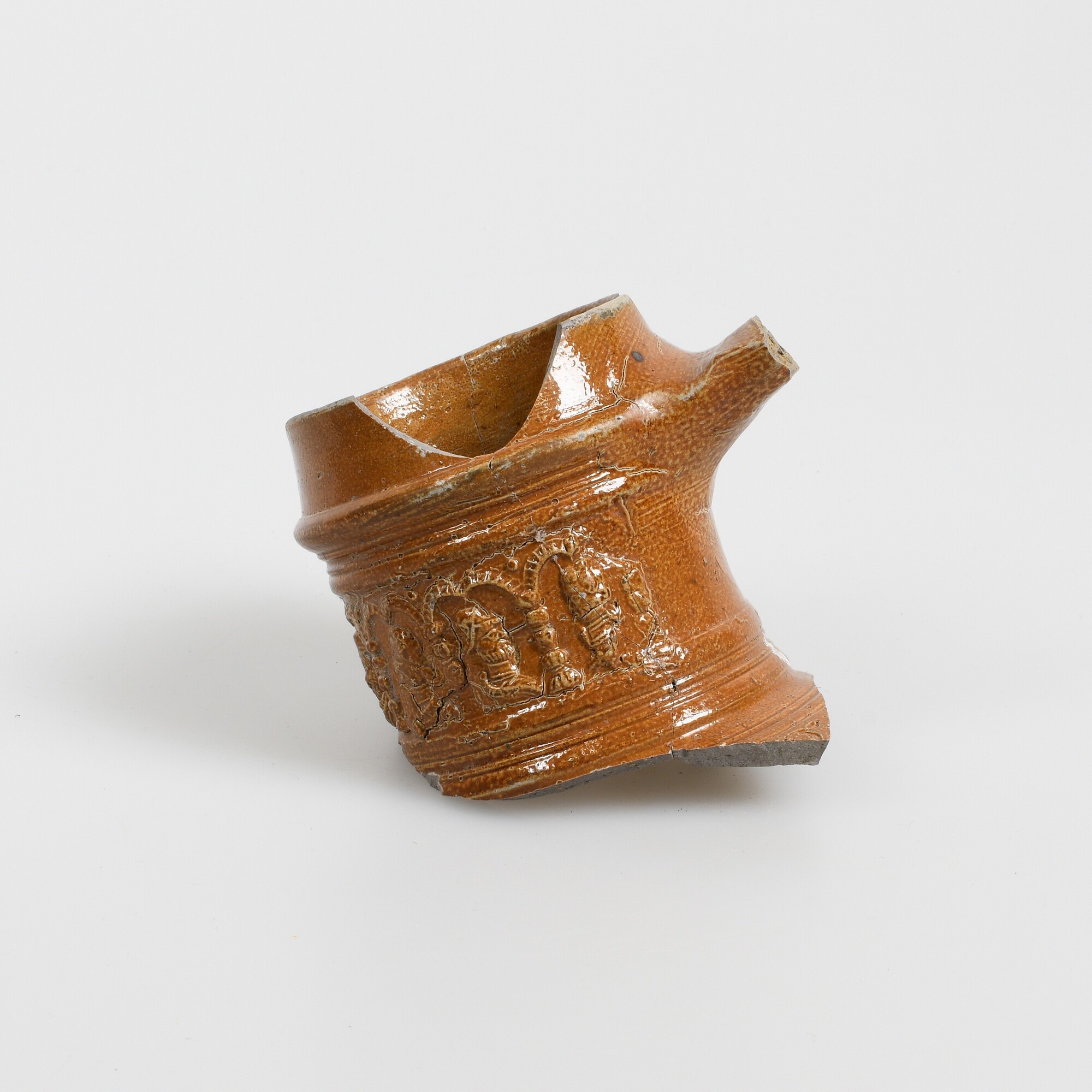 Kan (randfragment); s2-kan-; kraagrand; steengoed met oppervlaktebehandeling: zoutglazuur, ijzerengobe; in reliëf op hals: fries met zeven mansportretten binnen bogen; herkomst: Raeren, Rijnland