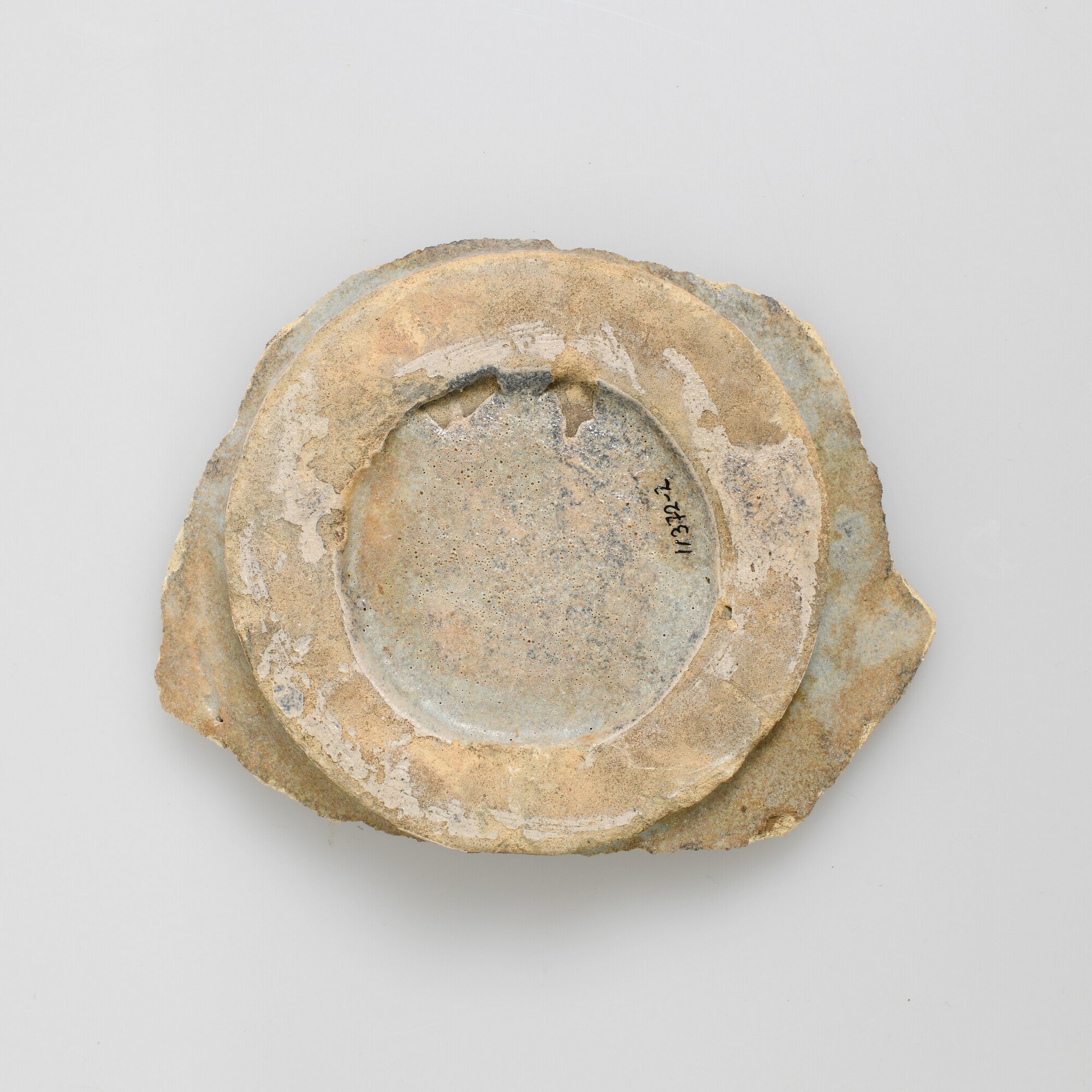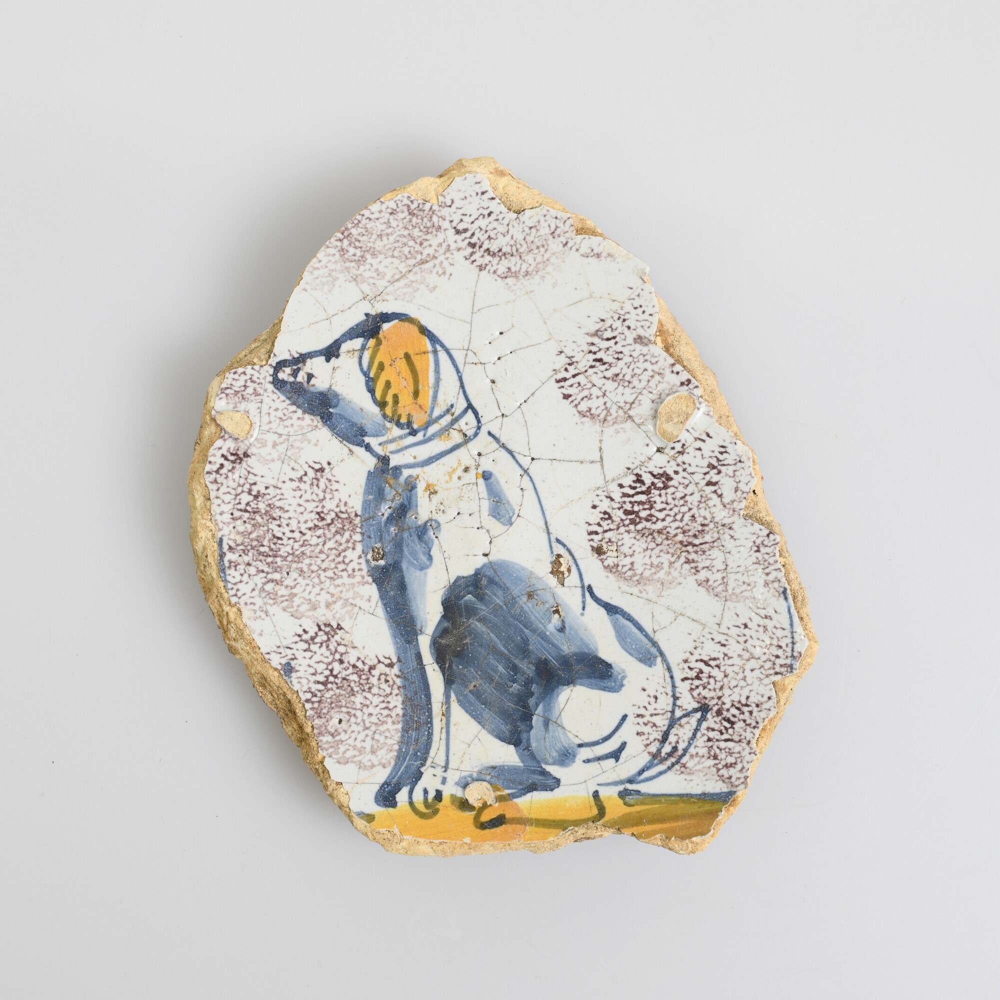 Bord (bodemfragment); m-bor-; standring; majolica; inwendig tinglazuur, uitwendig loodglazuur; polychrome beschildering: spiegel: hond tussen gesponste struiken; herkomst: Friesland, vermoedelijk Harlingen