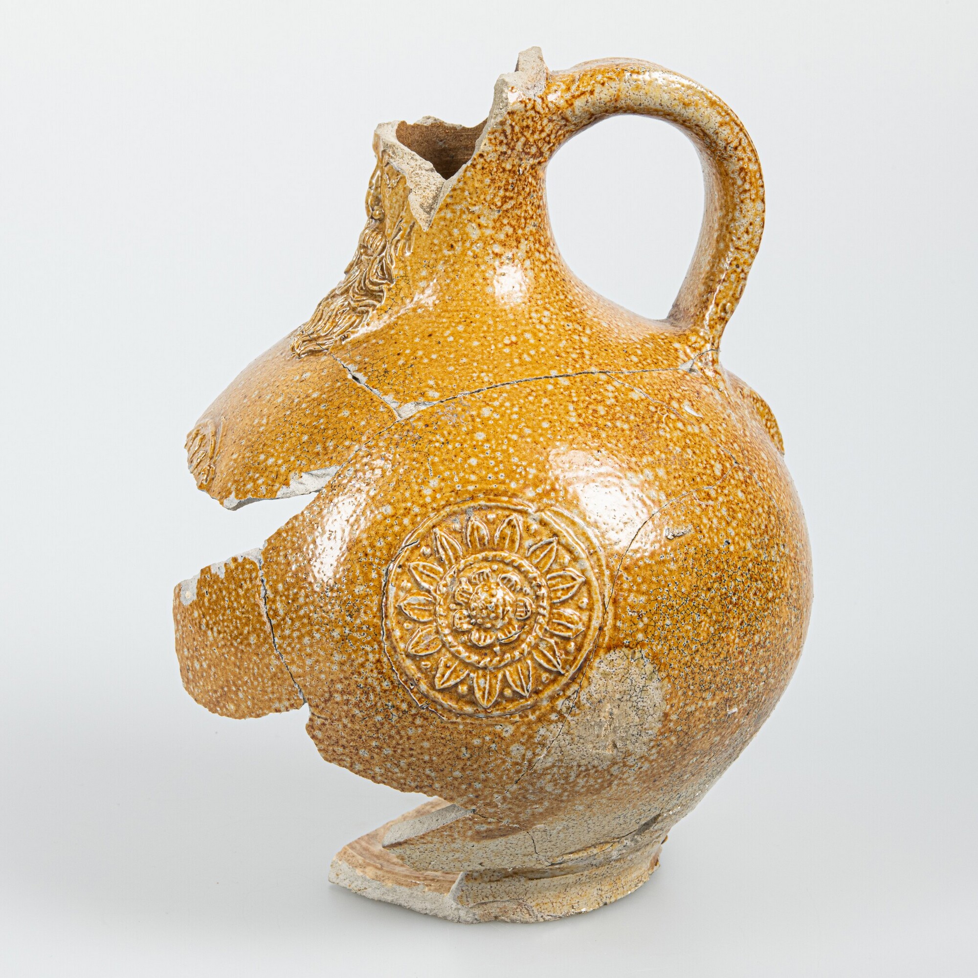 Baardmankruik; s2-kan-32; bolle kan met schouder overgaand in hoge hals met geribbelde kraagrand, standvlak, verticaal lintoor; steengoed met oppervlaktebehandeling: ijzerengobe, zoutglazuur; appliques: baardman op hals; drie rozetten op buik; herkomst: Frechen, Duitsland
