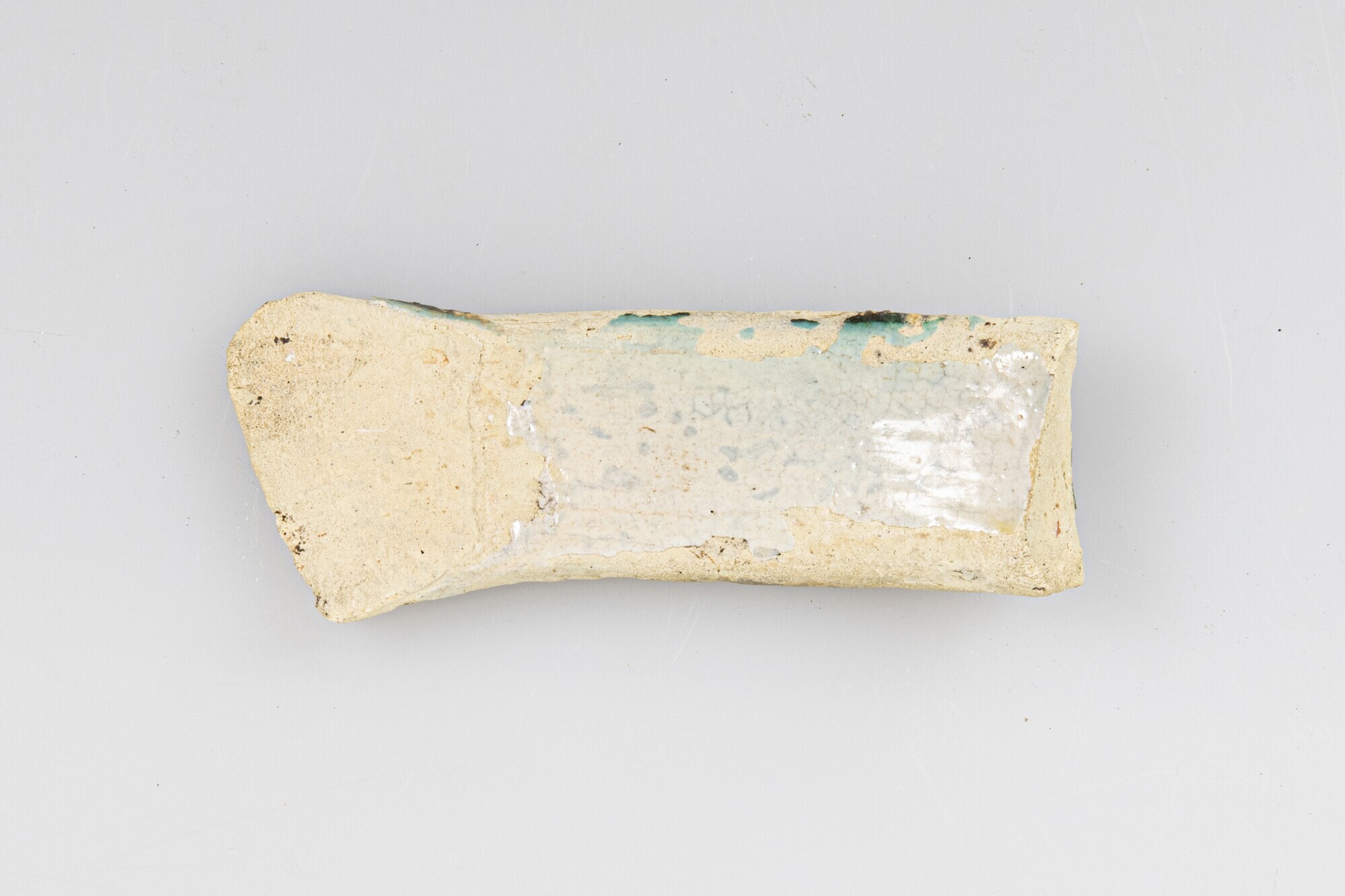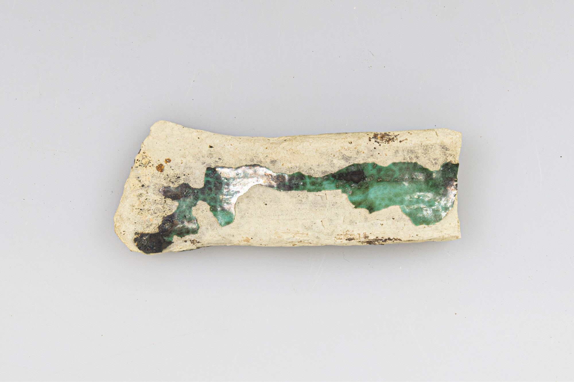 Kan (oorfragment); i-kan-6?; lintoor; Italiaanse majolica; tinglazuur; polychrome beschildering: kopergroen en mangaanbruin; herkomst: Montelupo, Italië