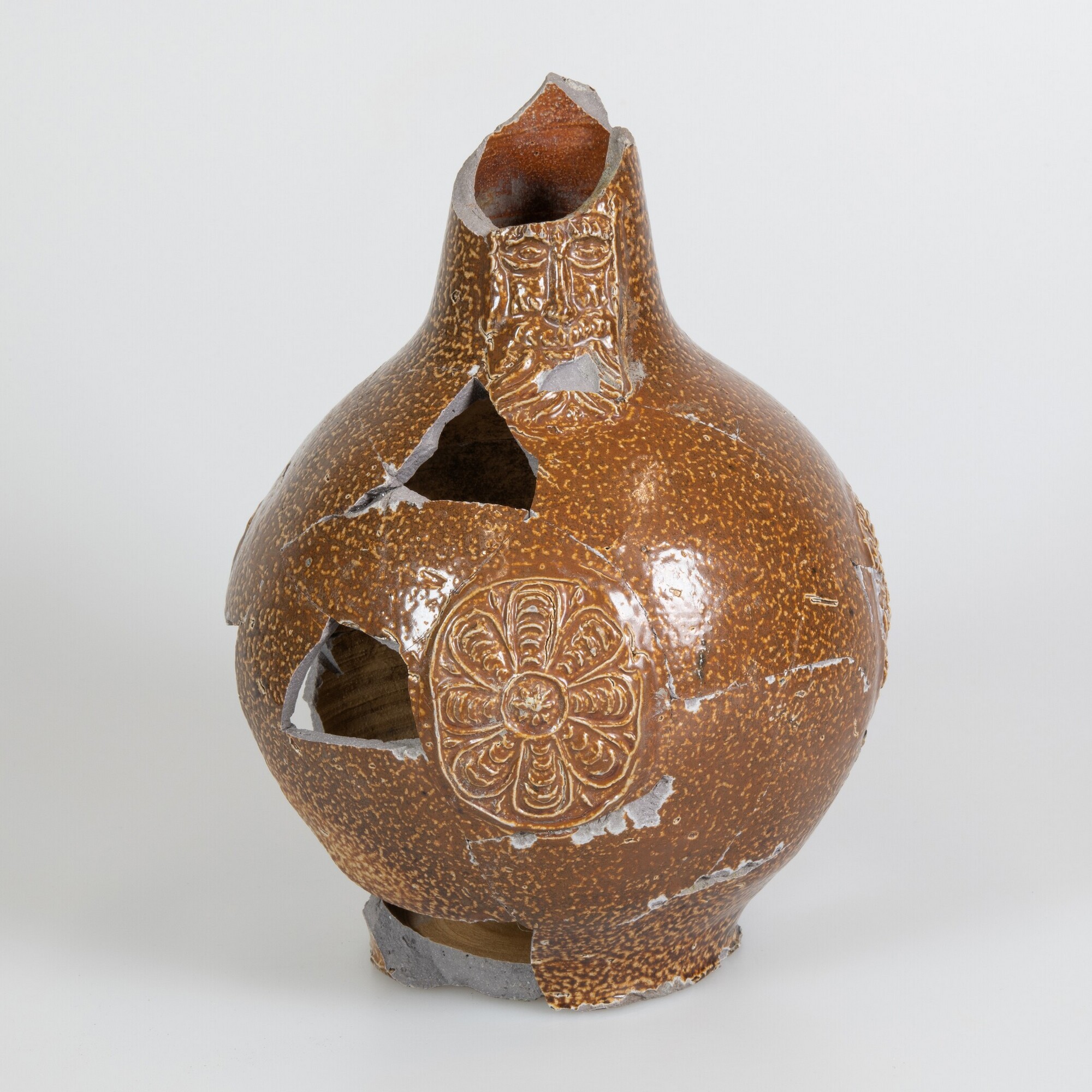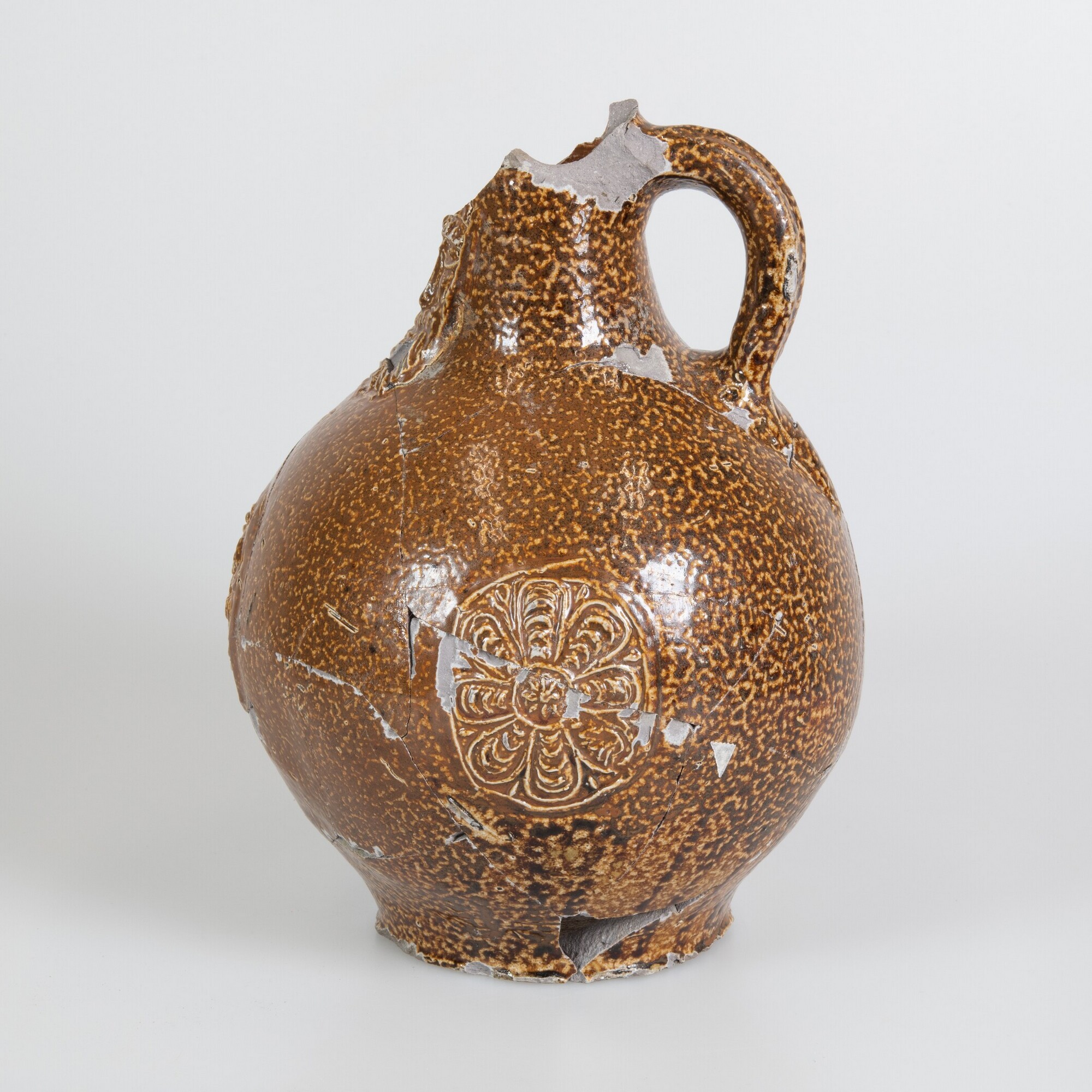 Baardmankruik; s2-kan-32; bolle kan met schouder overgaand in hoge hals met geribbelde kraagrand, standvlak, verticaal lintoor; steengoed met oppervlaktebehandeling: ijzerengobe, zoutglazuur; appliques: baardman op hals; drie rozetten op buik; herkomst: Frechen, Duitsland