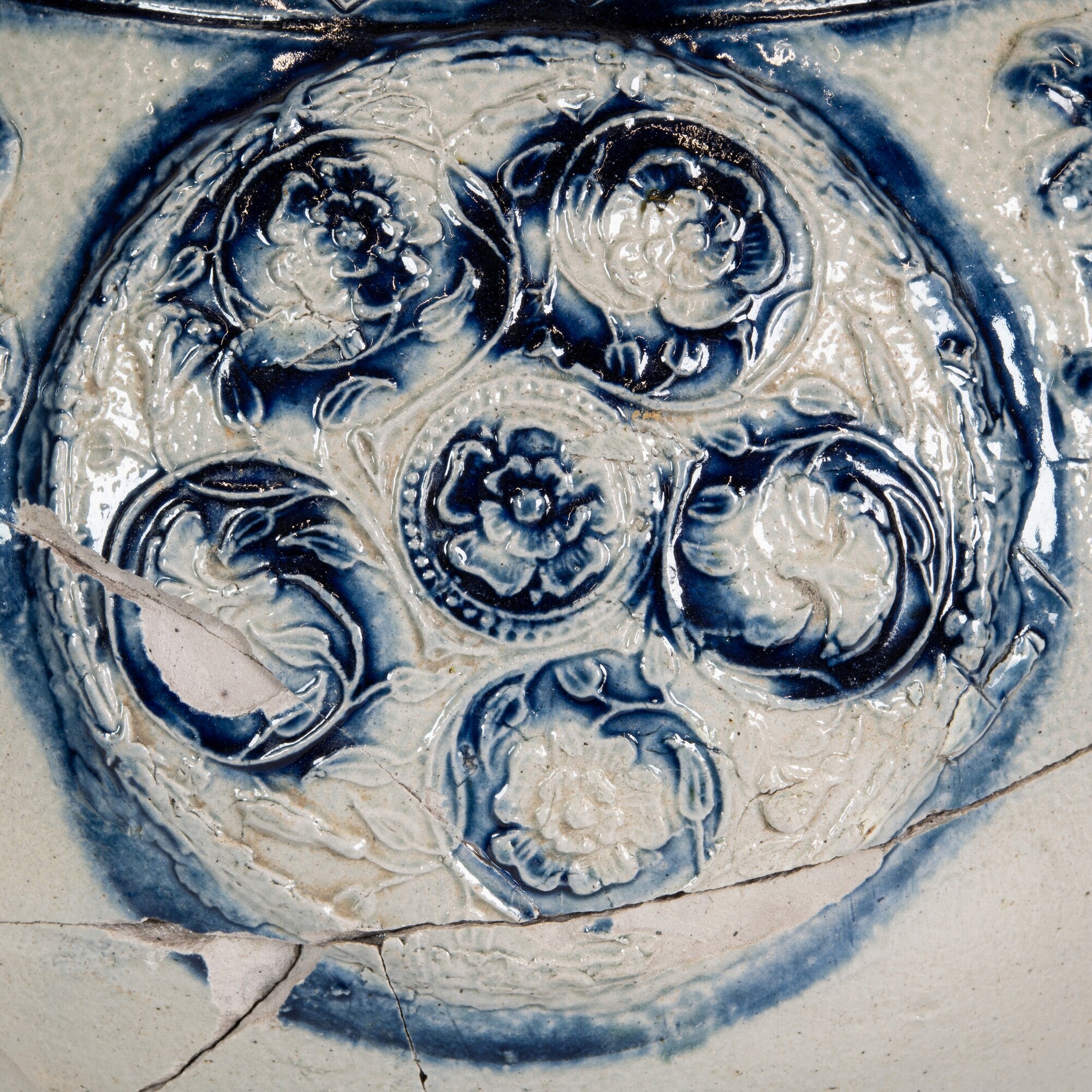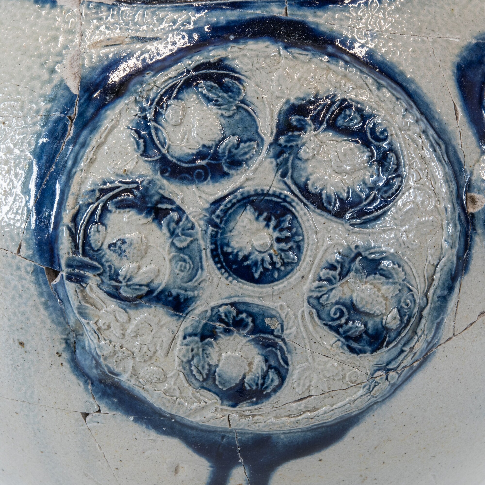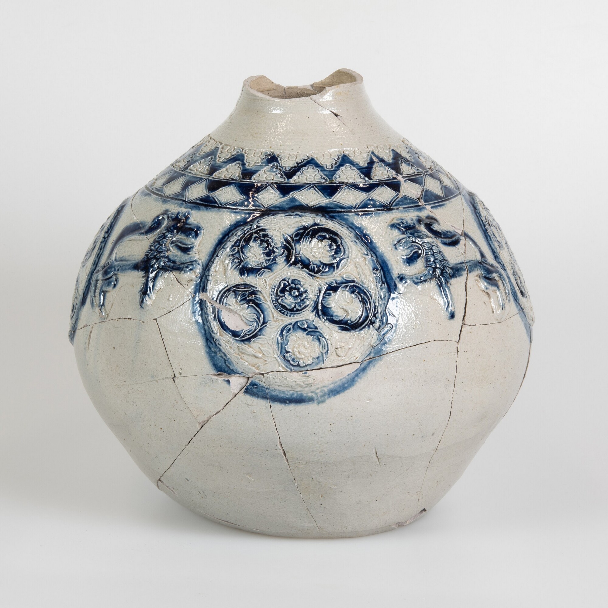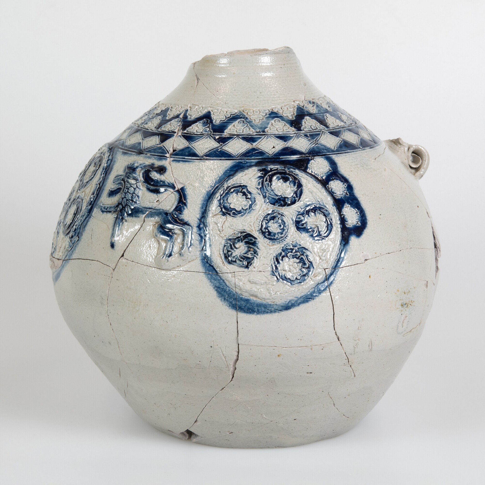 Kan; s2-kan-33; rondbuikige kan met cilindrische hals en rechte rand, standvlak; verticaal lintoor (ontbreekt); steengoed met oppervlaktebehandeling: accenten van kobaltoxide, zoutglazuur; stempels van geometrische en florale motieven op schouder en drie medaillon-appliques met rozen en hop-ranken op buik, middelste medaillon geflankeerd door twee gekroonde leeuwen; herkomst: Westerwald