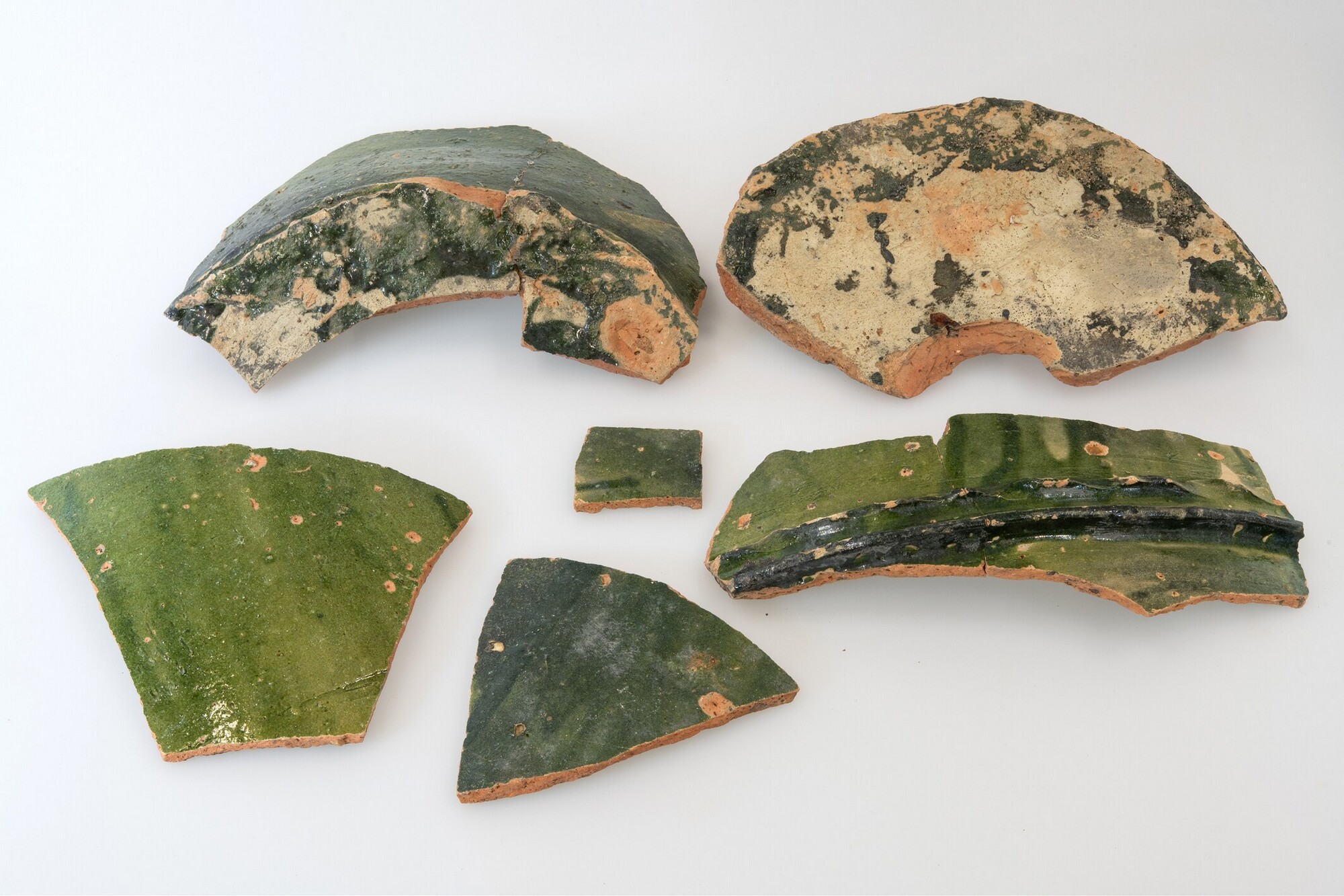 Pot (bodem- en wandfragmenten); ib-pot; standvoet; Mediterraan roodbakkend aardewerk; brede ribbel met geknepen golfrand op buik; loodglazuur met koperoxide; herkomst: mogelijk Tamegroute, Marokko