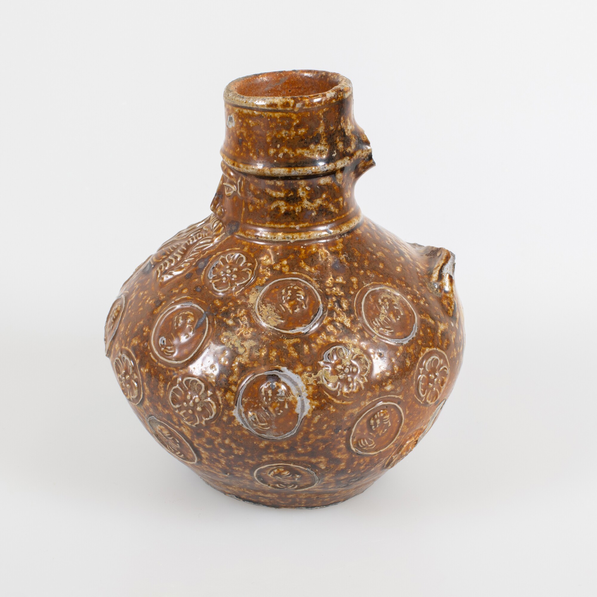 Baardmankruik; s2-kan-13; bolle kan met vrijwel cilindrische hals en hoge kraagrand, ribbel op halsaanzet, standvlak, lintoor (ontbreekt); steengoed met oppervlaktebehandeling: ijzerengobe, zoutglazuur; appliques: baardman op hals en buik bedekt met portretmedaillons en rozetten; herkomst: Duitsland, Keulen of Frechen