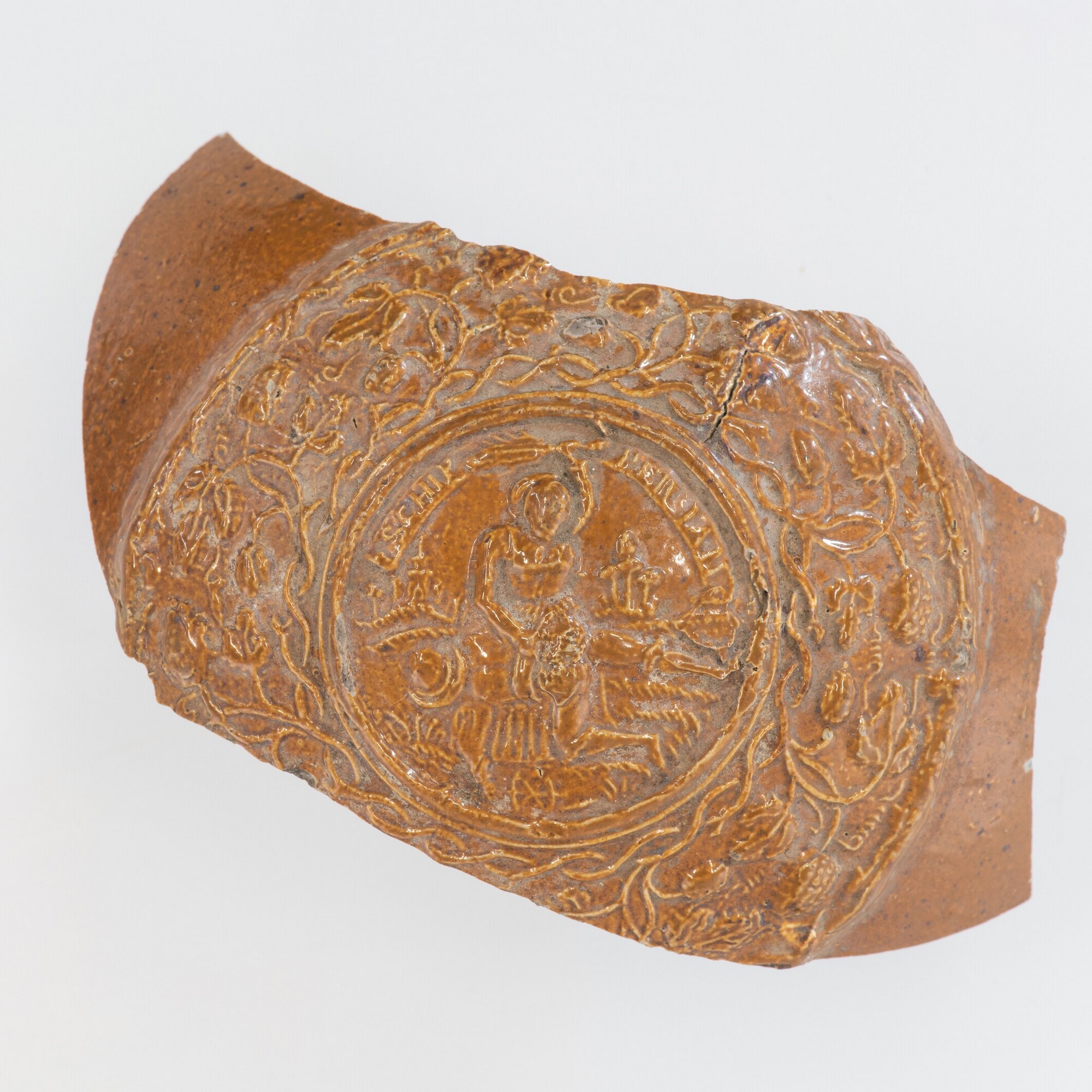 Kan (wandfragment); s2-kan-; steengoed met oppervlaktebehandeling: ijzerengobe, zoutglazuur; medaillonapplique op buik met voorstelling van een vrouw die een man met tak op het achterwerk slaat, daarboven de tekst 'SCHIP PER IAN'; omgeven door hopranken; herkomst: Raeren, Rijnland