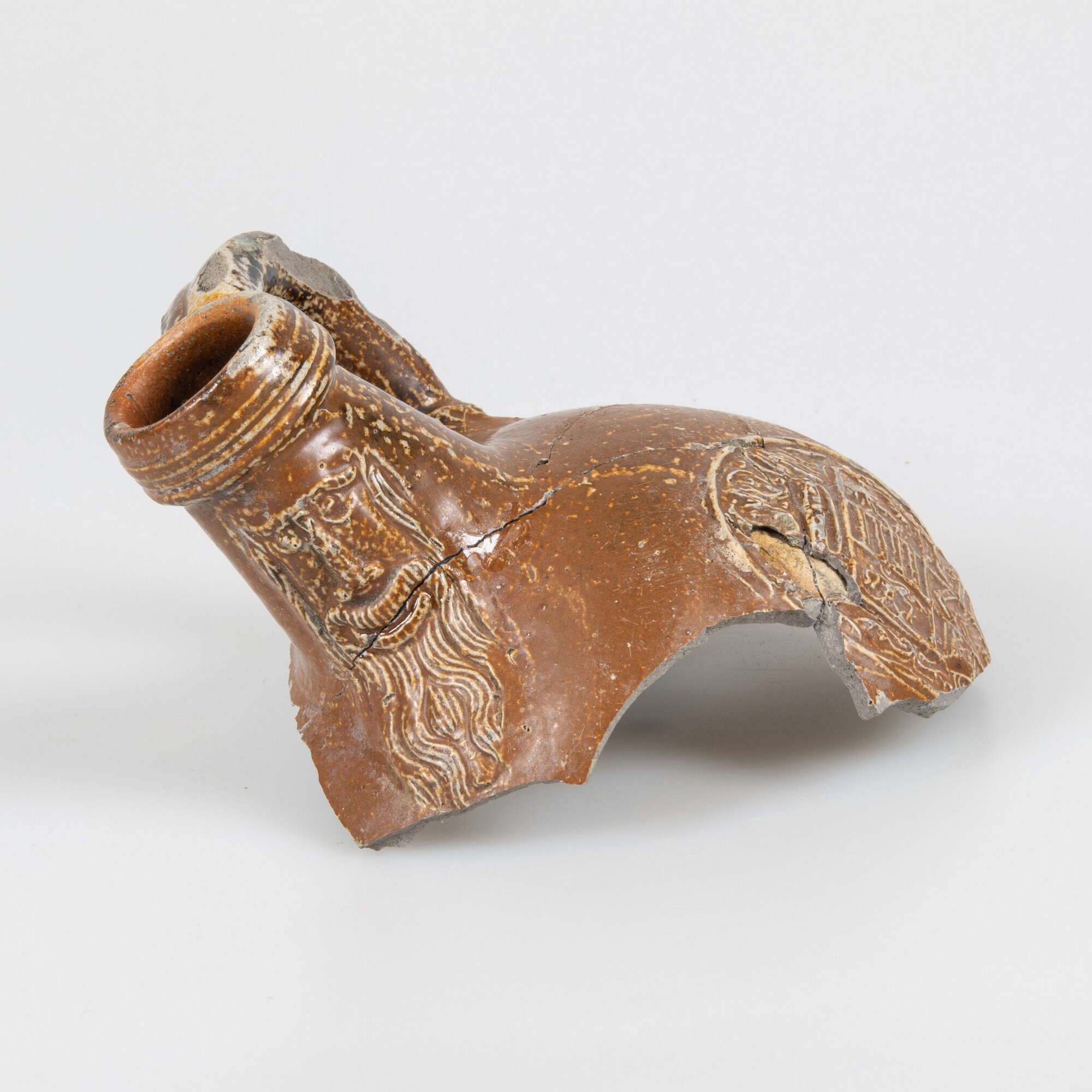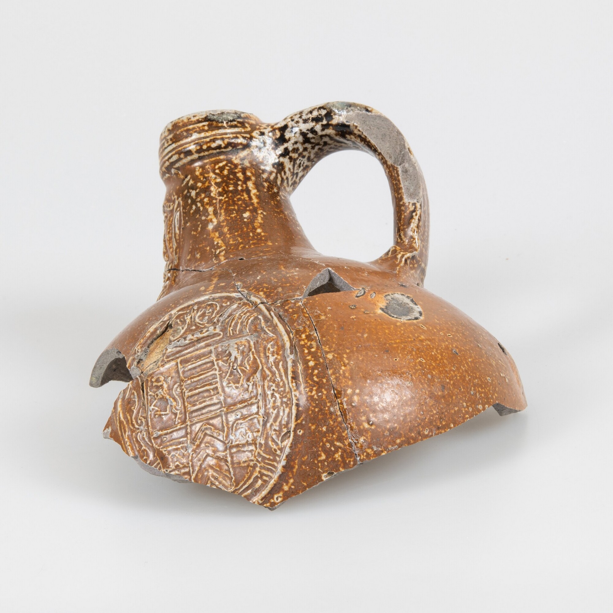 Baardmankruik (randfragment); s2-kan-32; bolle kan met schouder overgaand in hoge hals met geribbelde kraagrand, lintoor; steengoed met oppervlaktebehandeling: ijzerengobe, zoutglazuur; appliques: baardman op hals en medaillon op buik met wapenschild: zes vlakken: twee leeuwen, horizontale balken en chevrons; herkomst: Frechen, Duitsland