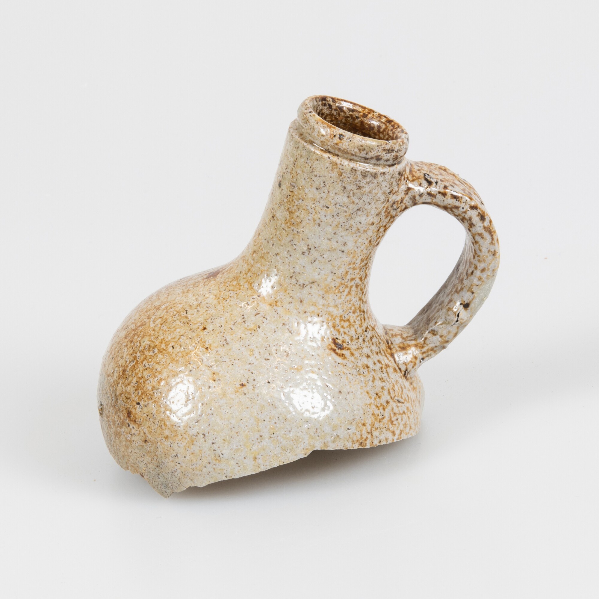 Kan (randfragment); s2-kan-44; kan met bolle buik, hoge cilindrische hals en rechte rand met groef, lintoor; steengoed met oppervlaktebehandeling: ijzerengobe, zoutglazuur; herkomst: Frechen, Duitsland
