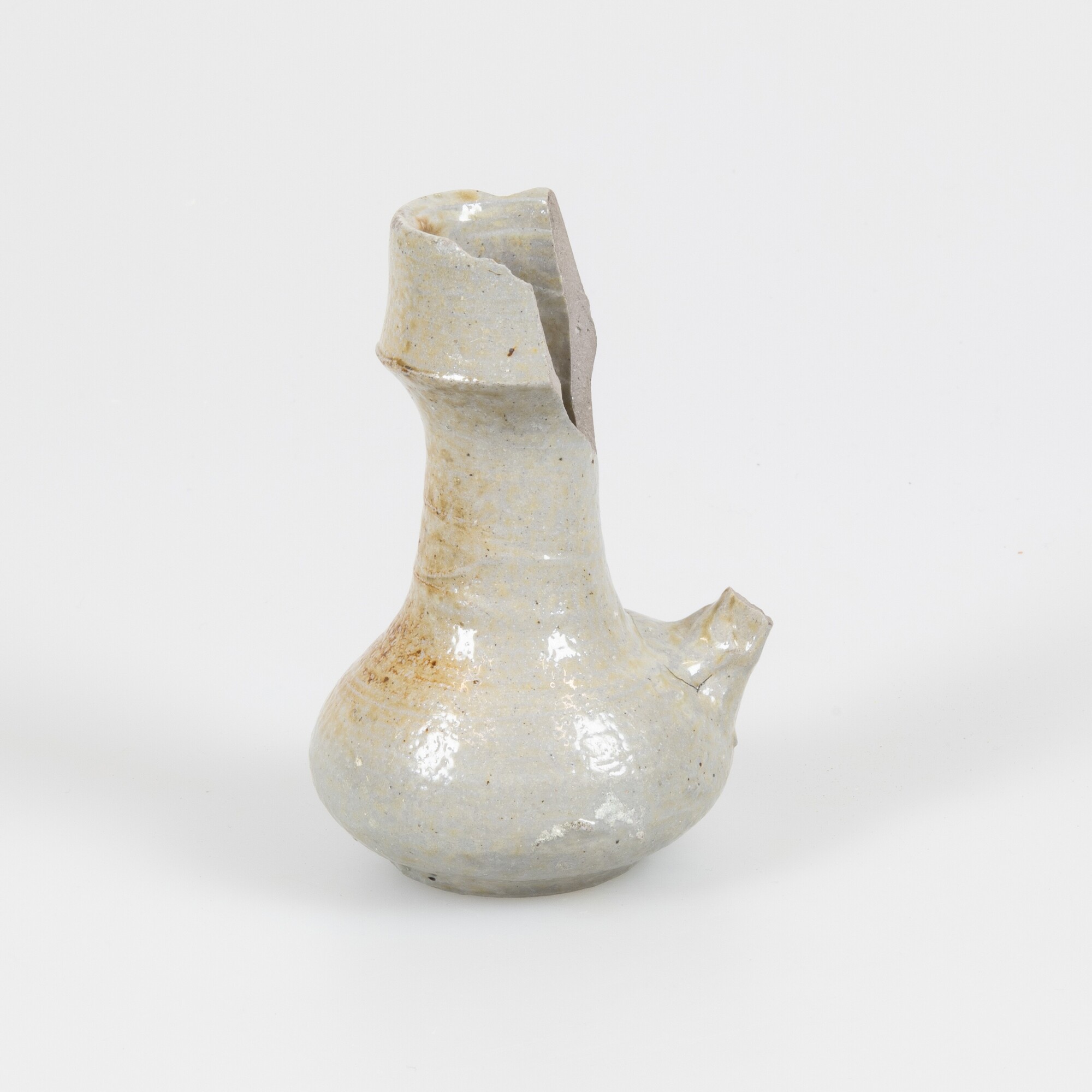 Kan; s2-kan-14; kleine bolle kan met schouder overgaand in hals, kraagrand, standvlak, verticaal lintoor (ontbreekt); steengoed met oppervlaktebehandeling: ijzerengobe, zoutglazuur; herkomst: Raeren, Rijnland