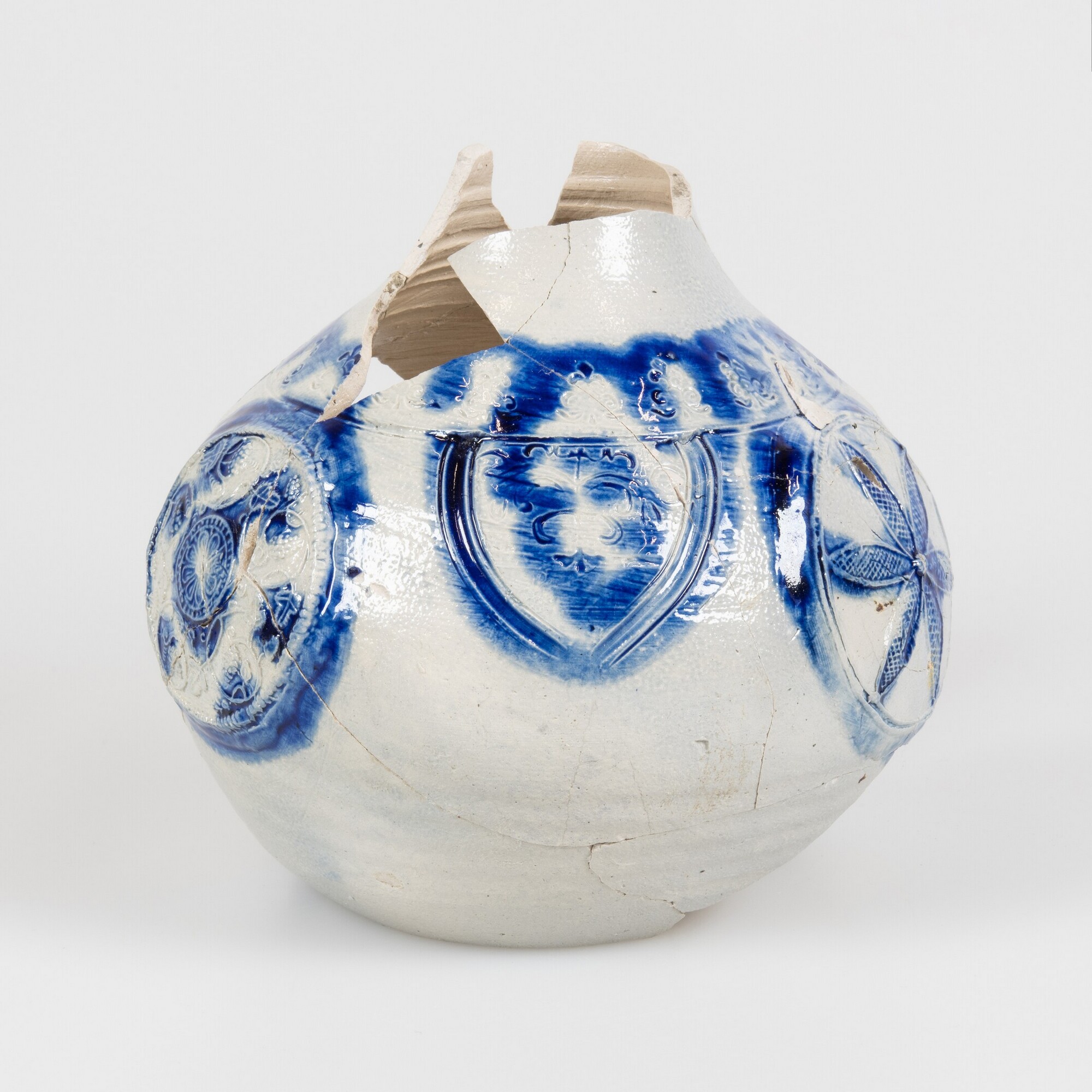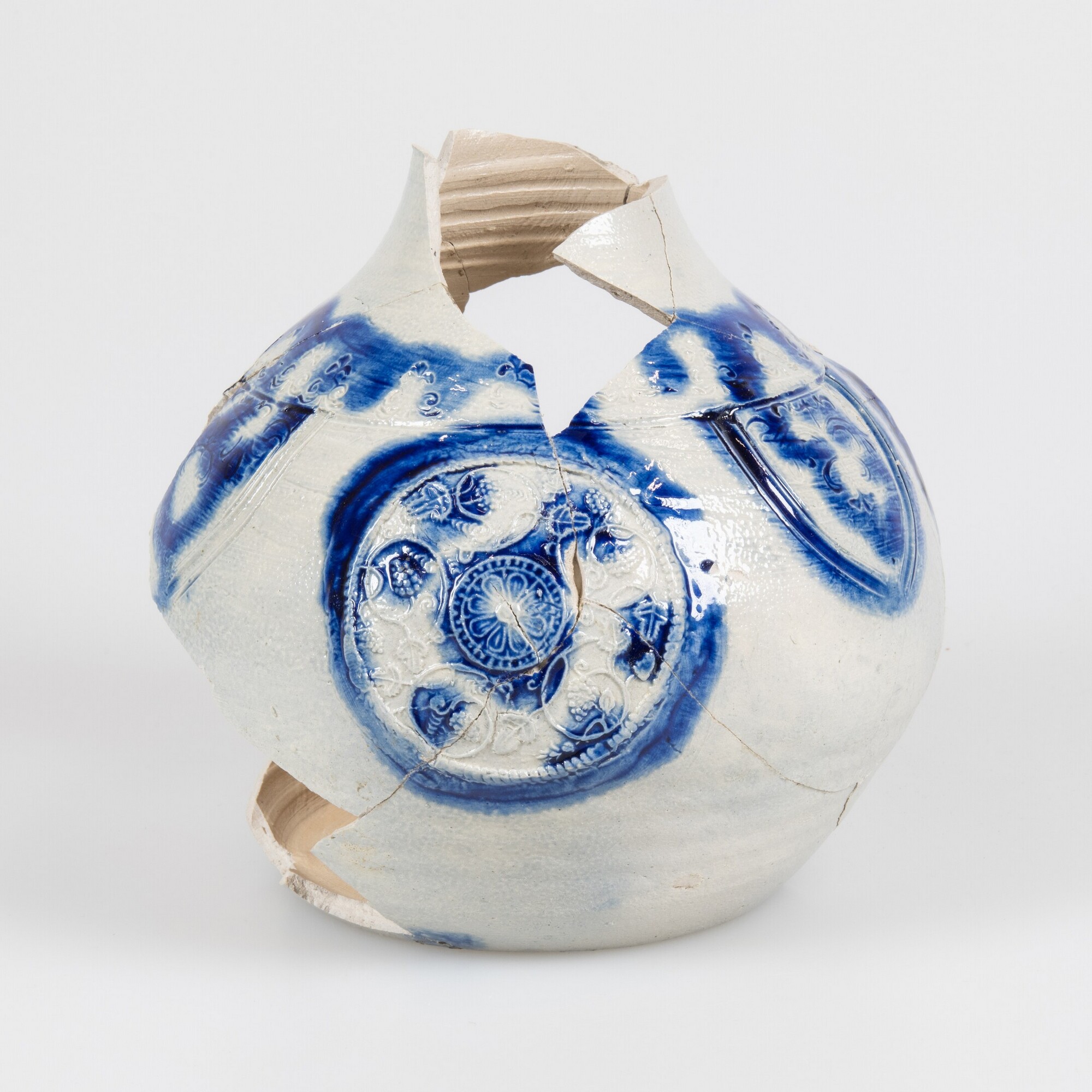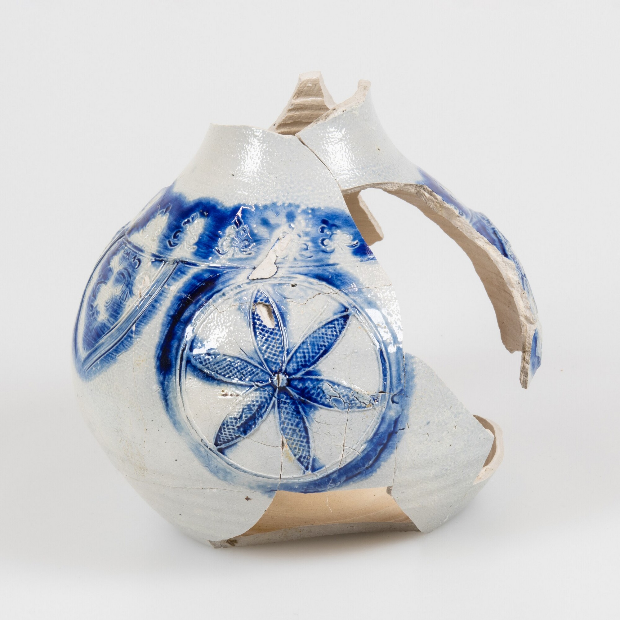Kan; s2-kan-33; rondbuikige kan met cilindrische hals en rechte rand, standvlak; verticaal lintoor (ontbreekt); steengoed met oppervlaktebehandeling: accenten van kobaltoxide, zoutglazuur; stempels van florale motieven op schouder, twee medaillonappliques met hop-ranken en een medaillonapplique met stermotief op buik; herkomst: Westerwald