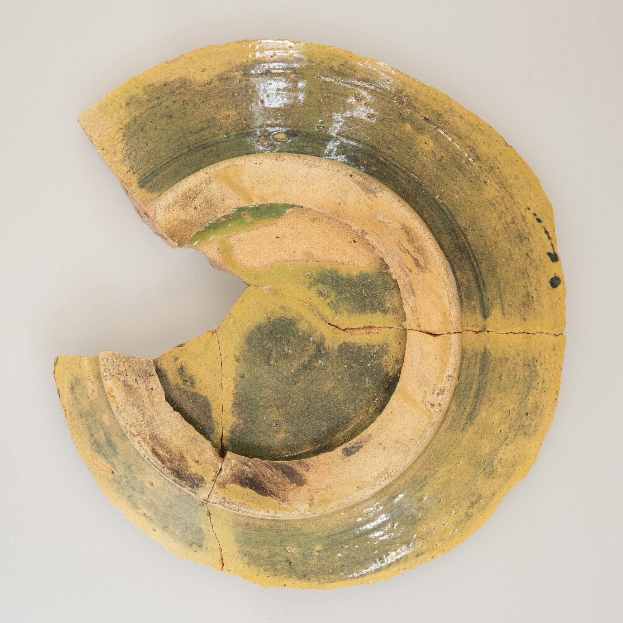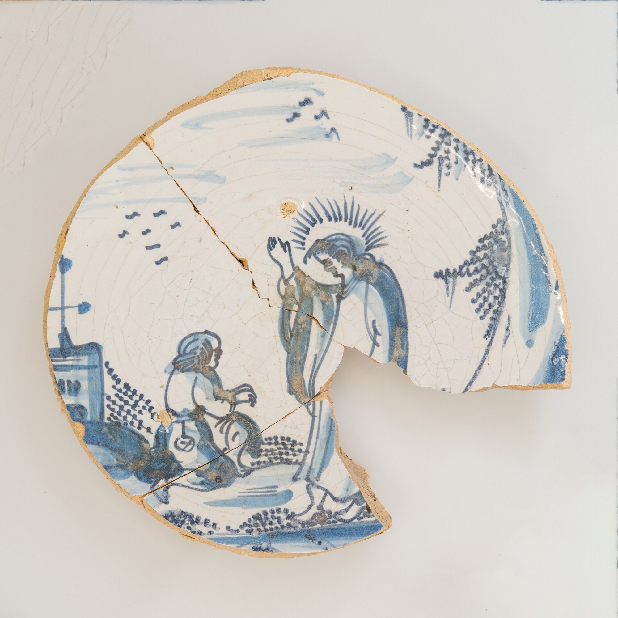 Bord (bodemfragment); m-bor-; standring; majolica; inwendig tinglazuur, uitwendig loodglazuur; blauwe beschildering: spiegel: Bijbelse voorstelling; vermoedelijk Christus die een blinde geneest; herkomst: Friesland