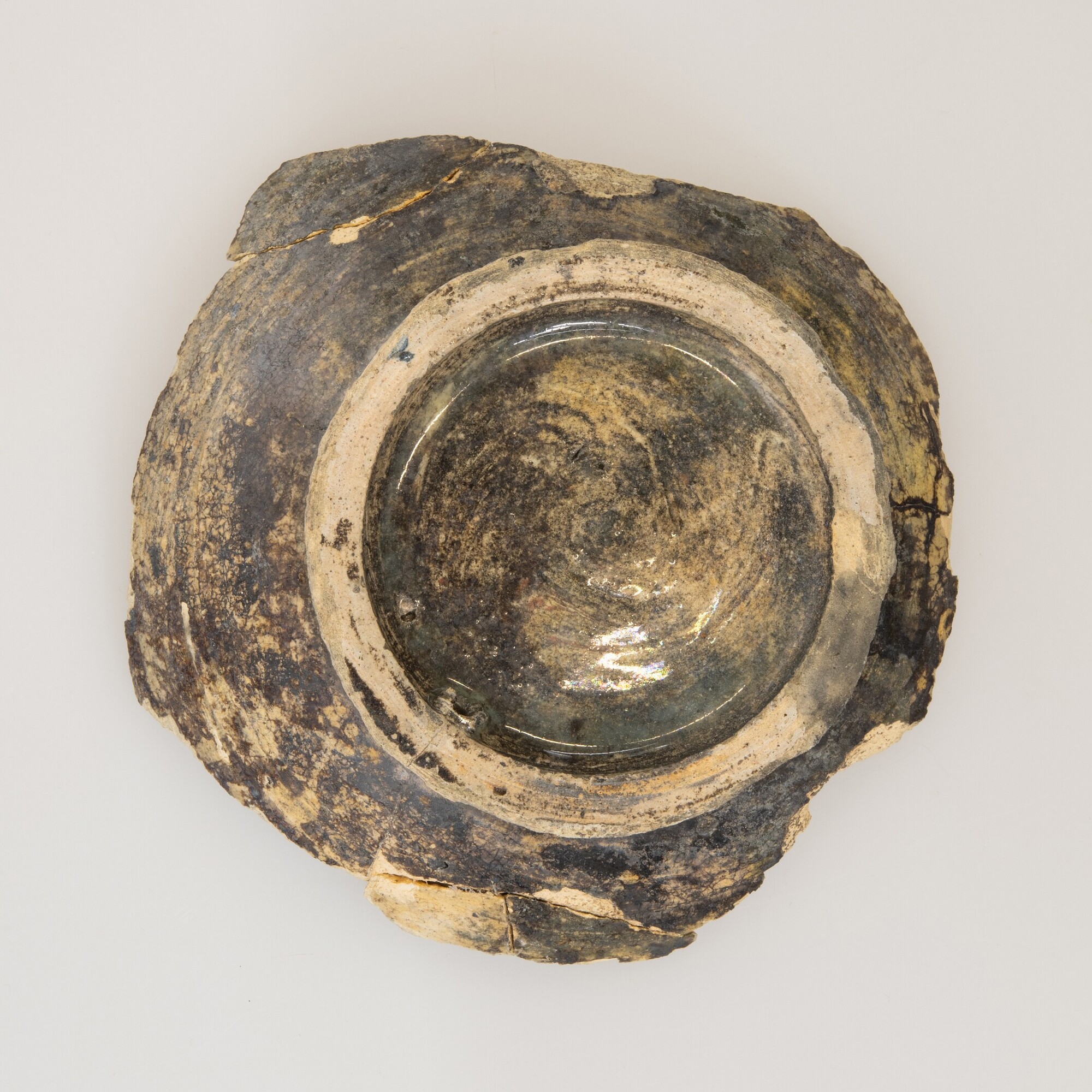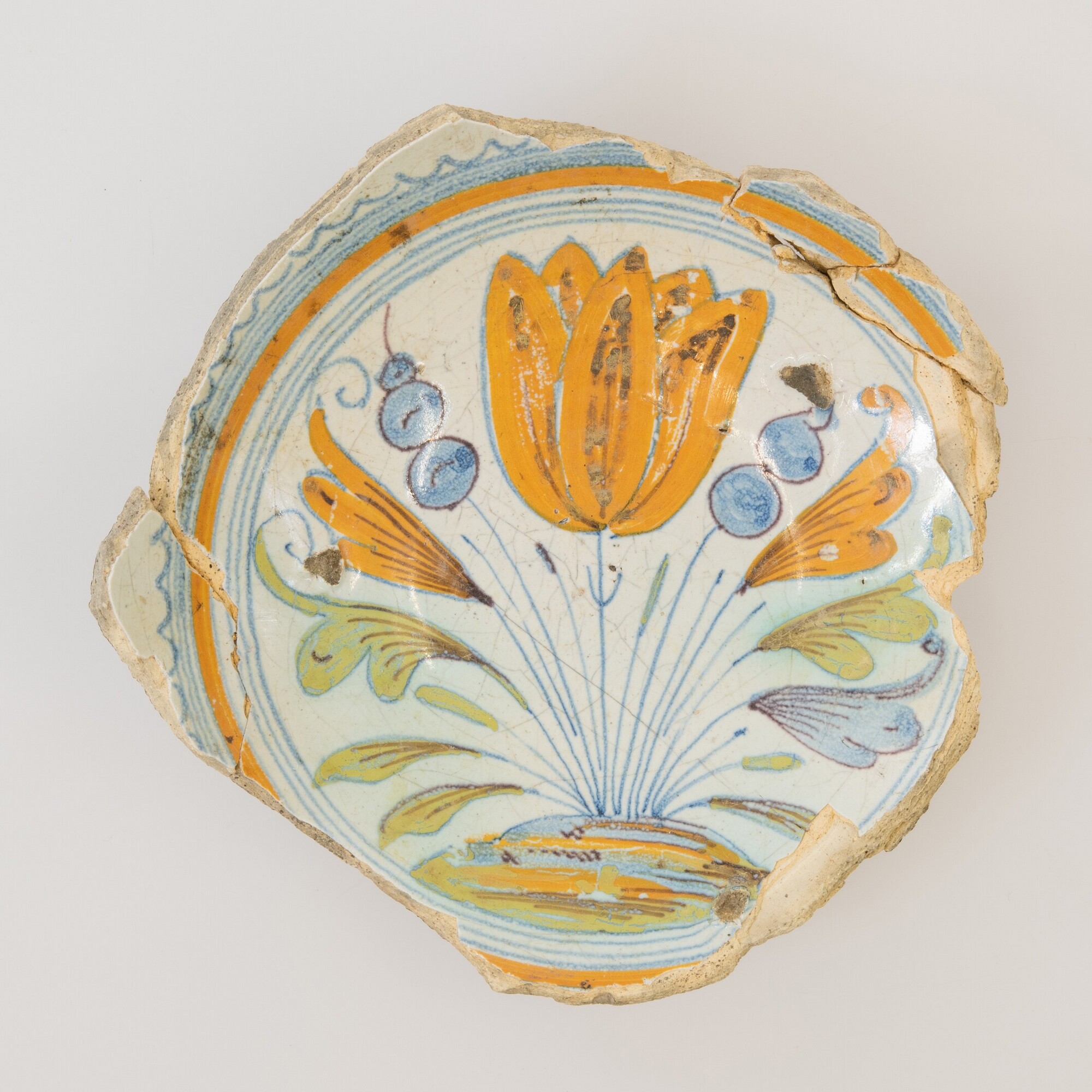 Kom (bodemfragment); m-kom-; standring; majolica; inwendig tinglazuur, uitwendig loodglazuur; polychrome beschildering: spiegel: tulp binnen concentrische cirkels en kartelrand; herkomst: West-Nederland