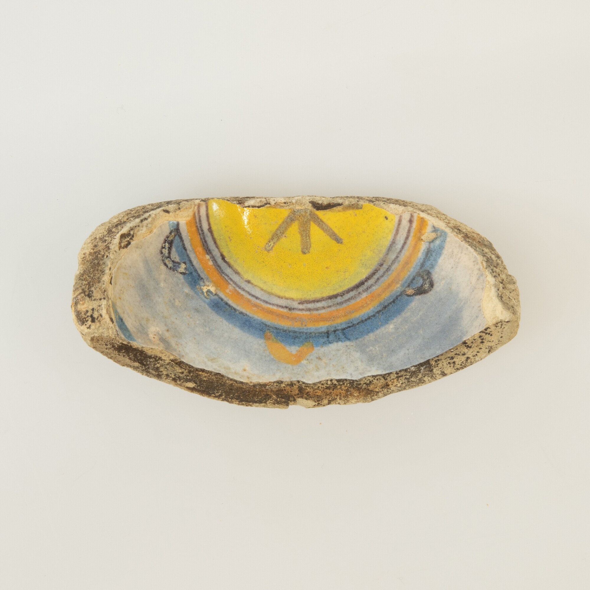 Kom (bodemfragment); i-kom-; standvlak; Italiaans tinglazuuraardewerk (majolica); tinglazuur; inwendig polychrome beschildering: cirkels in blauw-oranje-paars rondom geel vlak met paars/bruine ster; herkomst: Montelupo, Italië