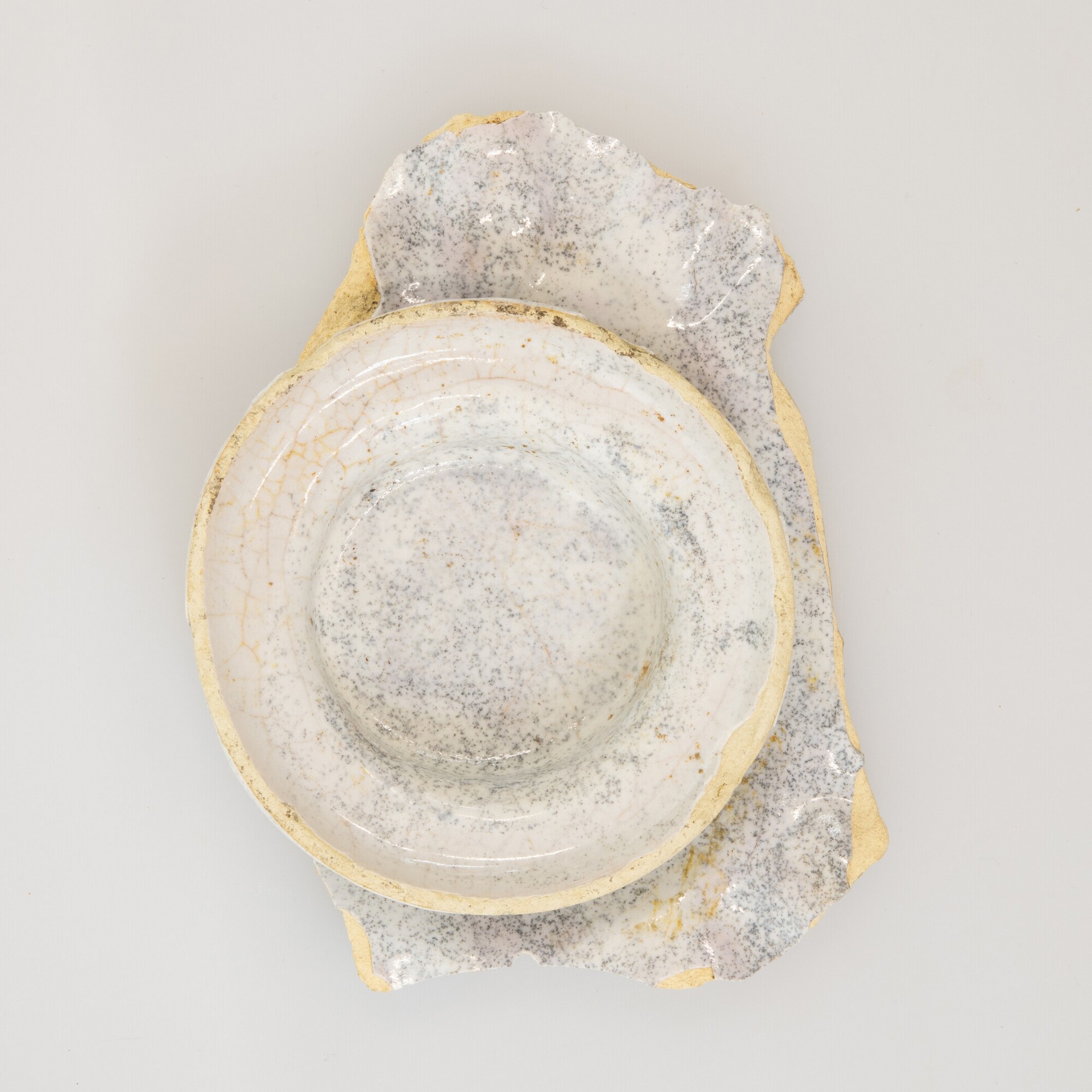Plooischotel (bodemfragment); i-plo-; standring; Italiaans tinglazuuraardewerk (faience; Compendiario); tinglazuur; beschildering in blauw en geel: inwendig: staande putto; herkomst: Ligurië, Italië
