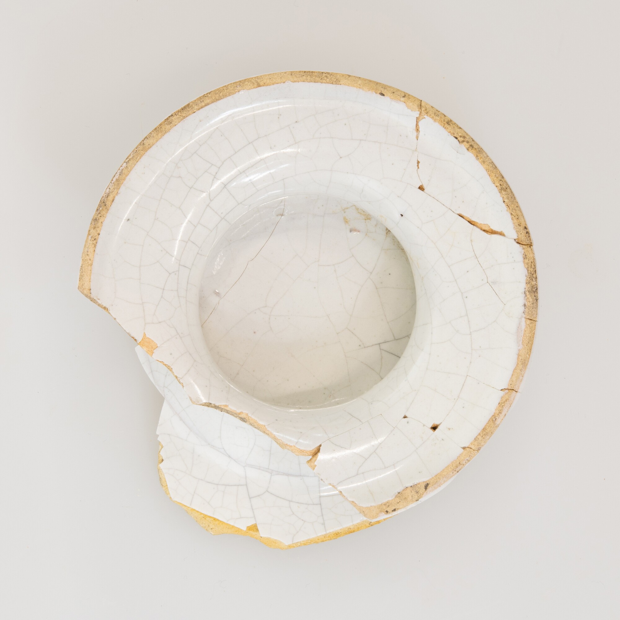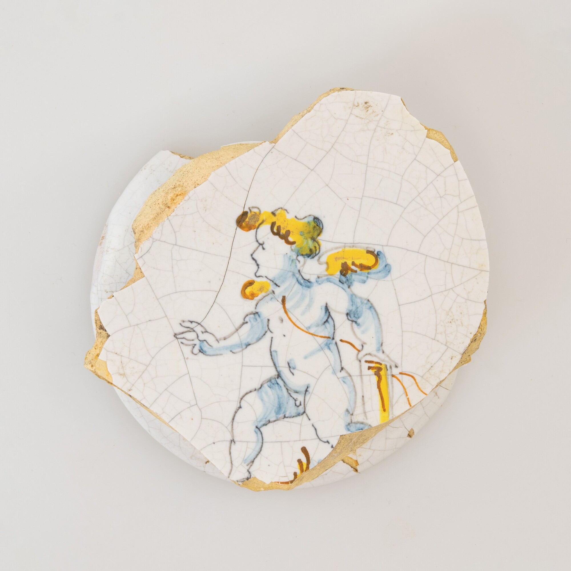 Plooischotel (bodemfragment); i-plo-; standring; Italiaans tinglazuuraardewerk (faience; Compendiario); tinglazuur; polychrome beschildering: inwendig: lopende putto; herkomst: Faenza?, Italië
