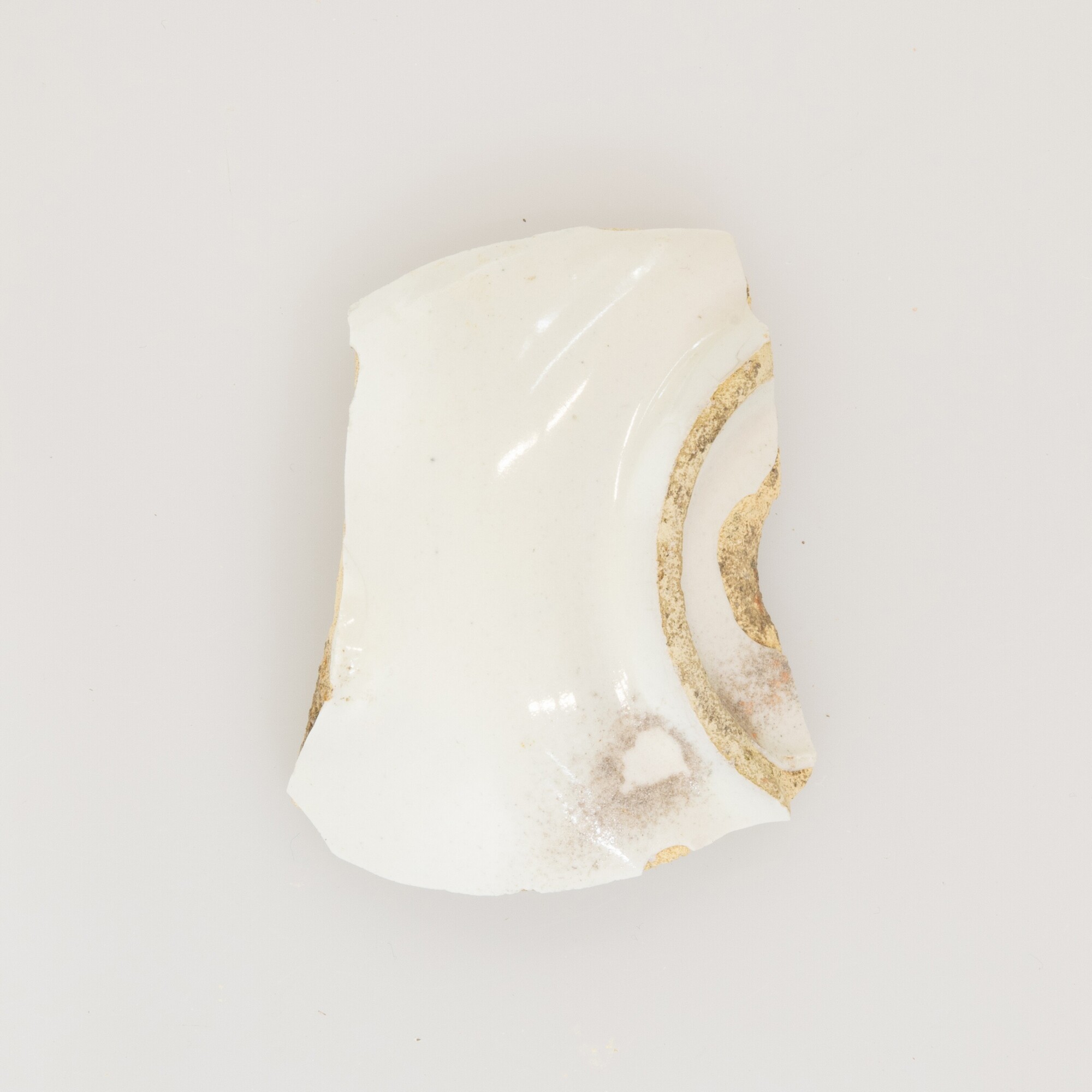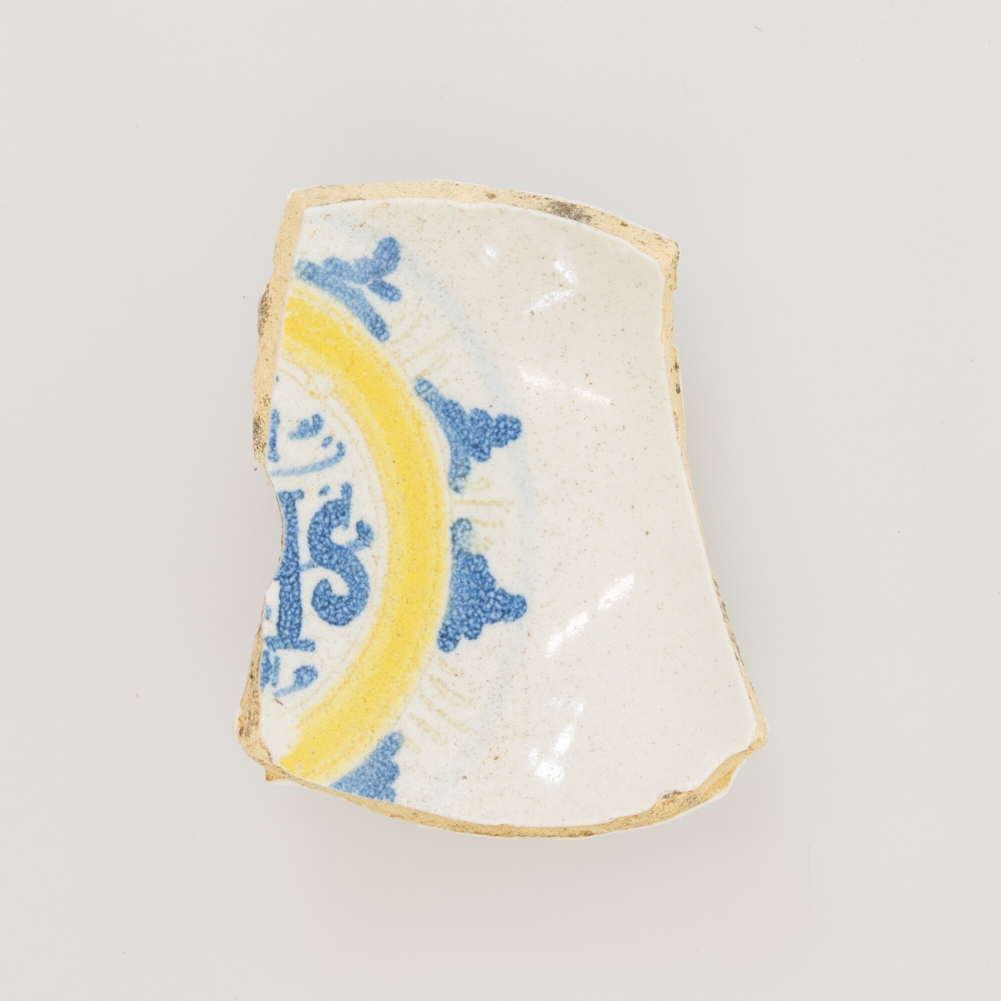 Kom (bodemfragment); i-kom-; standring; aanzet vormoor; Italiaans tinglazuuraardewerk (faience; Compendiario); tinglazuur; polychrome beschildering: inwendig: IHS-monogram binnen cirkel en stermotief; herkomst: Ligurië, Italië