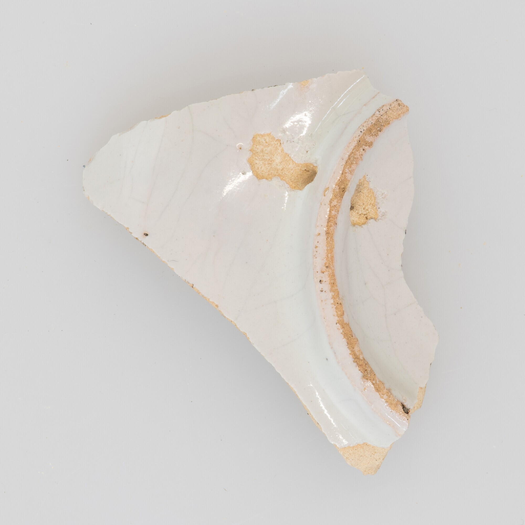 Kom (bodemfragment); i-kom-; standring; Italiaans tinglazuuraardewerk (faience; Compendiario); tinglazuur; polychrome beschildering: inwendig: portret van heilige met tonsuur en aureool (mogelijk St. Franciscus); secundair doorboorde standring; herkomst: Italië