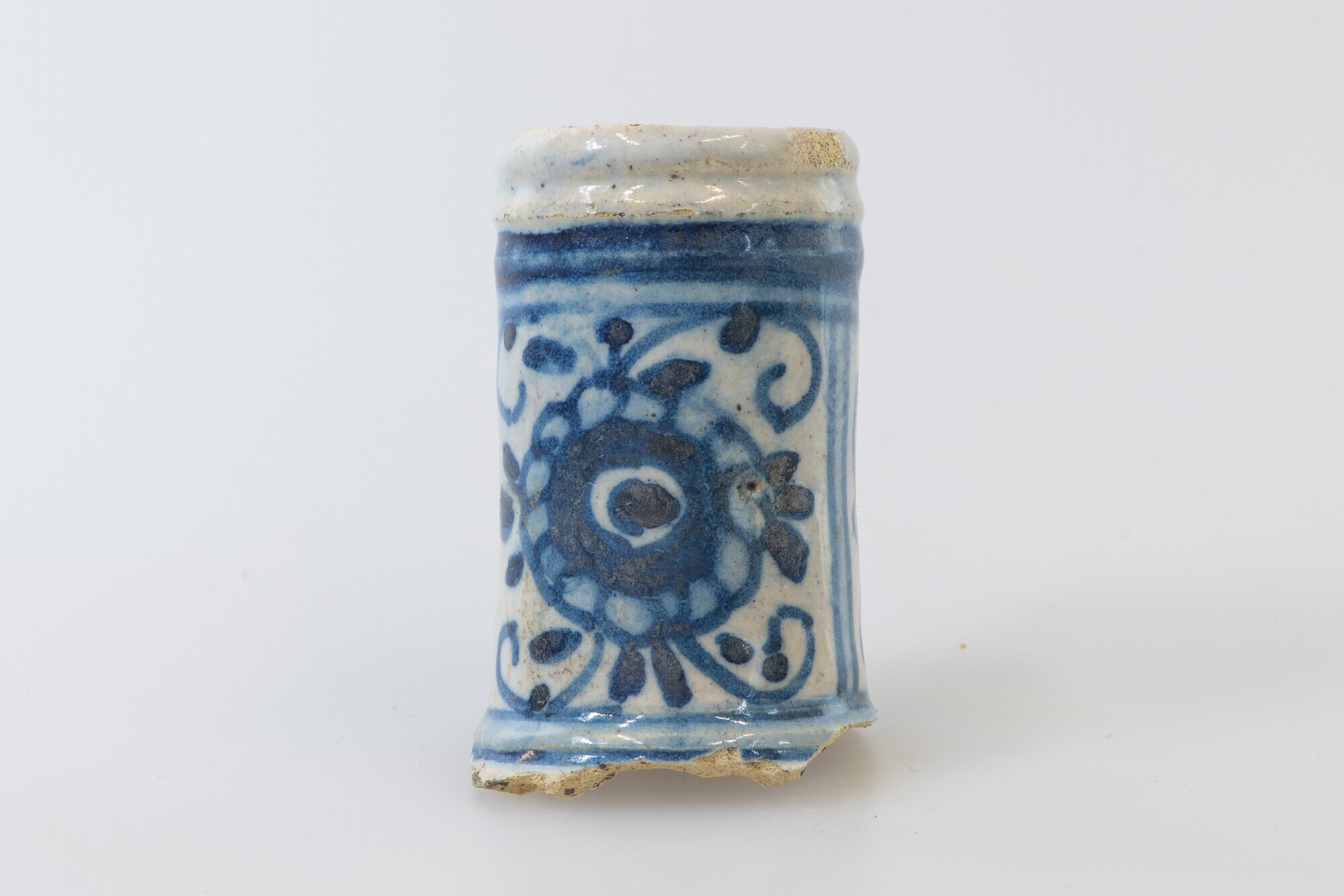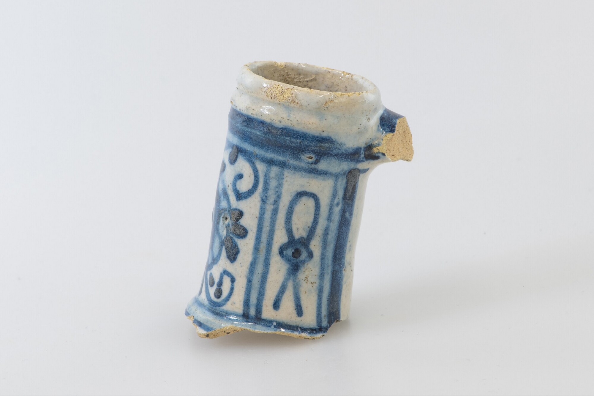 Kan (randfragment); po-kan- ; smalle cilindrische hals met geribbelde rand, lintoor (ontbreekt); Portugese faience; tinglazuur; blauwe beschildering: panelen met florale en geometrische motieven (imitatie kraakporselein): herkomst: Portugal