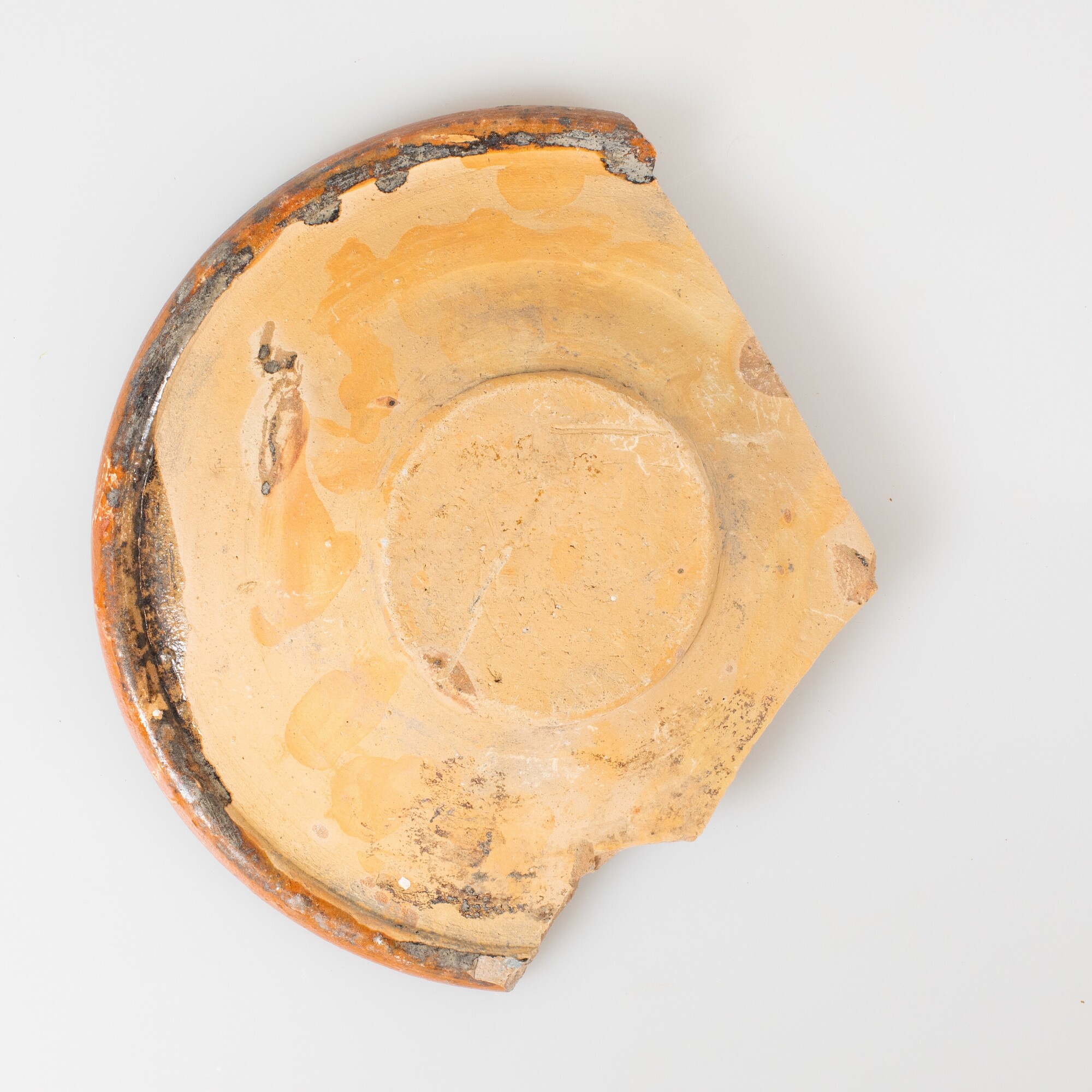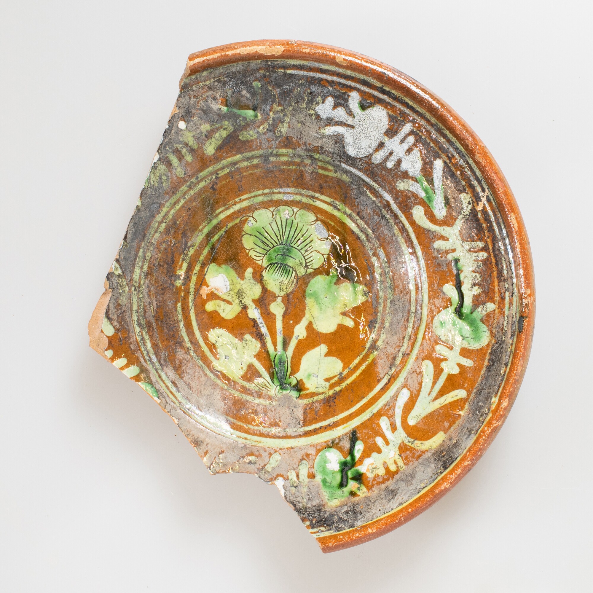 Bord; wa-bor-1; conisch bord met smalle afgeronde kraagrand, standvlak; Werra-aardewerk; inwendig loodglazuur; slibversiering: witte kleislib met accenten van koperoxide, sgraffito-techniek, spiegel: bloem (anjer) binnen concentrische cirkels; vlag: bladertakken en concentrische cirkels; herkomst: vermoedelijk Enkhuizen, product van Dirck Claesz Spiegel
