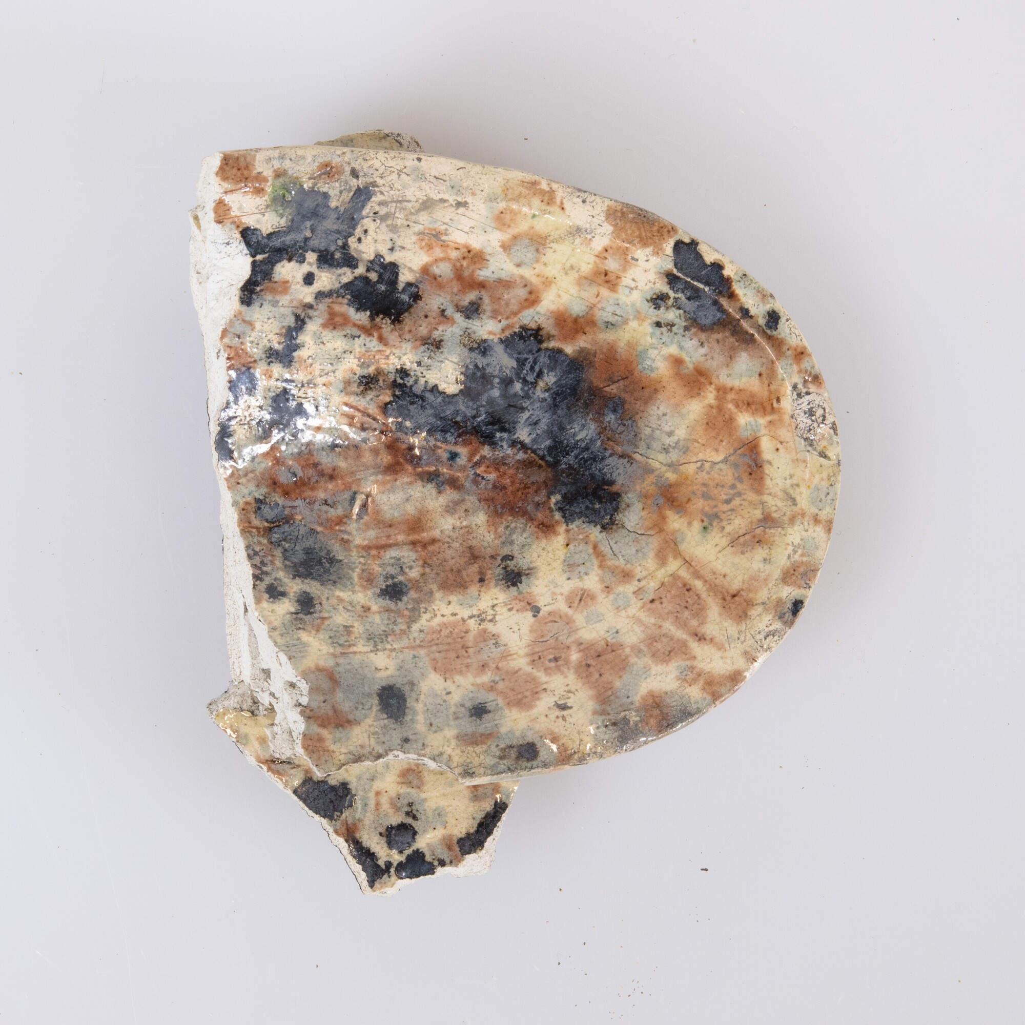 Schaal (bodemfragment); wf-sch-; ovale standvoet; Frans witbakkend aardewerk (Pallisy-ware); loodglazuur met polychrome accenten; spiegel: bijbelse voorstelling in reliëf: Abraham met geheven zwaard; herkomst: Saintonge, Frankrijk