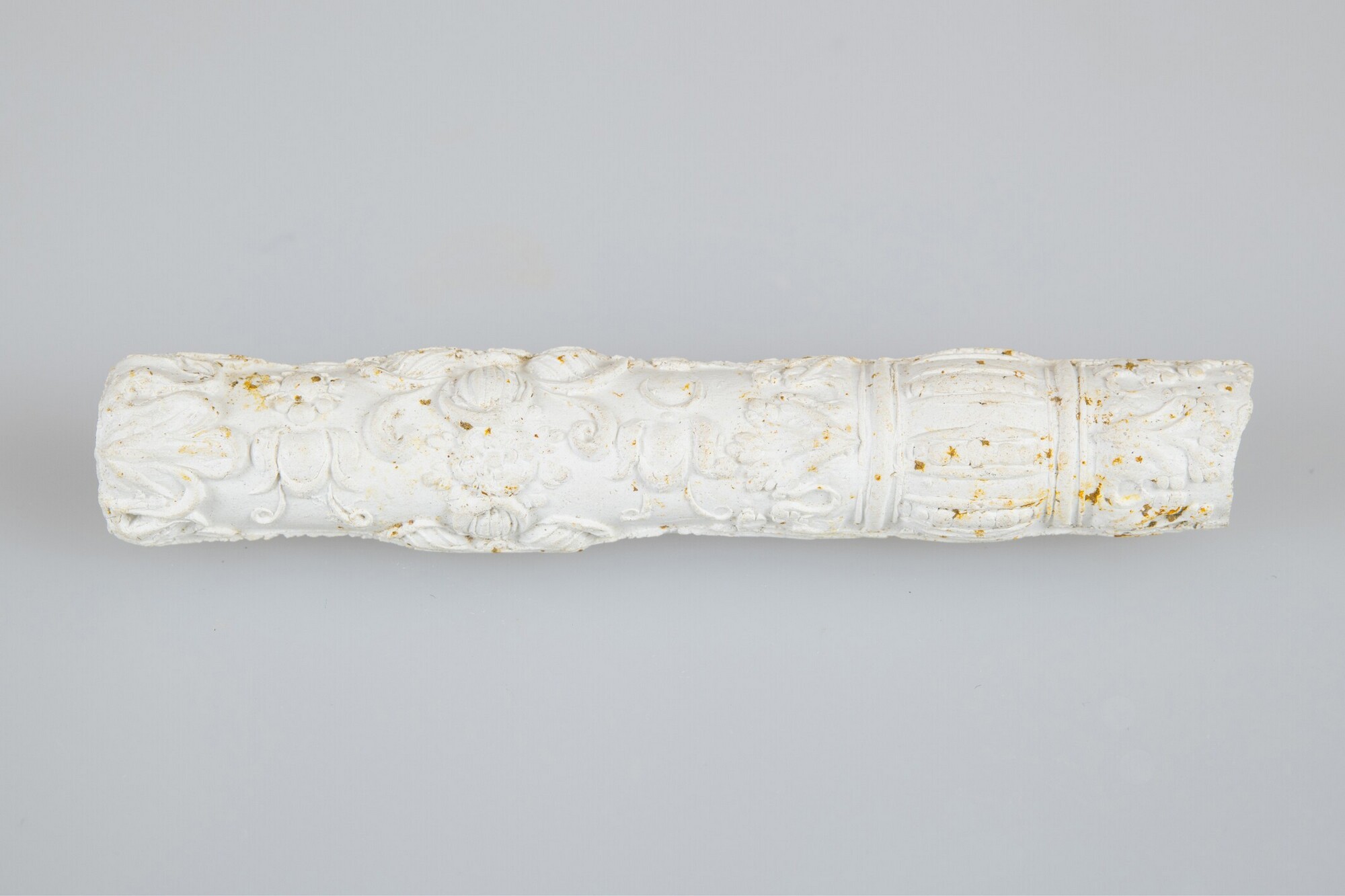 Pijp (steelfragment); ongeglaasd; reliëfversiering op de steel: florale motieven; herkomst: Enkhuizen; pijpenmaker: Jacob Pietersen