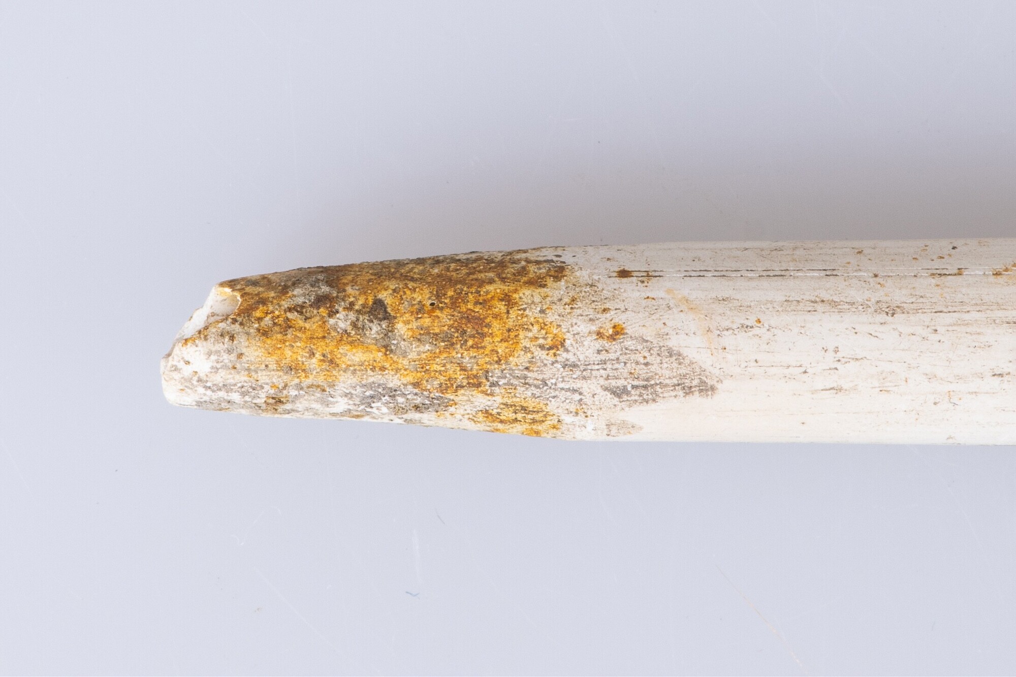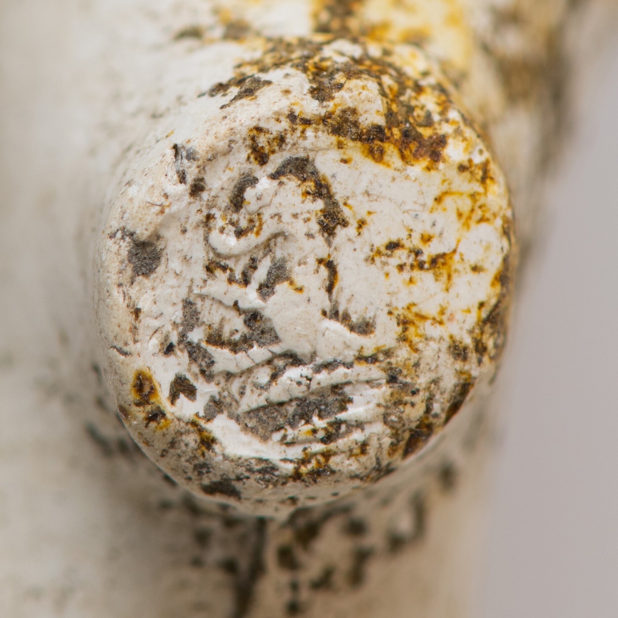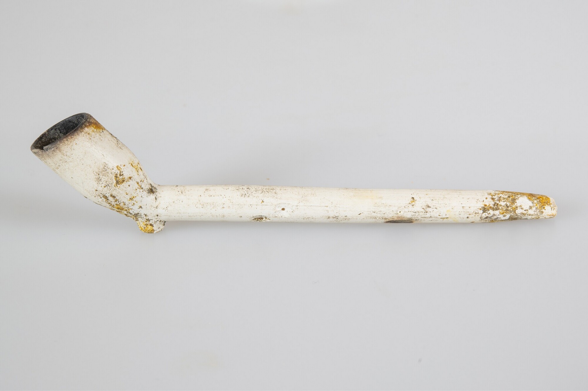 Pijp; trechtervormige ketel; geglaasd; ketel gebotterd; gehele radering rondom ketelopening; hielmerk: wapen van Zeeland; steel secundair bijgeschaafd en aangepunt aan het mondeinde; herkomst: Gouda; pijpenmaker: Gijsbert Aelbertsz Meeringh