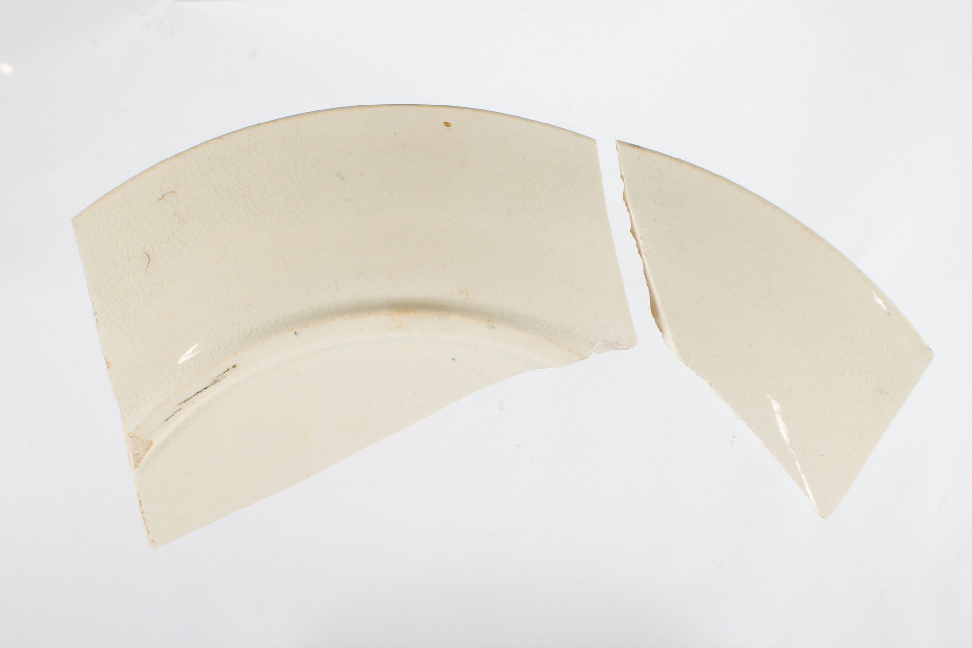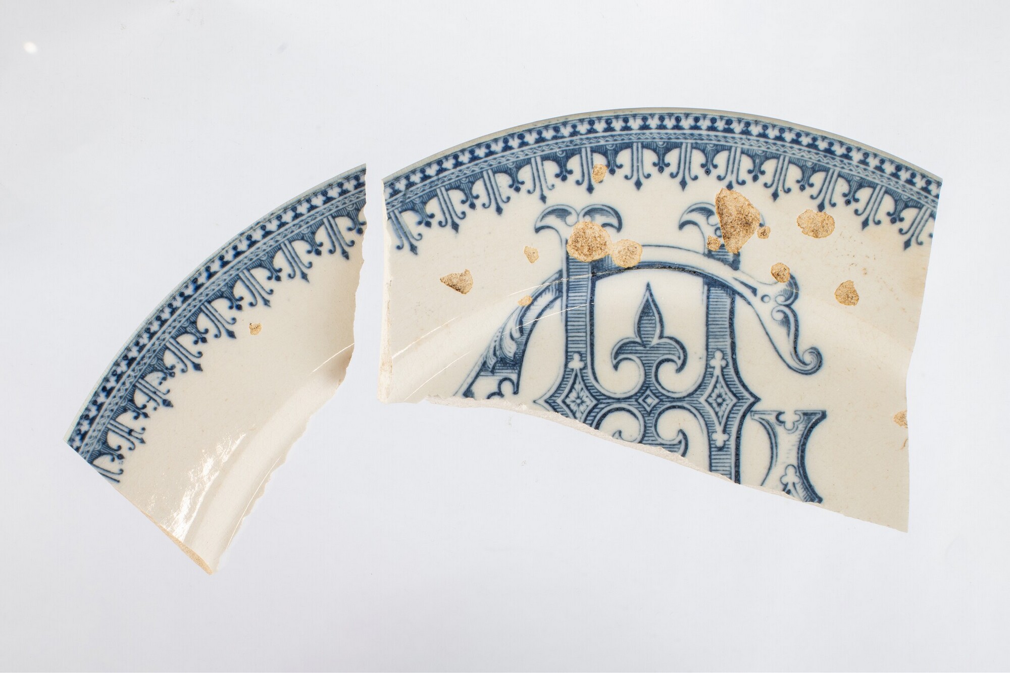 Bord (fragmenten); iw-bor-8; bord met brede, schuin opstaande vlag, lage standring; industrieel wit aardewerk (witgoed / transferware); loodglazuur; inwendig onderglazuur blauw drukdecor: spiegel: monogram 'HG' in gotisch schrift, vlag: sierlijst met bladwerk en lelie-motieven langs rand; herkomst: West-Europa, vermoedelijk Villeroy & Boch of Sarreguemines; vindplaats: ten noordwesten van jachtopzienerswoning 'Kijk Uit'.
