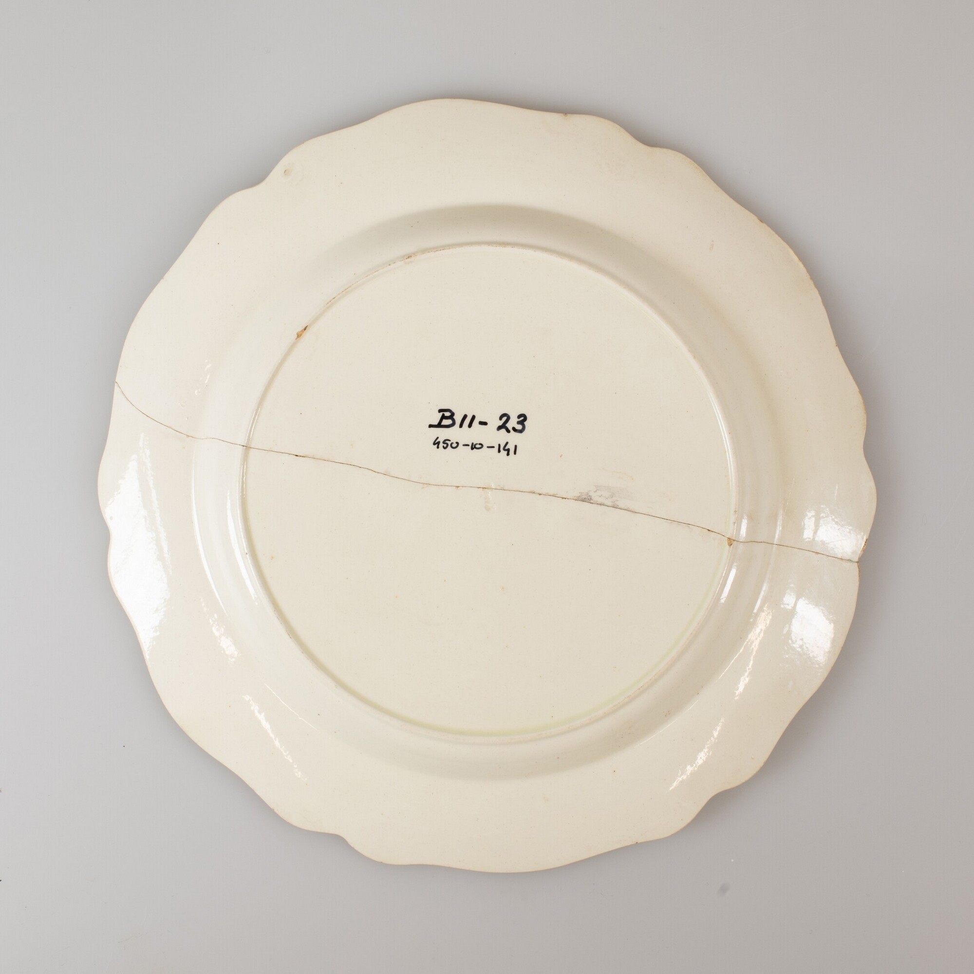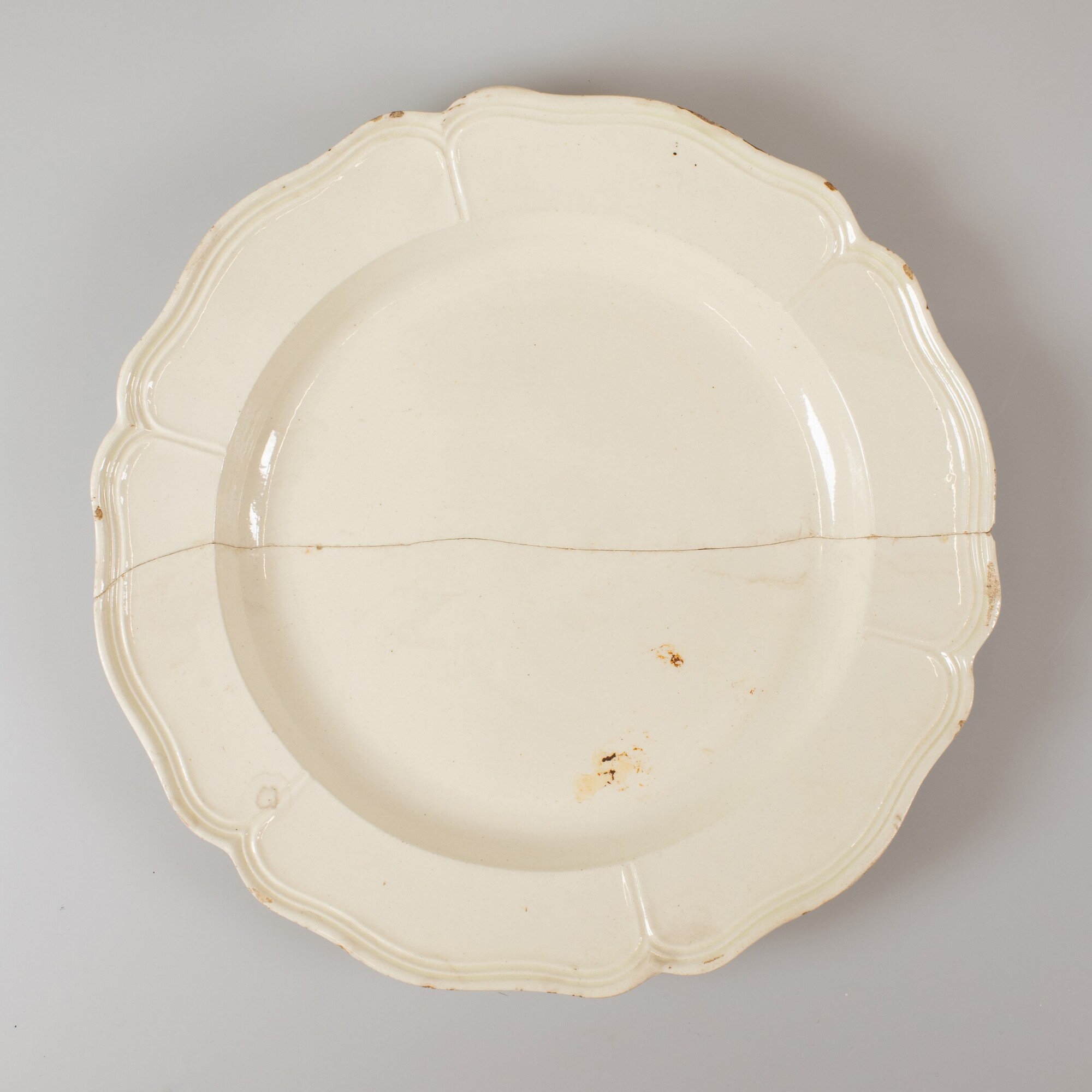 Bord; iw-bor-11; ondiep bord, knik van spiegel naar vlag, standring; industrieel wit aardewerk (creamware); loodglazuur; geperste accoladerand; herkomst: Hanley, Staffordshire, Engeland, product van Joshua Heath (in bedrijf tussen ca. 1770-1800)