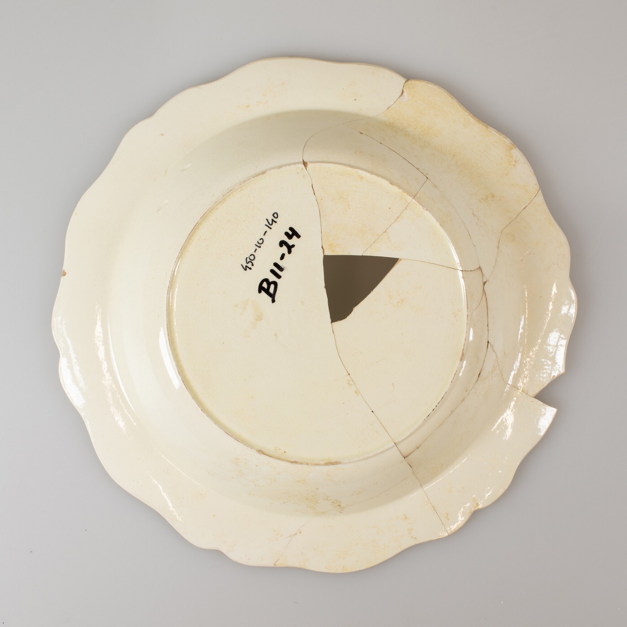Bord; soepbord; iw-bor-2; diep bord met naar buiten geknikte platte vlag, standring; industrieel wit aardewerk (creamware); loodglazuur; geperste accoladerand; herkomst: Engeland