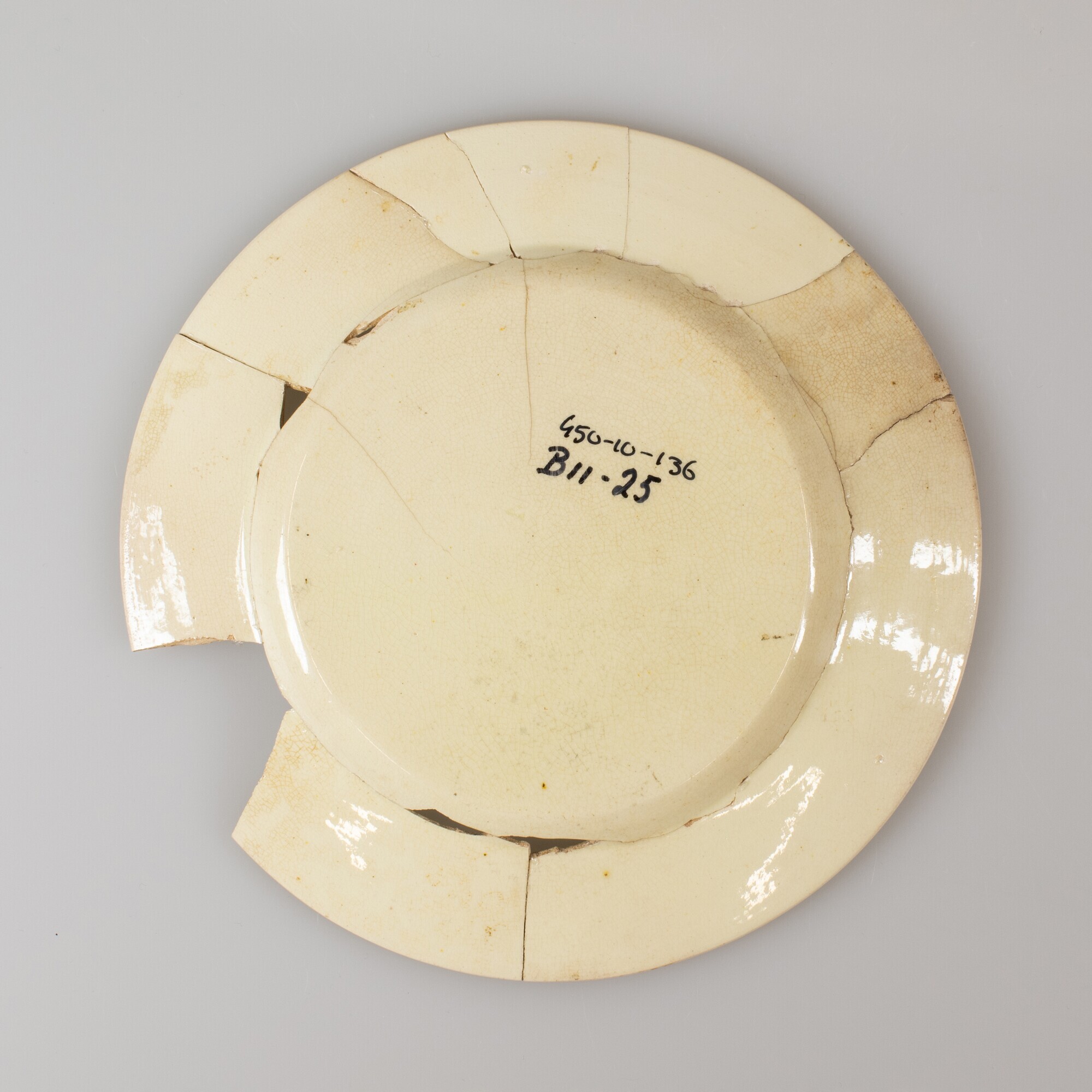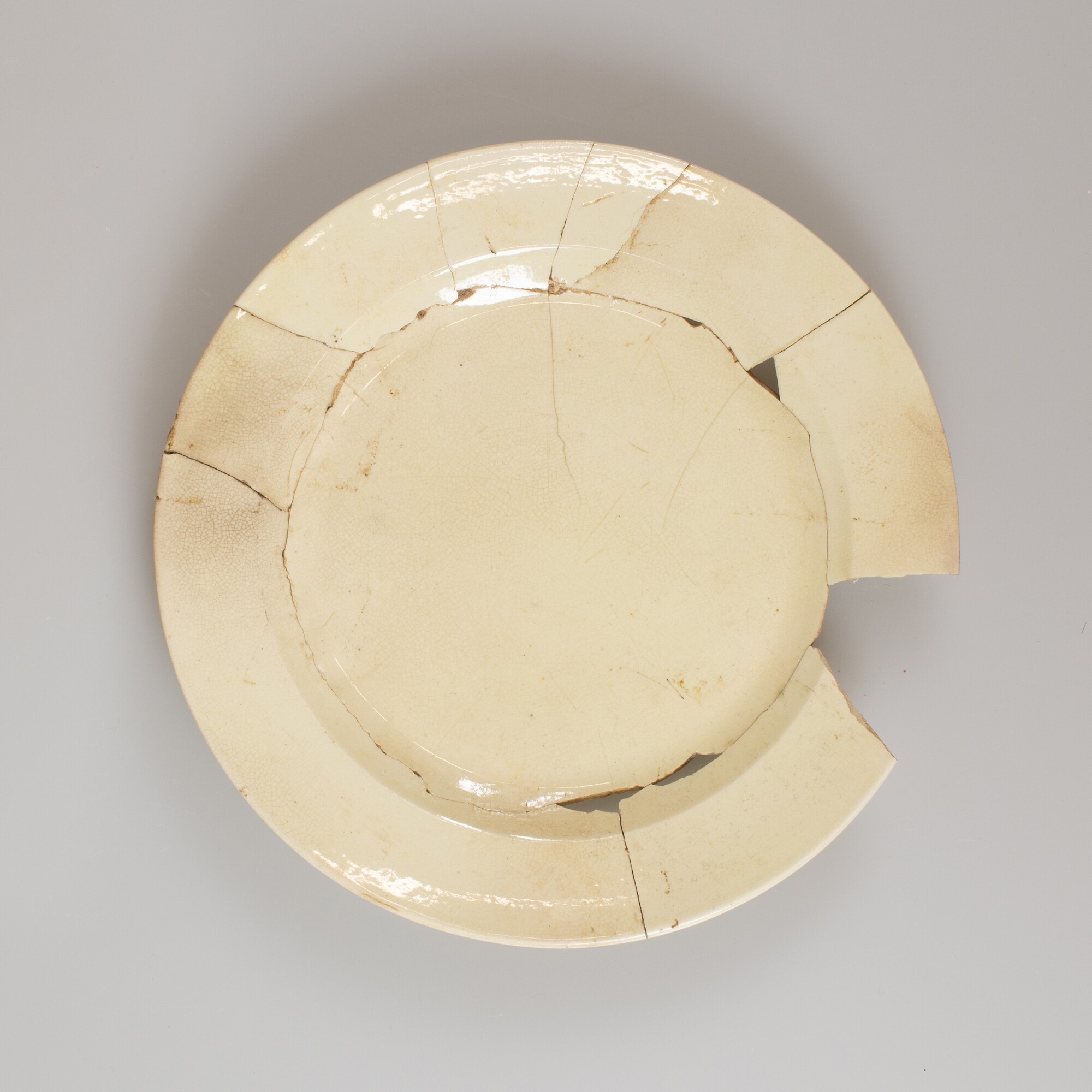 Bord; iw-bor-4; bord met naar buiten geknikte vlag, standvlak; industrieel wit aardewerk (creamware); loodglazuur; herkomst: Engeland