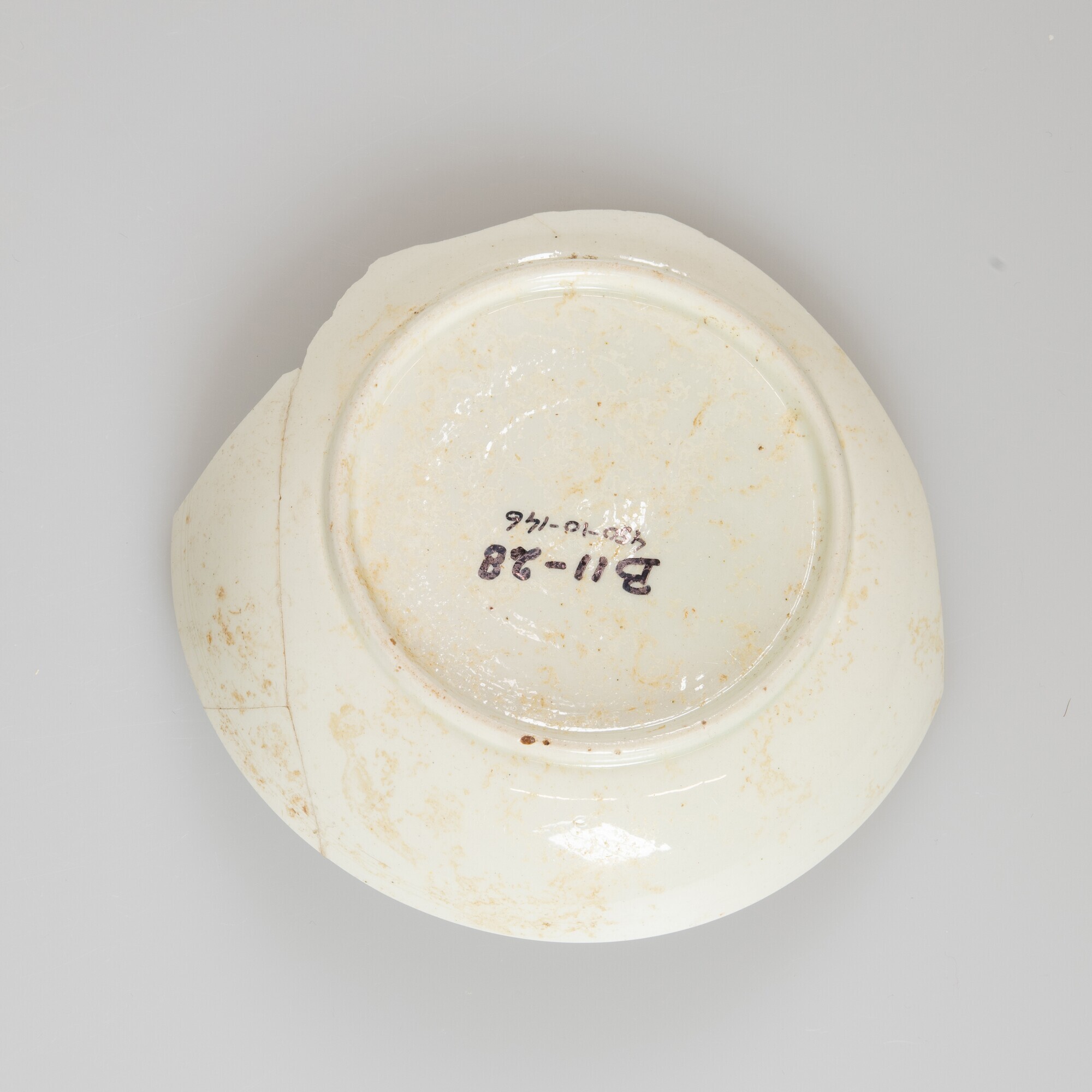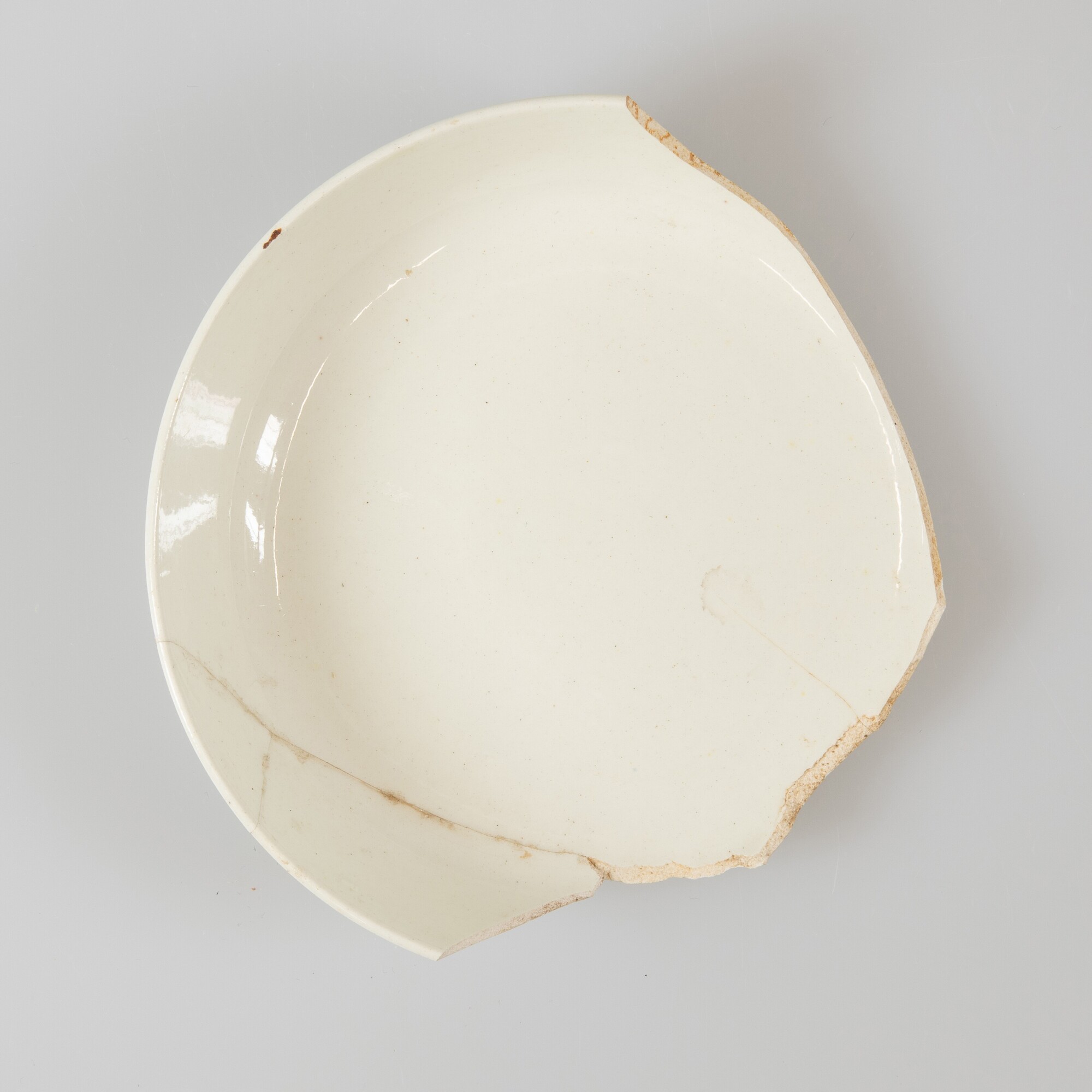 Schotel; iw-bor-3; afgerond bord zonder vlag, standring; industrieel wit aardewerk (creamware); loodglazuur; herkomst: Engeland