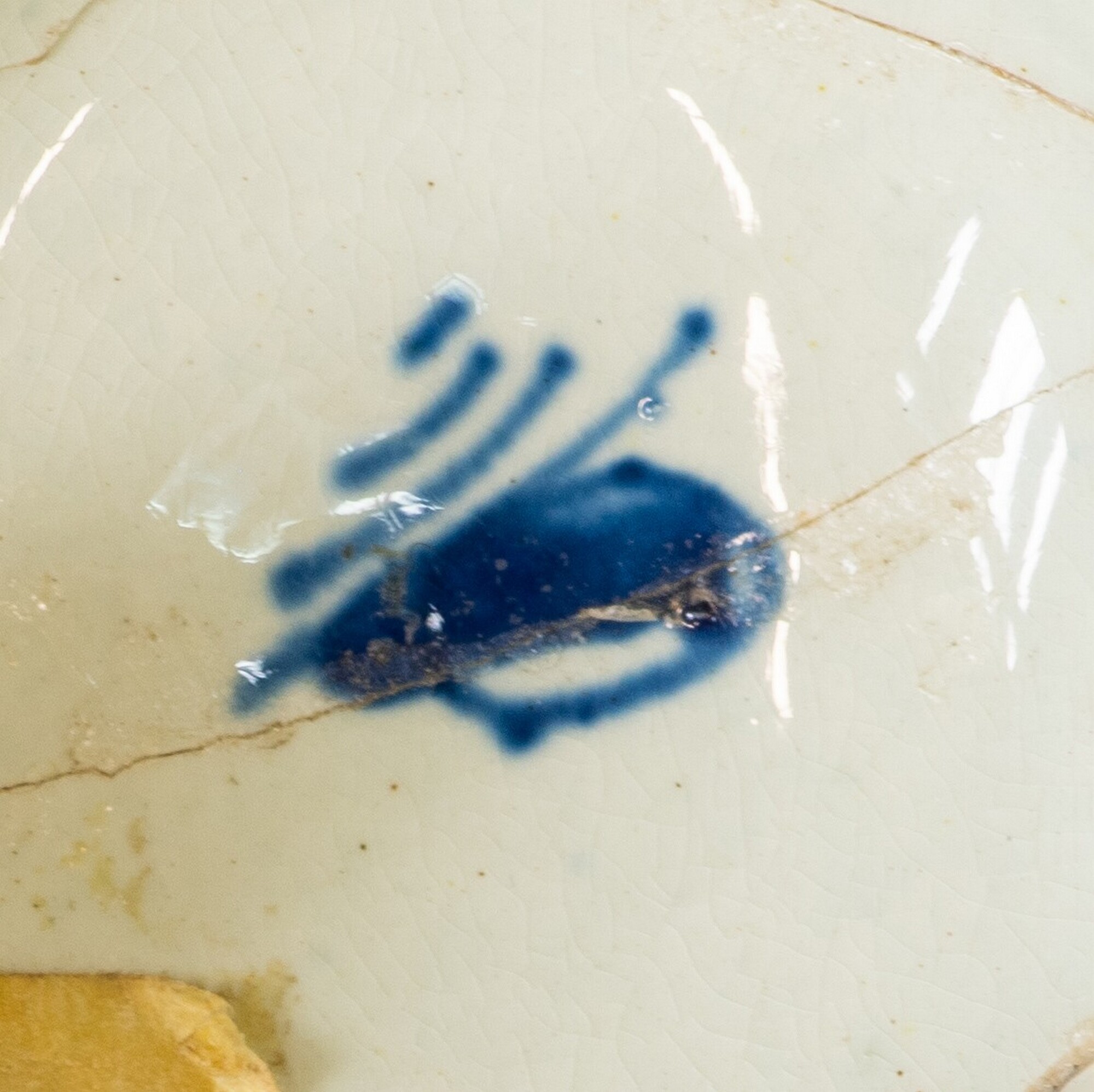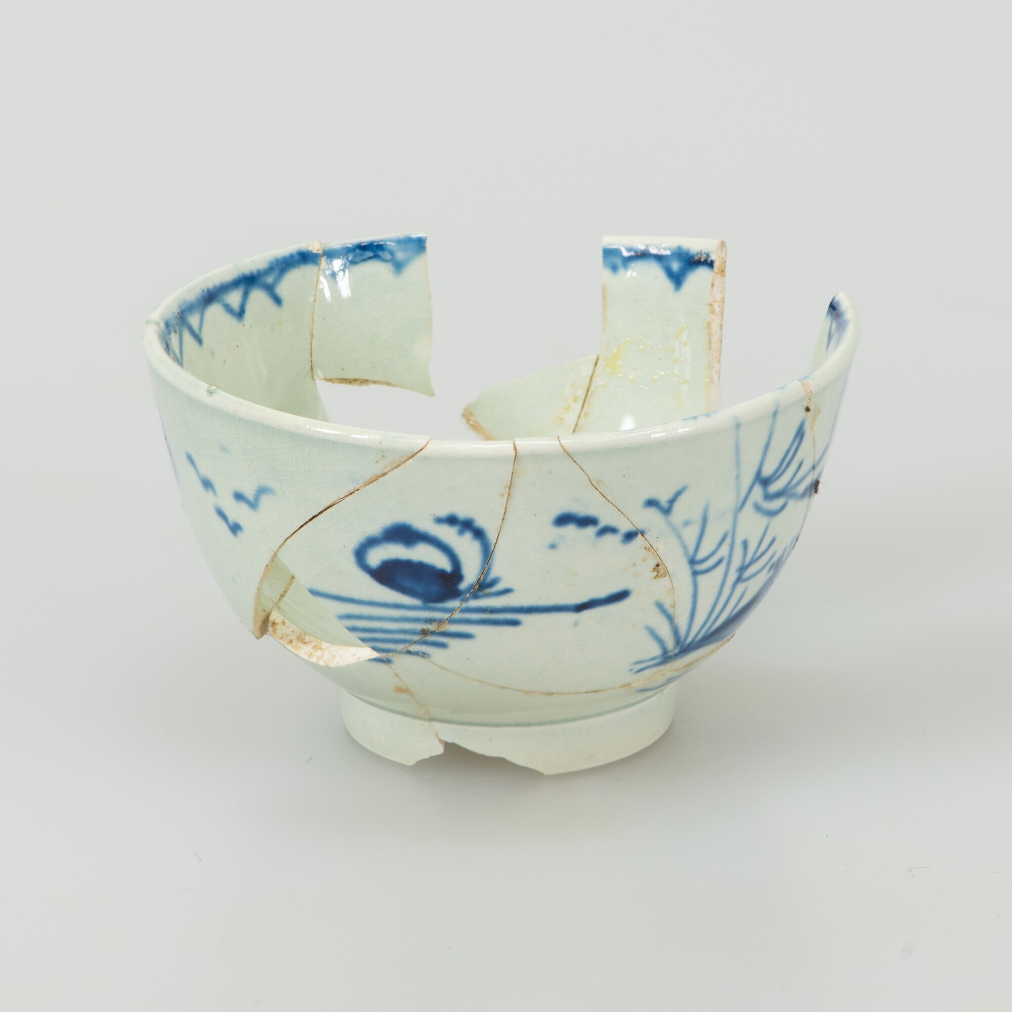 Kop; iw-kop-1; bolle kop met rechte rand, rechte standring; industrieel wit aardewerk (pearlware); loodglazuur; onderglazuur blauwe beschildering: inwendig: slingerlijn en bies langs rand, uitwendig: landschap met huis en boom ("Chinese house pattern"); herkomst: Engeland