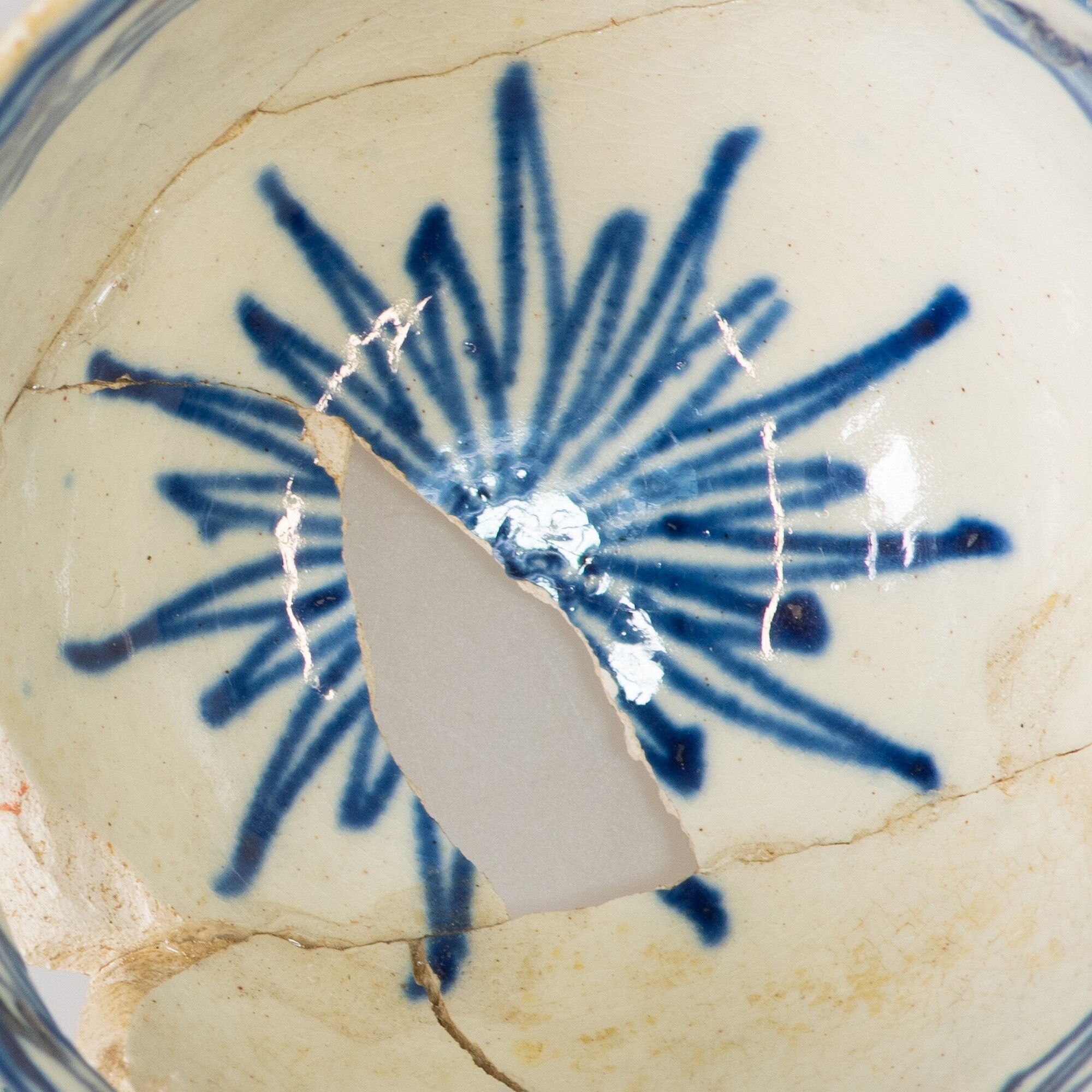 Kop; iw-kop-1; bolle kop met rechte rand, rechte standring; industrieel wit aardewerk (pearlware); loodglazuur; onderglazuur blauwe beschildering: inwendig: bloem op bodem; in- en uitwendig: servetwerk en ovale cartouches met stilistische bladertakken langs rand; herkomst: Engeland