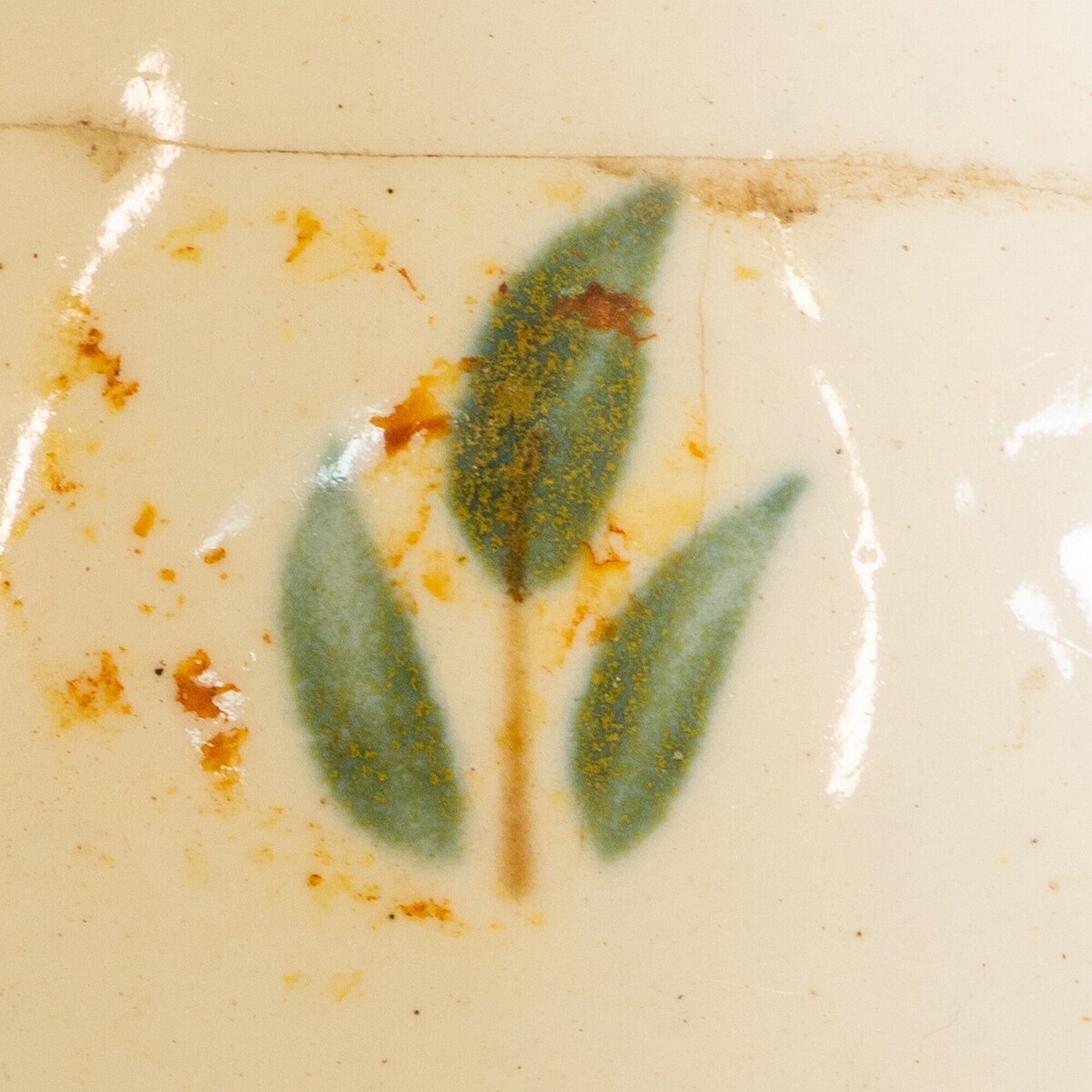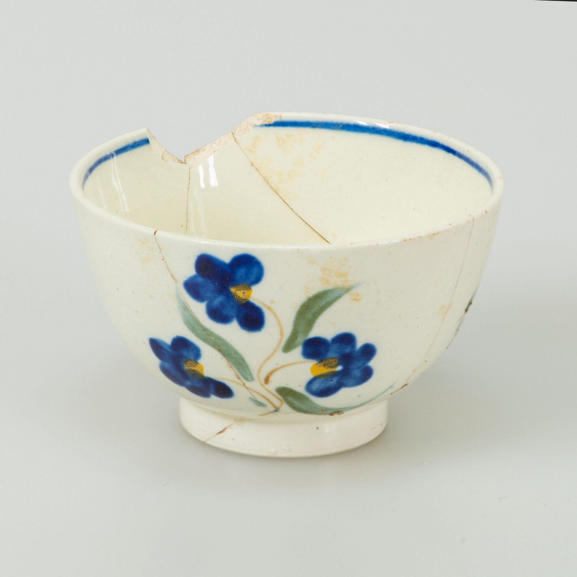 Kop; iw-kop-1; bolle kop met rechte rand, rechte standring; industrieel wit aardewerk (pearlware); loodglazuur; onderglazuur polychrome beschildering: inwendig: bladmotieven op bodem en blauwe bies langs rand; uitwendig: bloementakken en bladmotieven; herkomst: Engeland