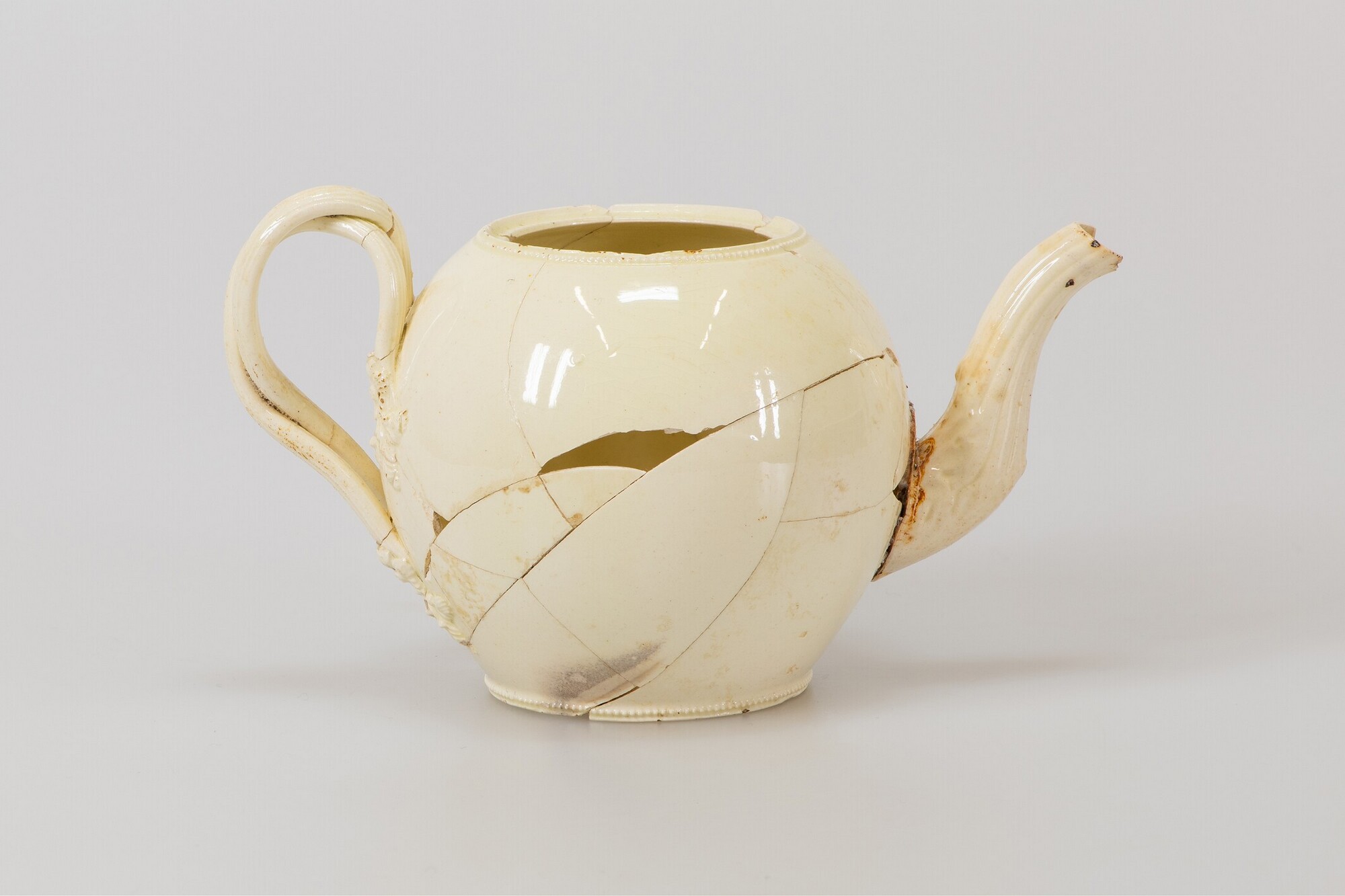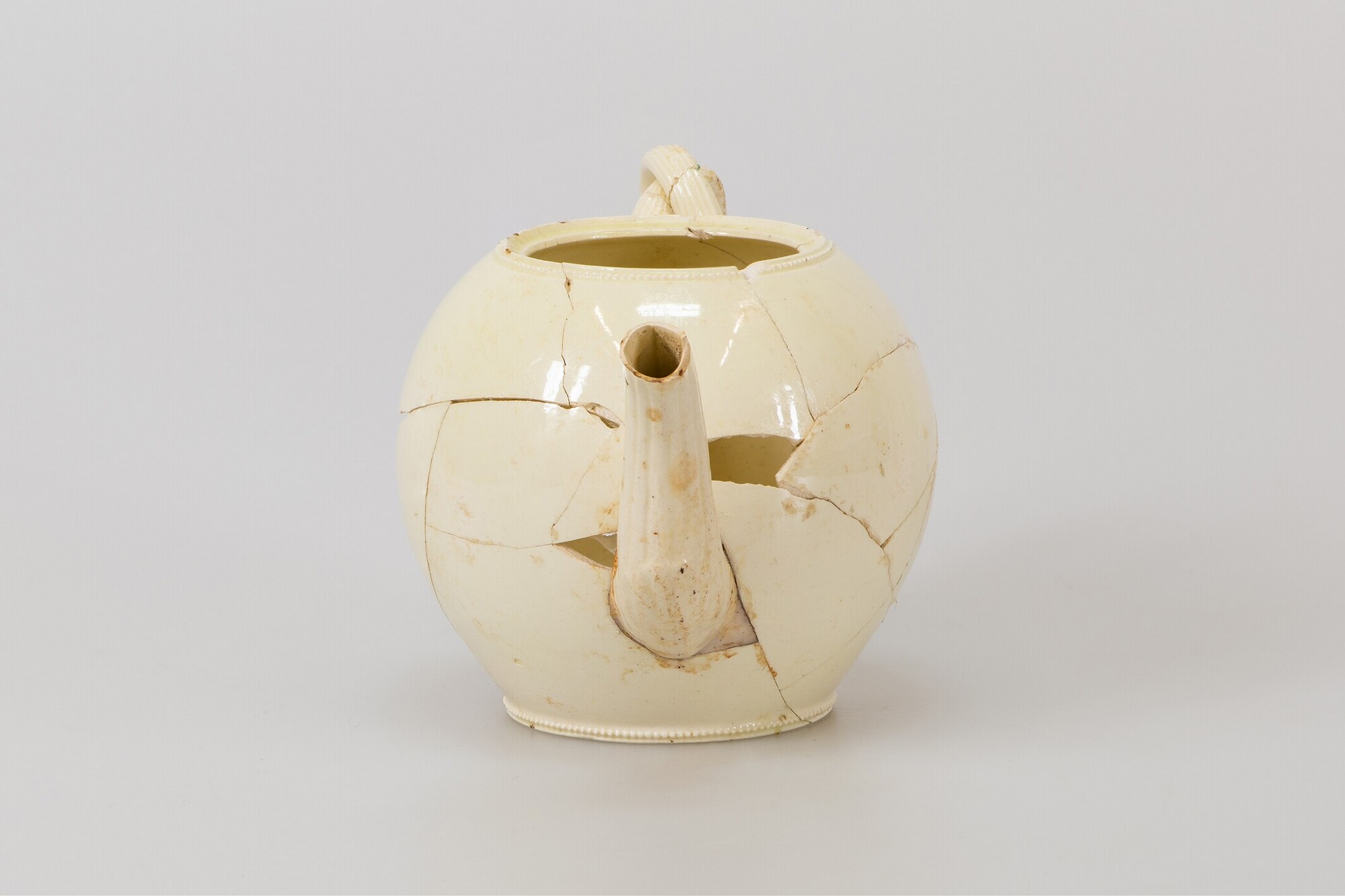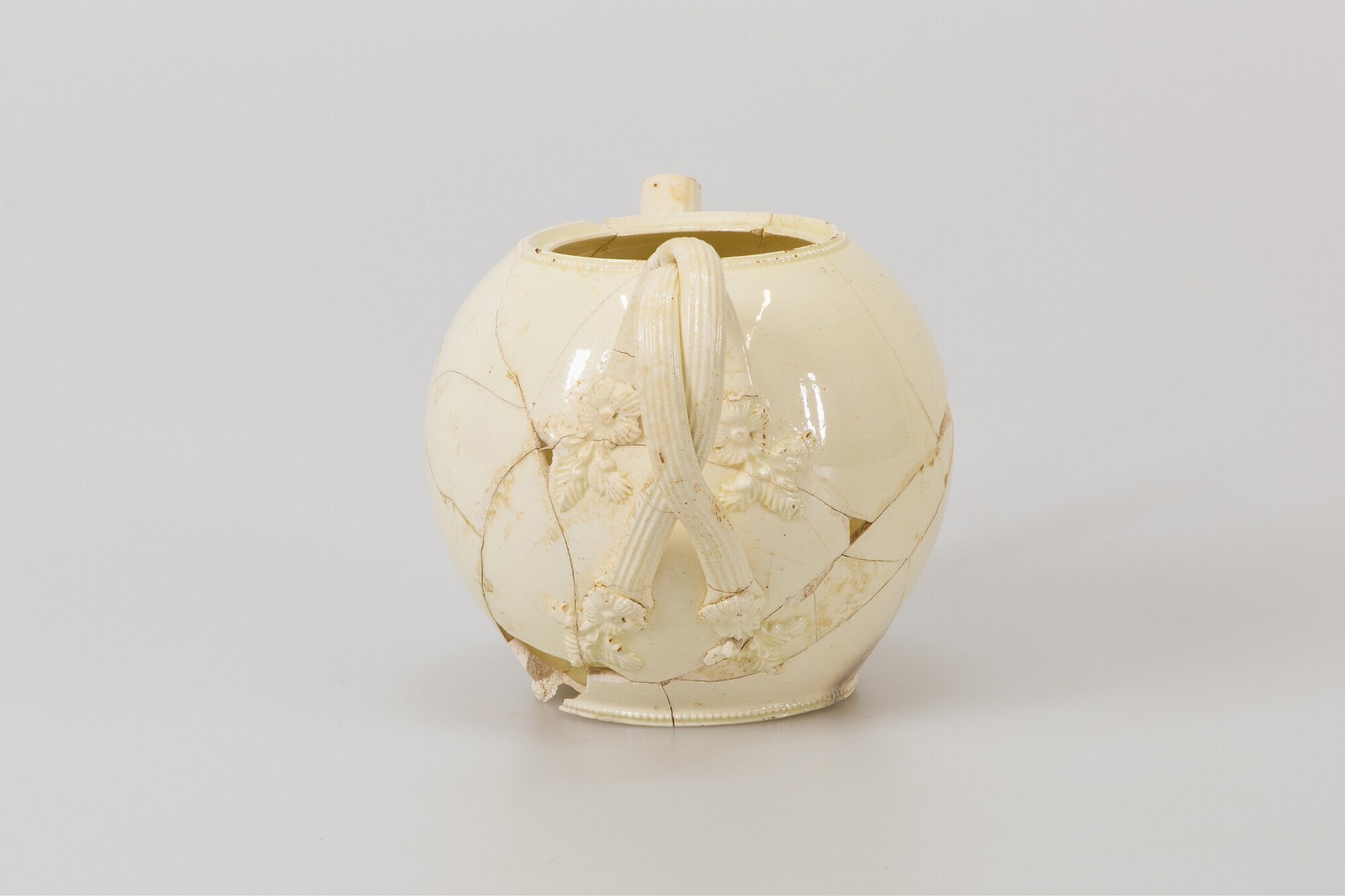 Theepot; iw-the-10; bolle theepot zonder hals, met dekselgeul, standring; industrieel wit aardewerk (creamware); loodglazuur; parelrand langs bodem en rand; geribbelde tuit met bladmotieven in reliëf bij aanzet, gekruist geribbeld dubbel oor met florale appliques bij aanzet; herkomst: Engeland, vermoedelijk Leeds, Yorkshire