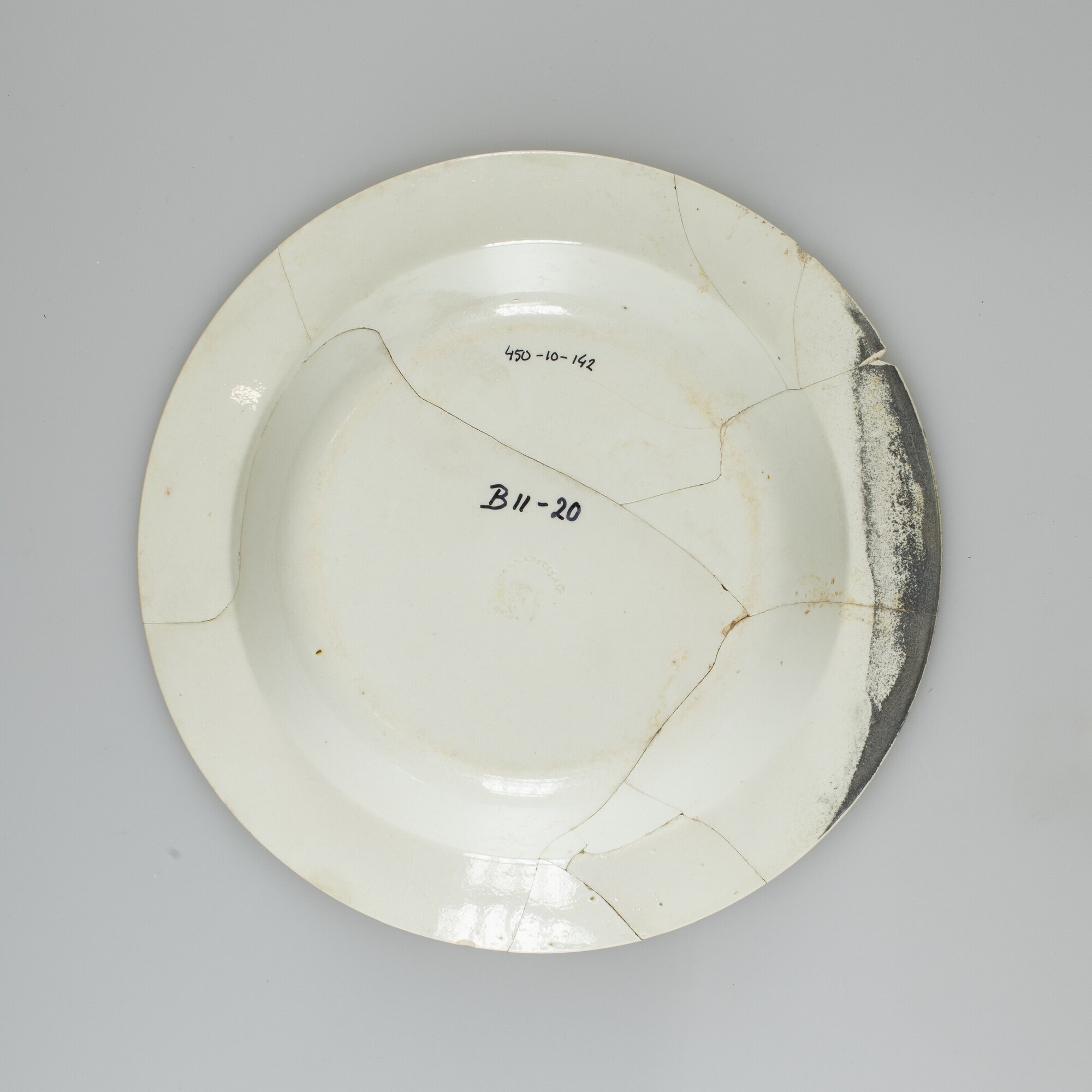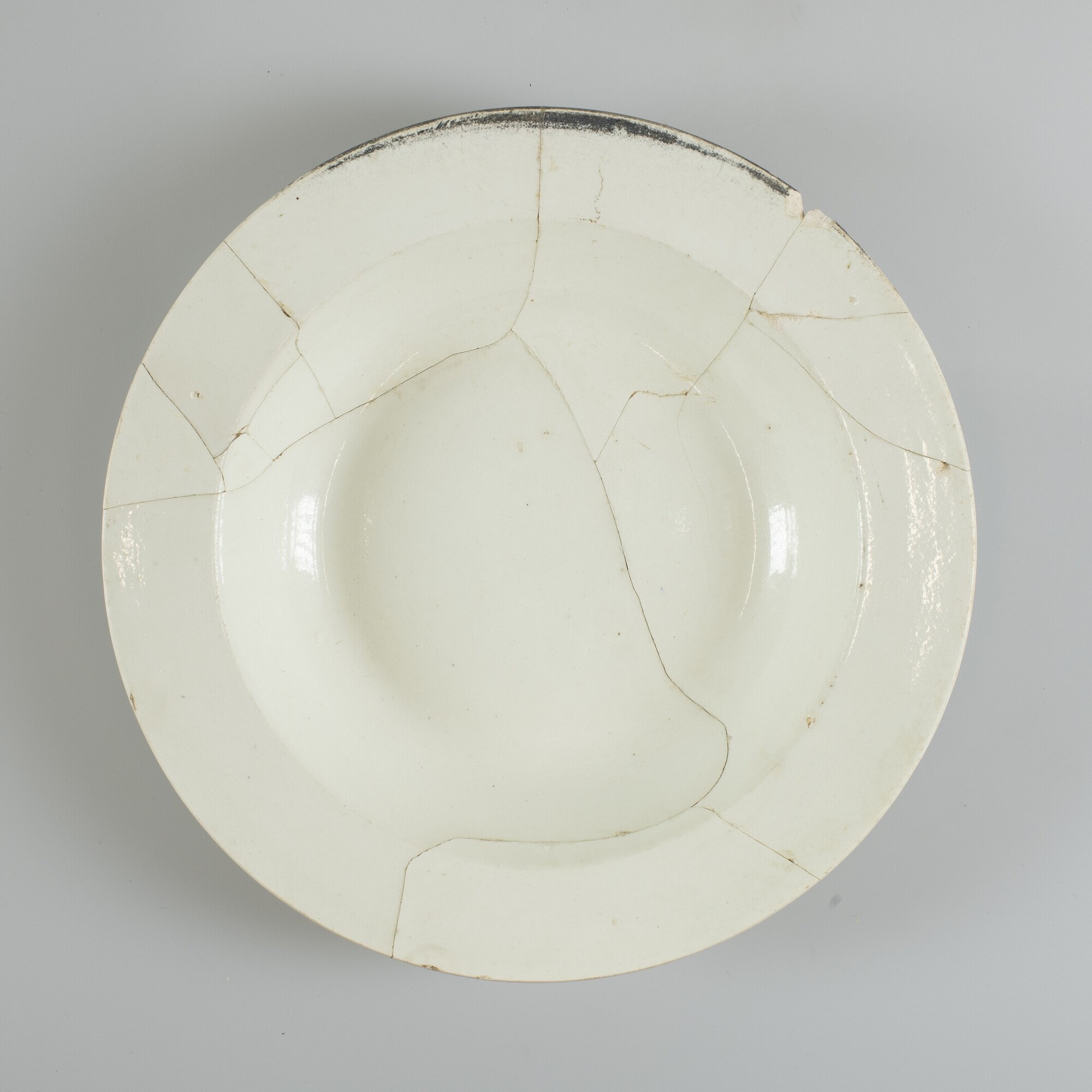 Bord; soepbord; iw-bor-5; diep bord met naar buiten geknikte vlag, standvlak; industrieel wit aardewerk (creamware); loodglazuur; herkomst: Sunderland, Engeland, Garrison Pottery (in bedrijf tussen 1818-1839)
