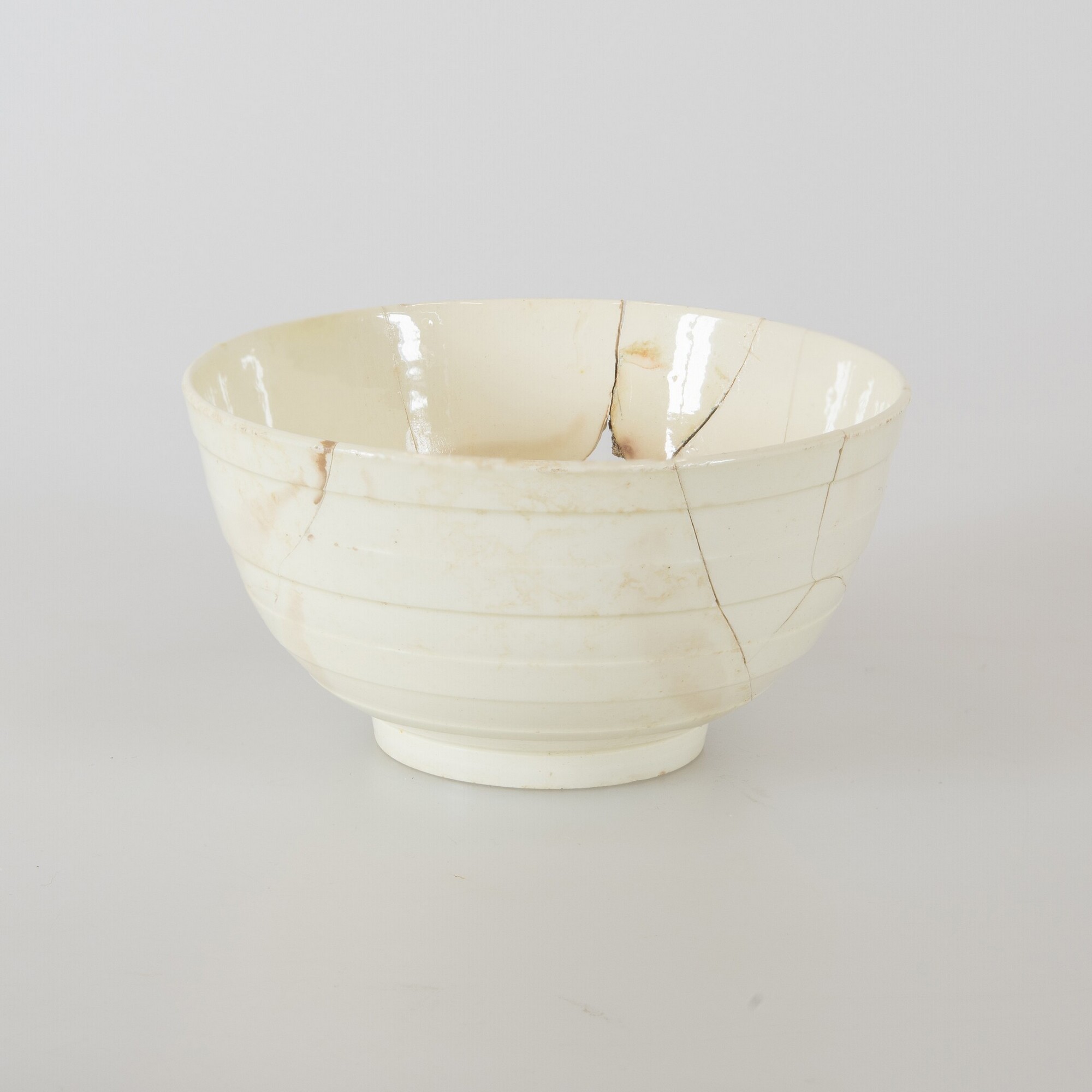 Kop; iw-kop-1; bolle kop met rechte rand, rechte standring; industrieel wit aardewerk (creamware); loodglazuur; uitwendig versierd met malgevormde horizontale banden; loodglazuur; herkomst: Engeland