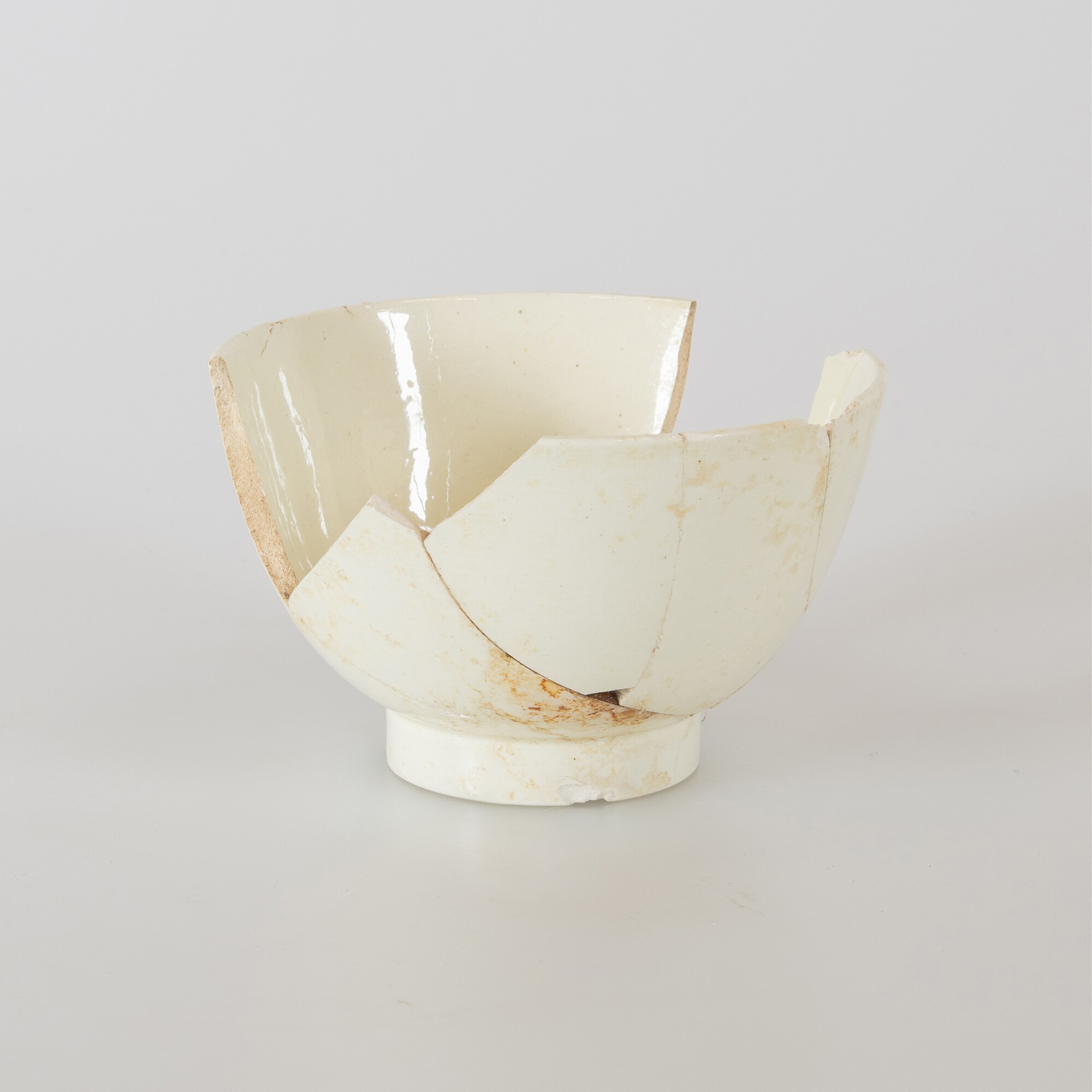 Kop; iw-kop-1; bolle kop met rechte rand, rechte standring; industrieel wit aardewerk (creamware); loodglazuur; herkomst: Engeland