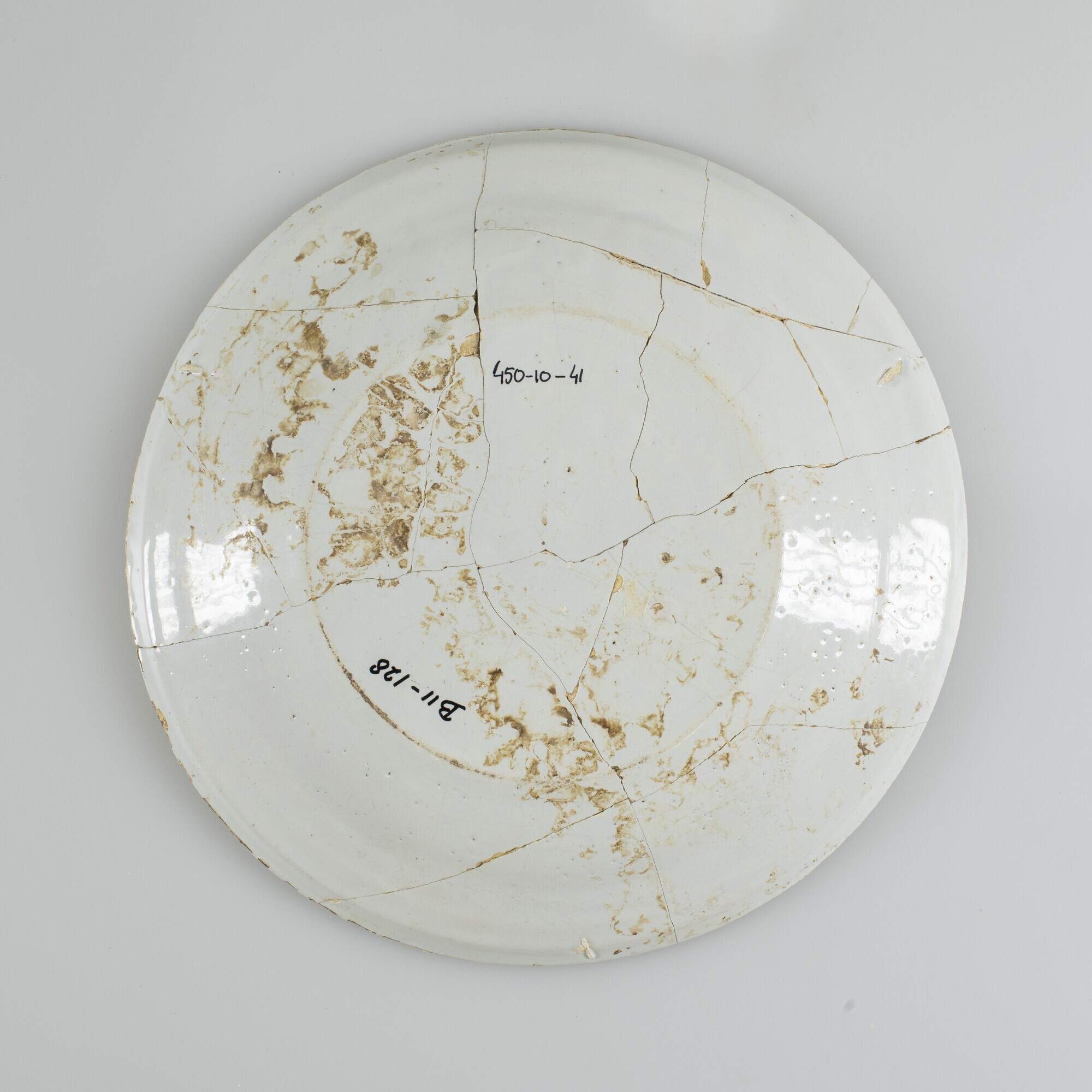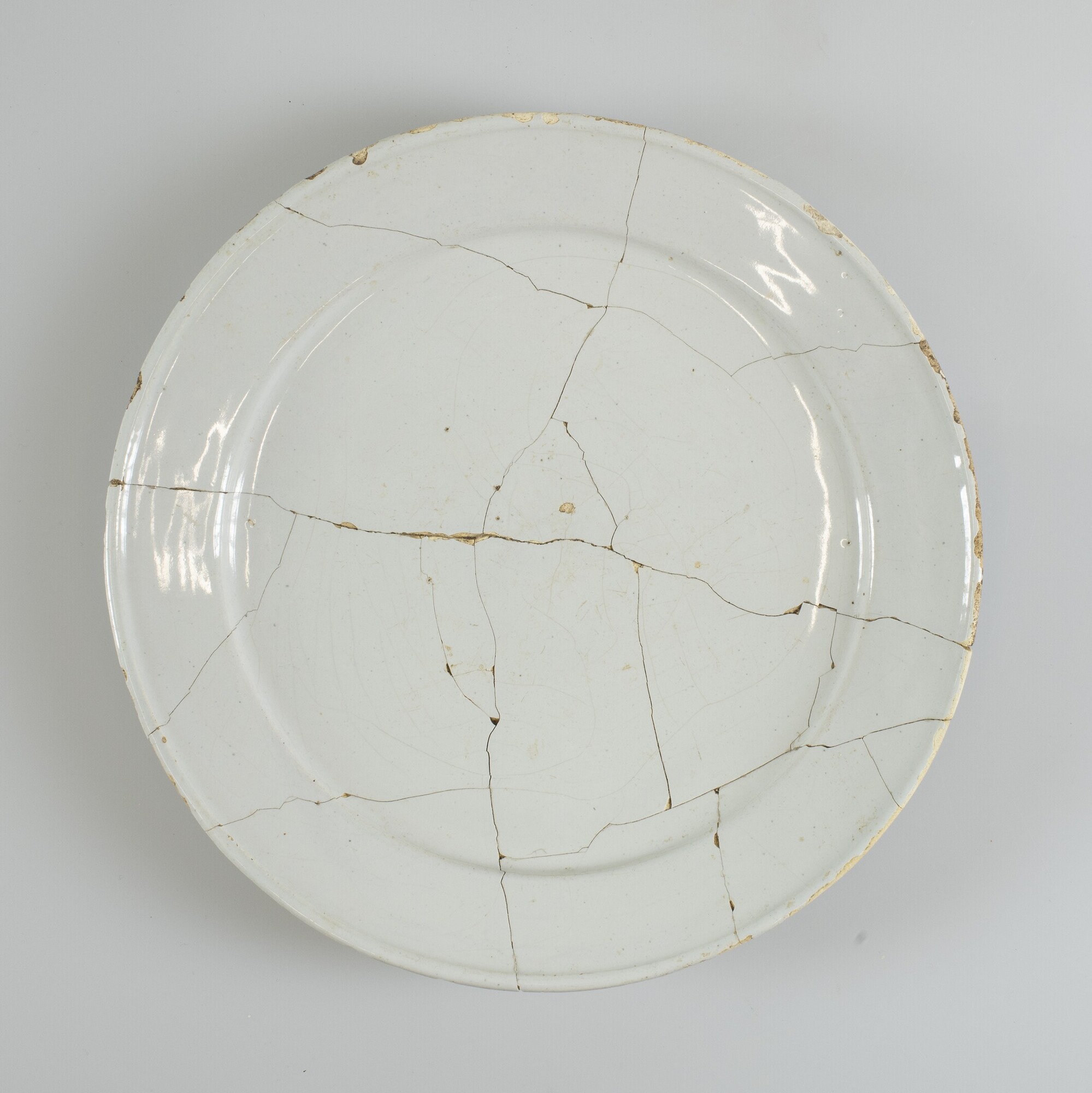 Bord; f-bor-2; plat bord met platte spiegel, platte vlag inwendig met knik afgezet, standvlak; faience; tinglazuur; herkomst: Delft