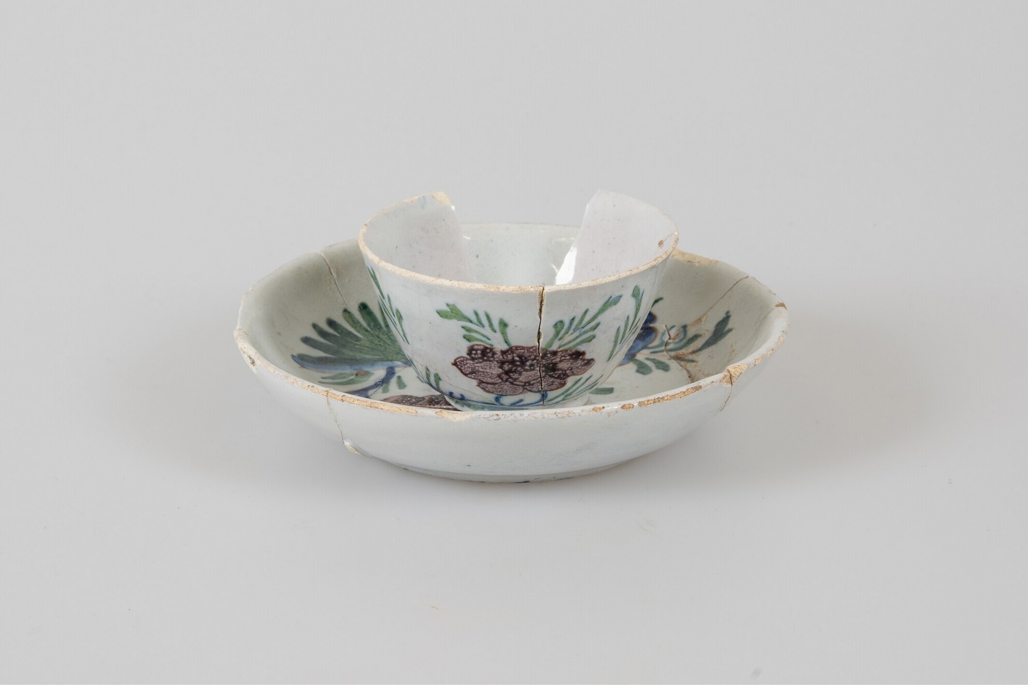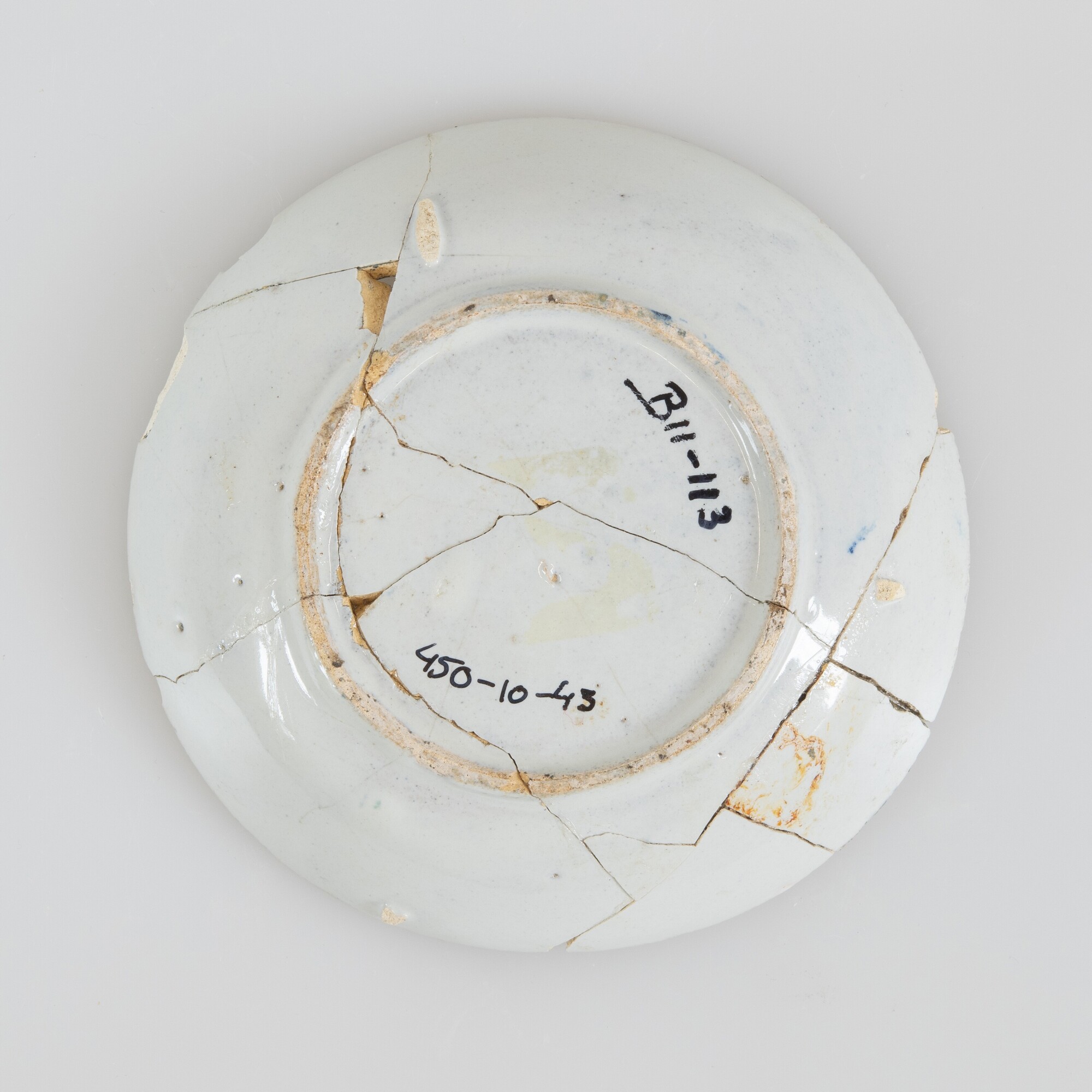 Schotel; f-bor-8; diep afgerond bord met rechte rand, standring; faience; tinglazuur; inwendig polychrome beschildering: bloemen op grondje; herkomst: Delft
