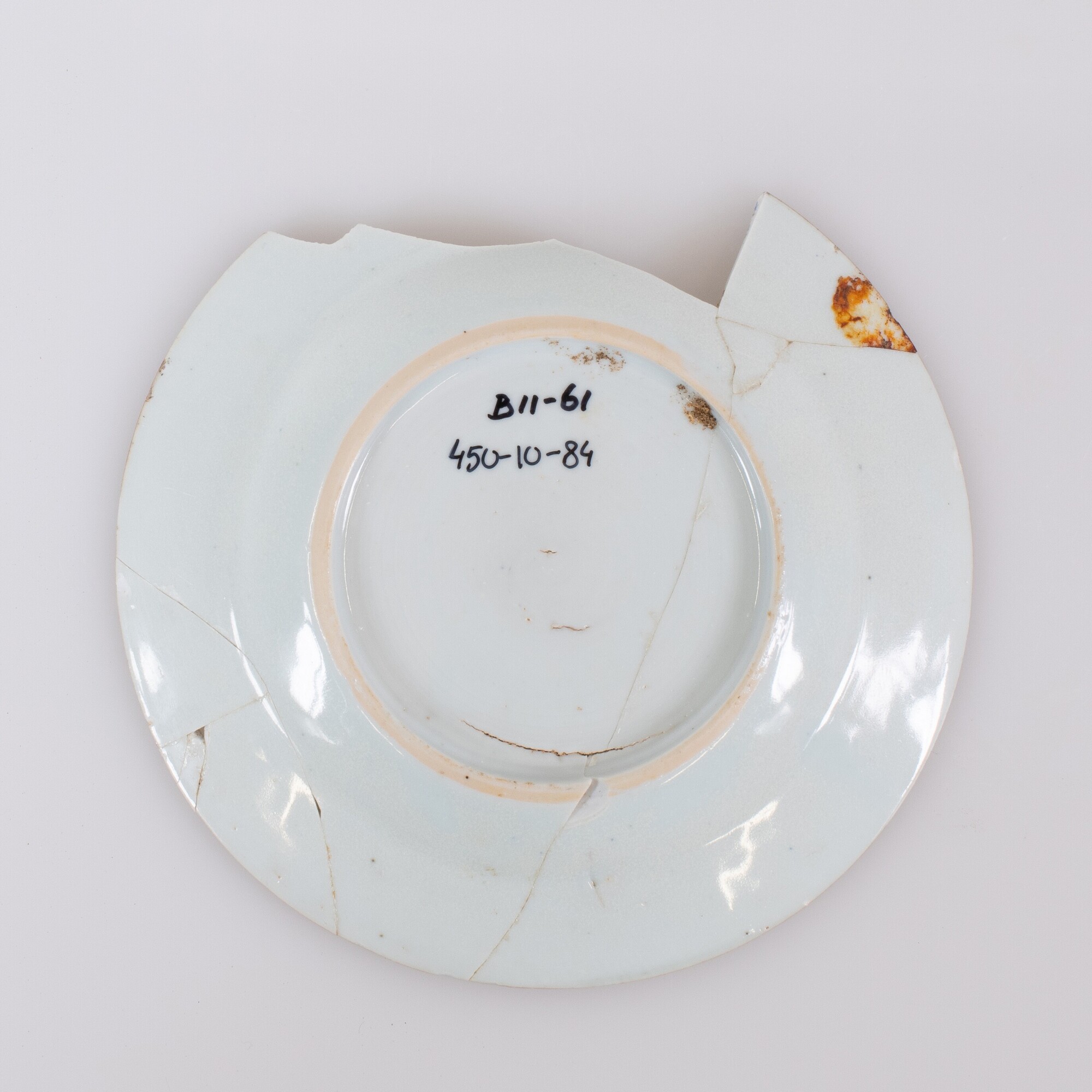 Bord; p-bor-5; bord met knik van bodem naar wand en naar buiten geknikte vlag, uitgedraaide standring; Aziatisch porselein; veldspaatglazuur; inwendig onderglazuur blauwe beschildering, bruine rand: spiegel: waterlandschap met pagodes en bomen op eilanden, figuur in boot op de voorgrond, vlag: servetwerk langs rand; herkomst: Jingdezhen, China