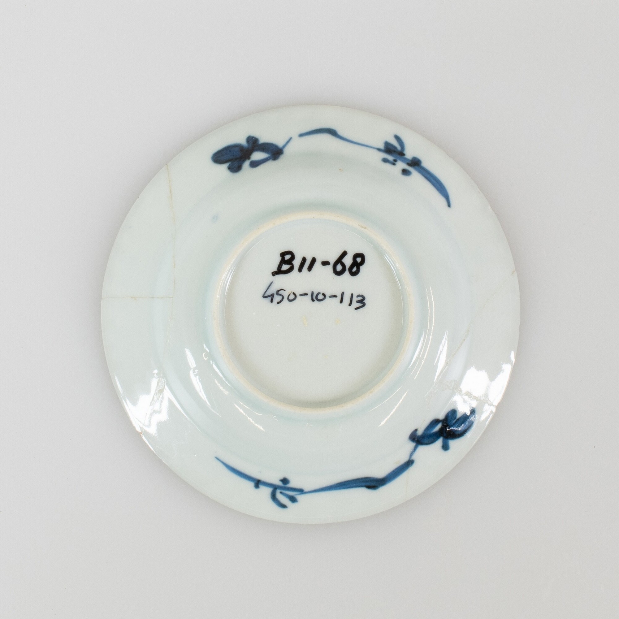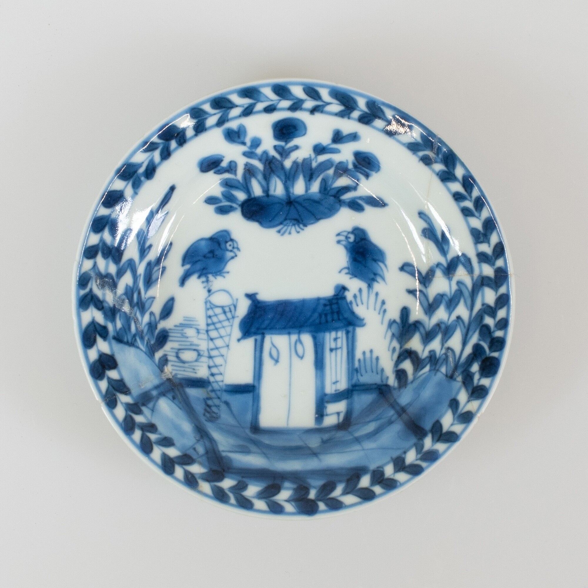 Schotel; p-bor-8; klein bol bord met geknikte platte vlag, standring; Aziatisch porselein; veldspaatglazuur; onderglazuur blauwe beschildering: inwendig: spiegel: paviljoen met vogels en struiken in tuin, vlag: bladerkrans langs rand, uitwendig: florale motieven; herkomst: Jingdezhen, China
