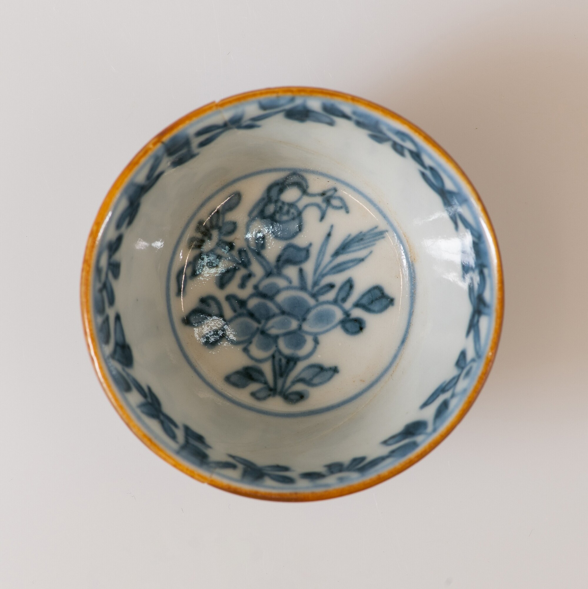 Kop; p-kop-1; kop met iets uitgebogen rand, standring; Aziatisch porselein (kapucijnerwaar); veldspaatglazuur; inwendig onderglazuur blauwe beschildering: florale motieven, uitwendig bruine sliblaag (ijzerengobe); herkomst: Jingdezhen, China