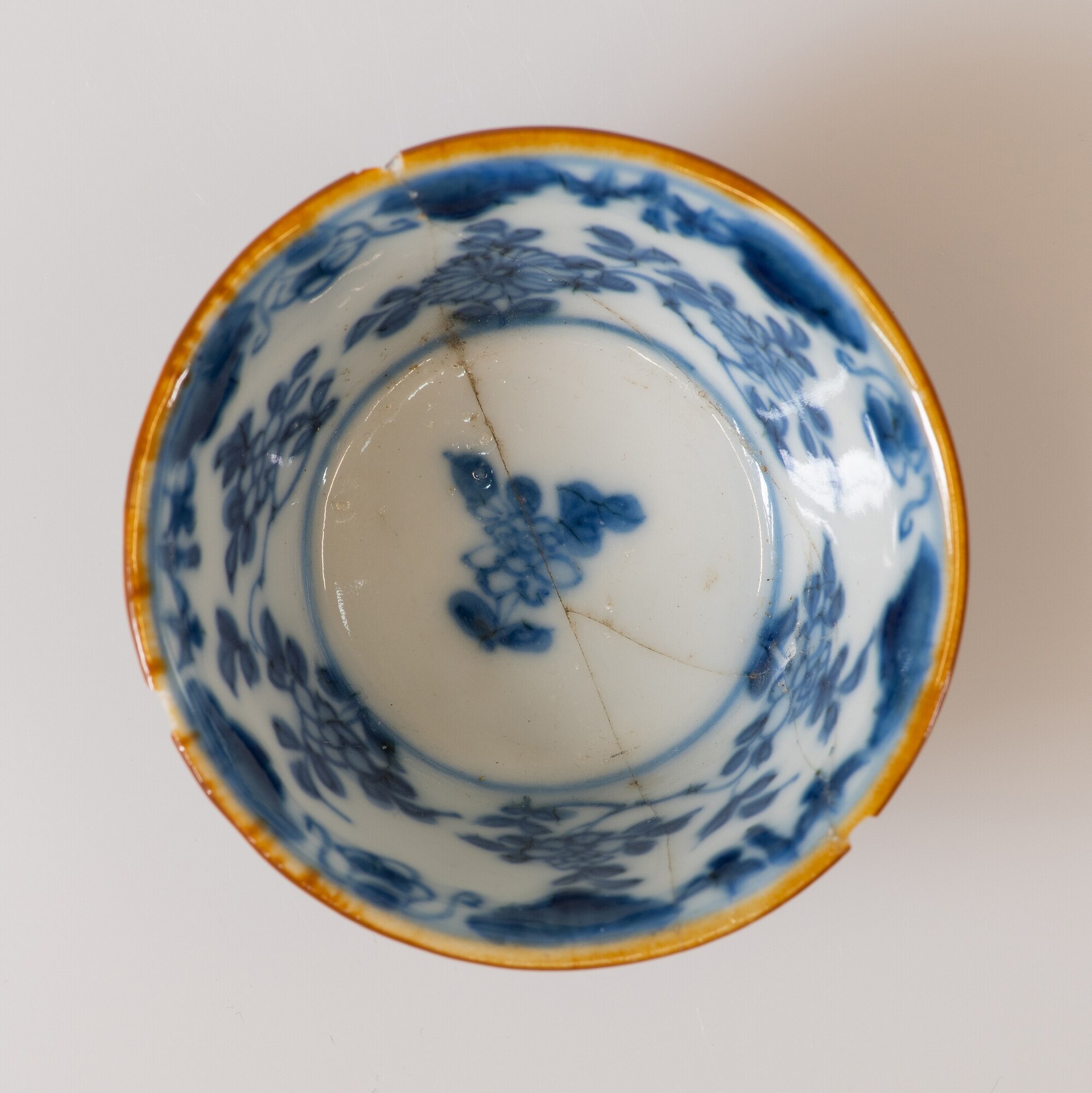 Kop; p-kop-1; kop met iets uitgebogen rand, standring; Aziatisch porselein (kapucijnerwaar); veldspaatglazuur; inwendig onderglazuur blauwe beschildering: florale motieven, uitwendig bruine sliblaag (ijzerengobe); herkomst: Jingdezhen, China