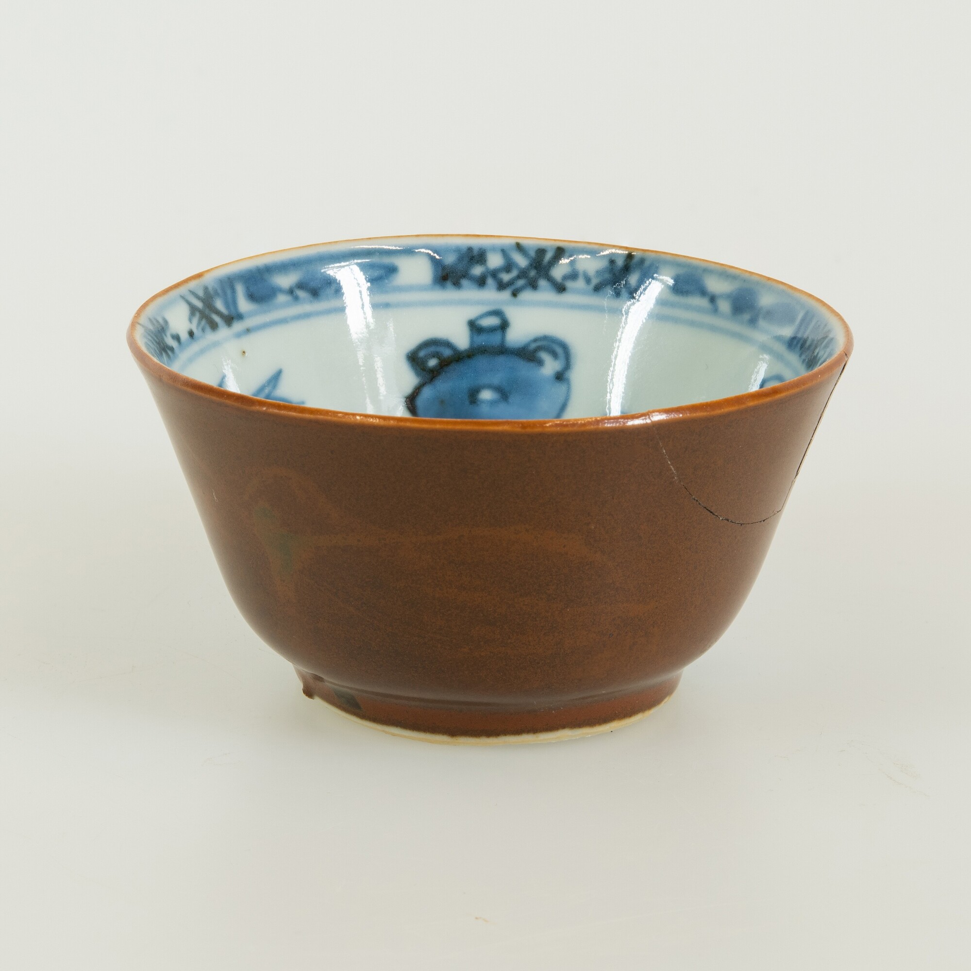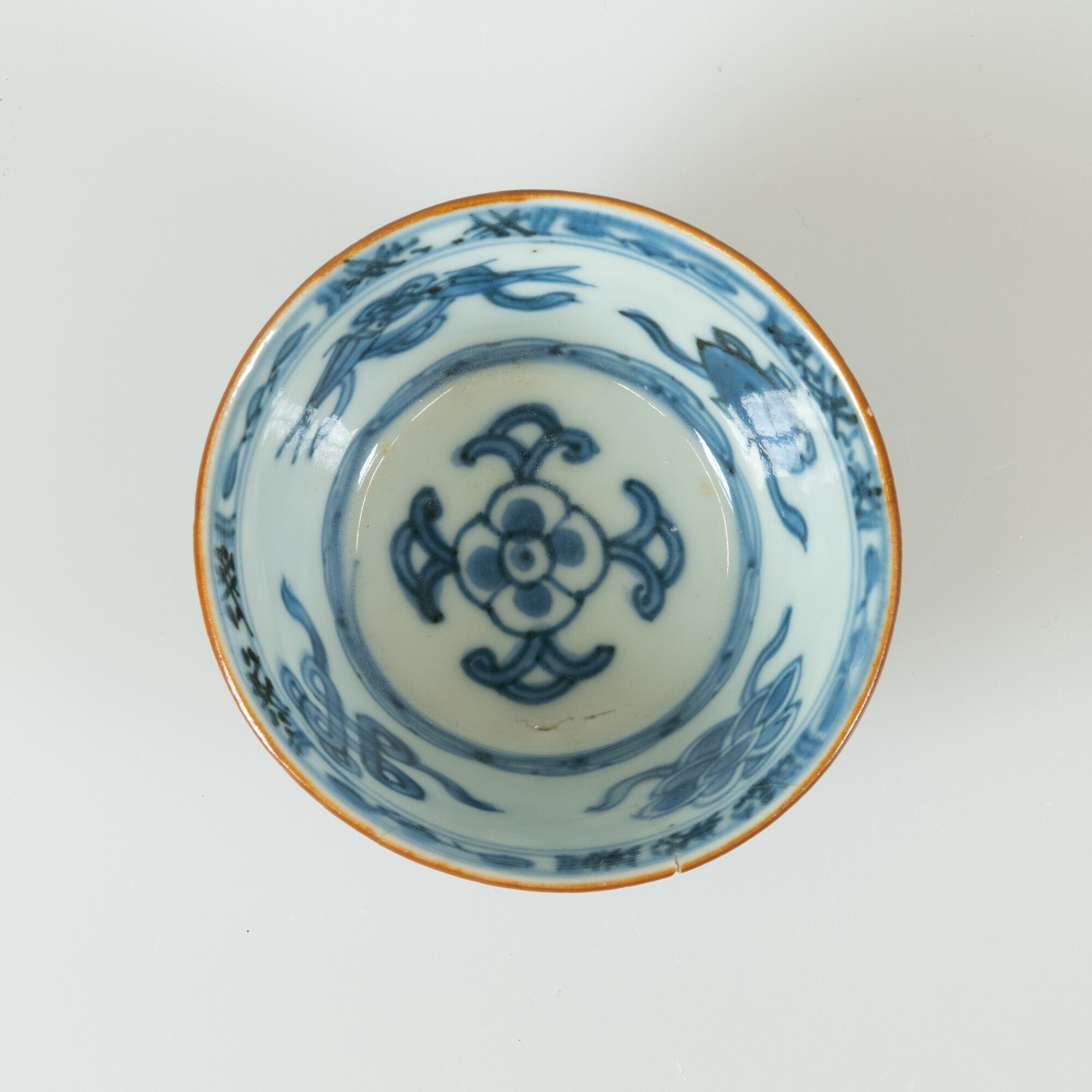 Kop; p-kop-1; kop met iets uitgebogen rand, standring; Aziatisch porselein (kapucijnerwaar); veldspaatglazuur; inwendig onderglazuur blauwe beschildering: lotus op bodem, boeddhistische symbolen op wand en servetwerk langs rand, uitwendig bruine sliblaag (ijzerengobe); herkomst: Jingdezhen, China