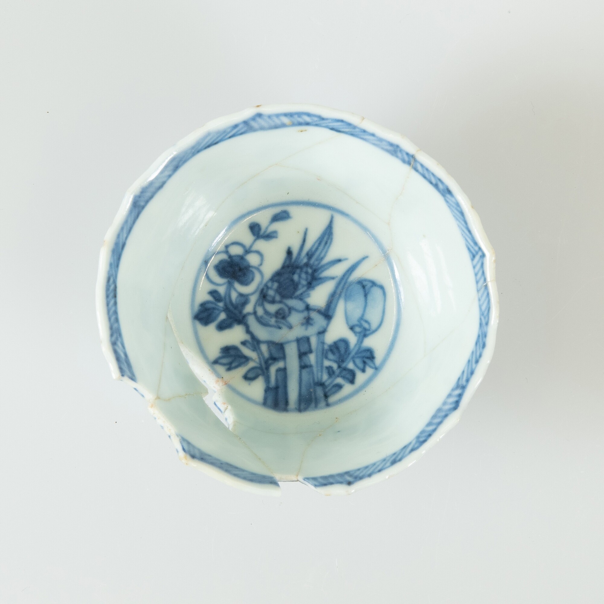 Kop; p-kop-9; in mal gevormde kop met plooiwand en uitgebogen rand, standring; Aziatisch porselein; veldspaatglazuur; onderglazuur blauwe beschildering: inwendig: vogel tussen bloemen op bodem, servetwerk langs rand, uitwendig: landschapjes en bloemen in panelen; herkomst: Jingdezhen, China