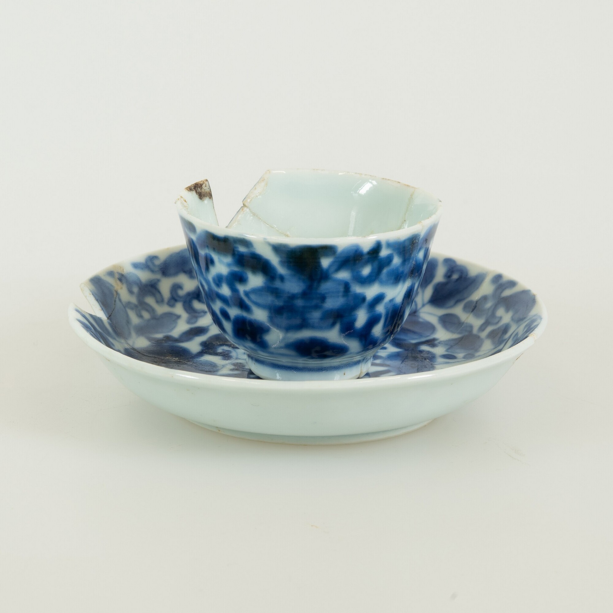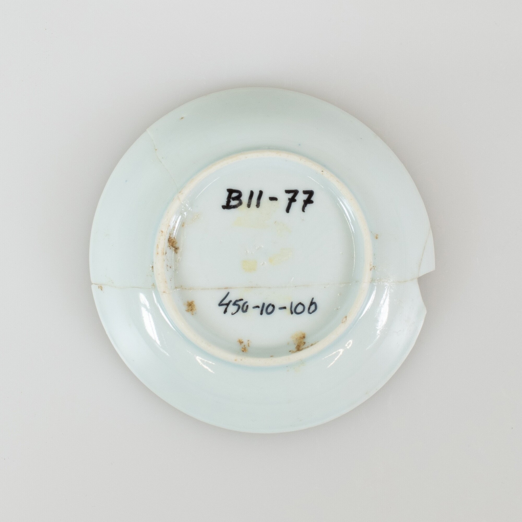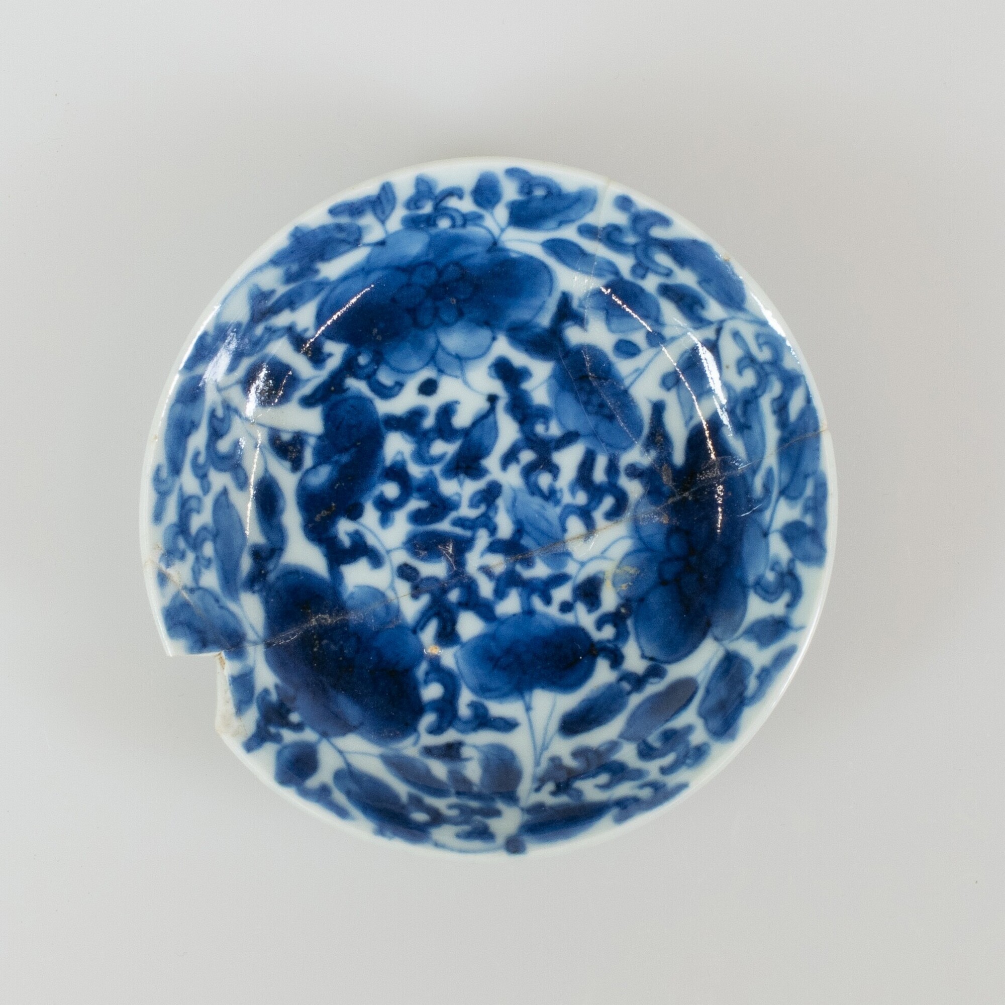 Schotel; p-bor-1; klein bord met uitgebogen rand, standring; Aziatisch porselein; veldspaatglazuur; inwendig onderglazuur blauwe beschildering: florale motieven; herkomst: Arita, Japan