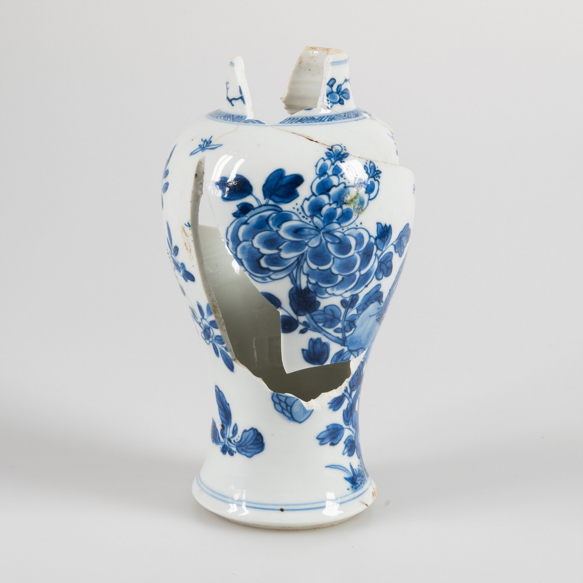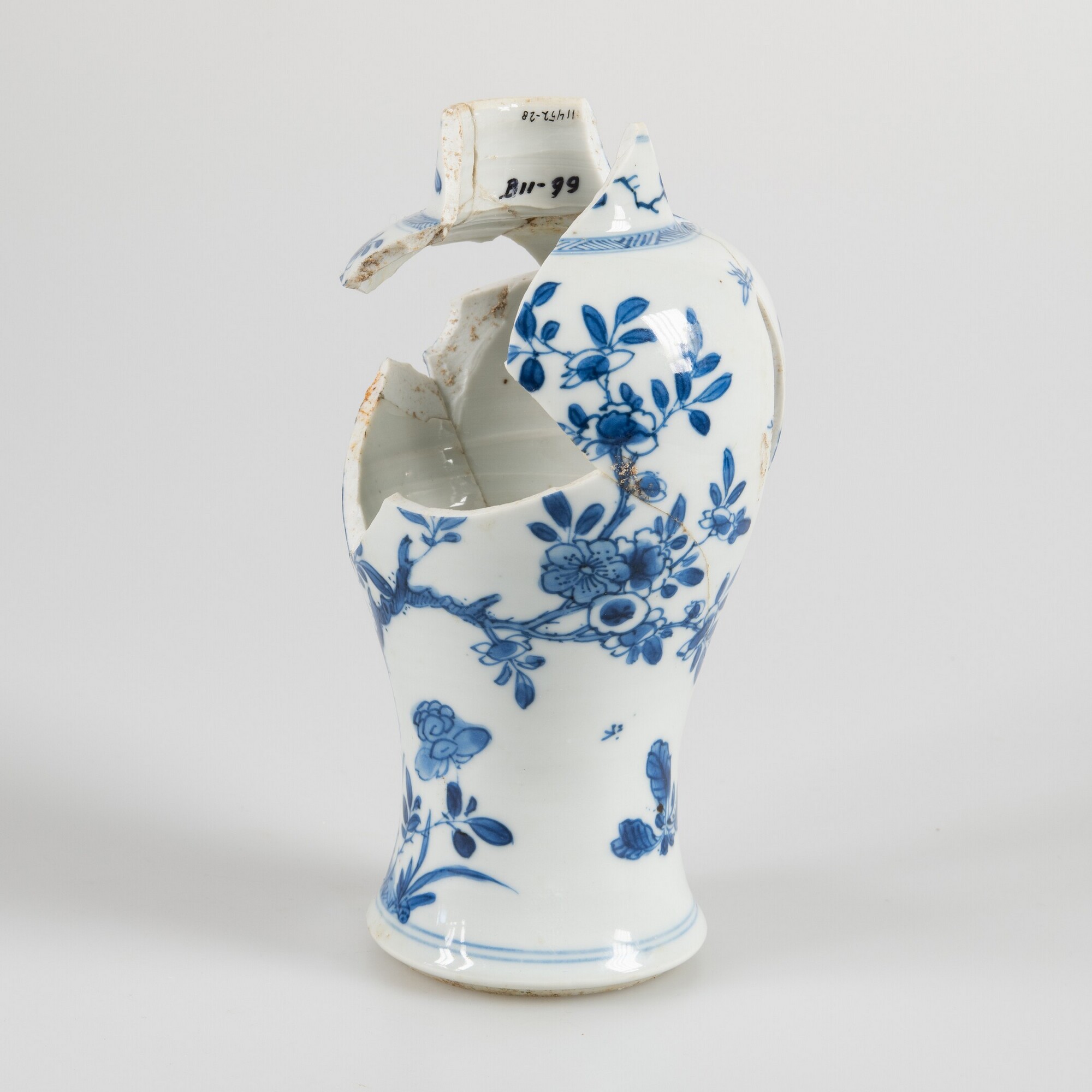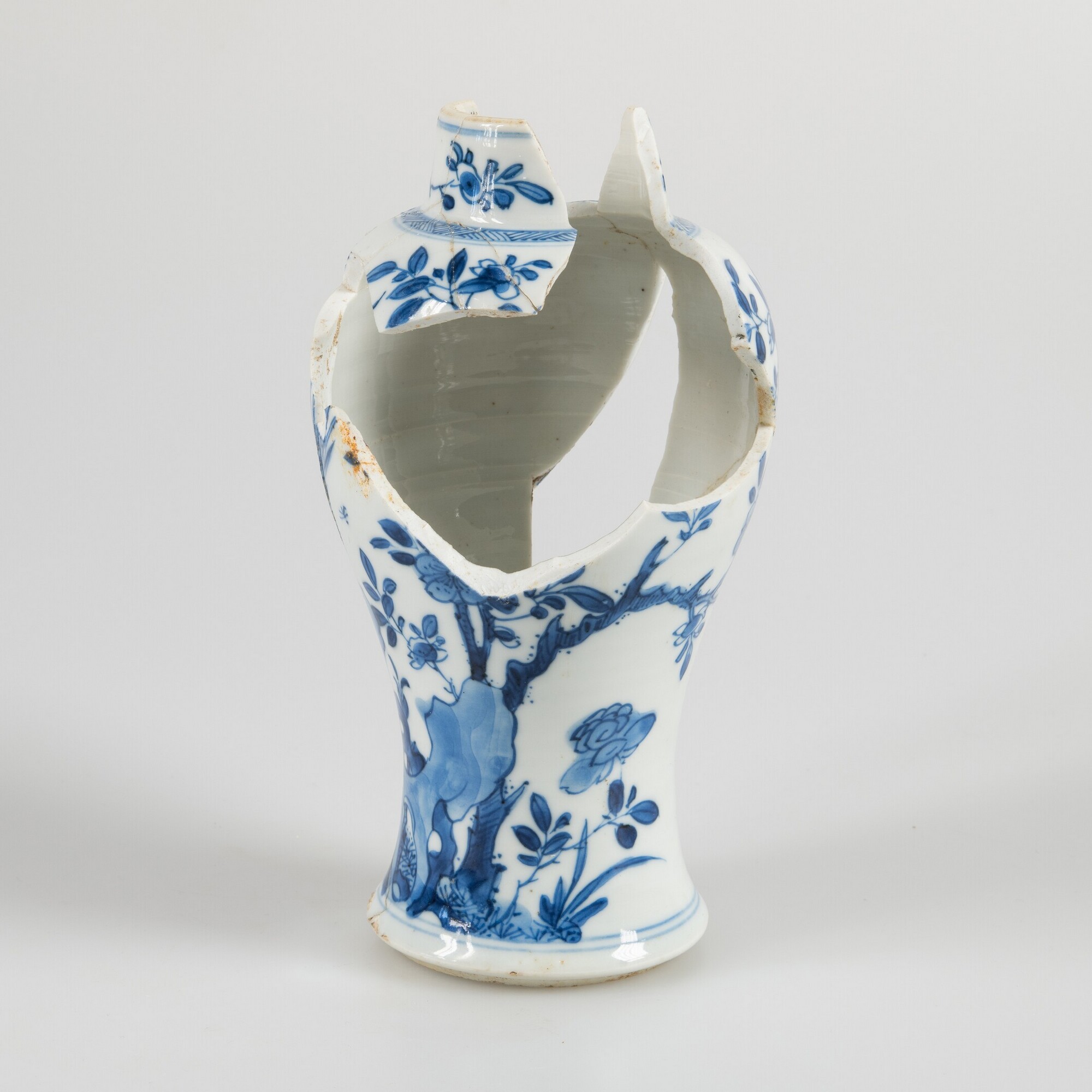 Vaas; p-vaa-4; balustervormige vaas met recht opstaande rand, standring; Aziatisch porselein; veldspaatglazuur; uitwendig onderglazuur blauwe beschildering: vogel en bloesemstruiken op rots, servetwerk op schouder en blauwe biezen langs rand en bodem, dubbele cirkel op bodem; herkomst: Jingdezhen, China