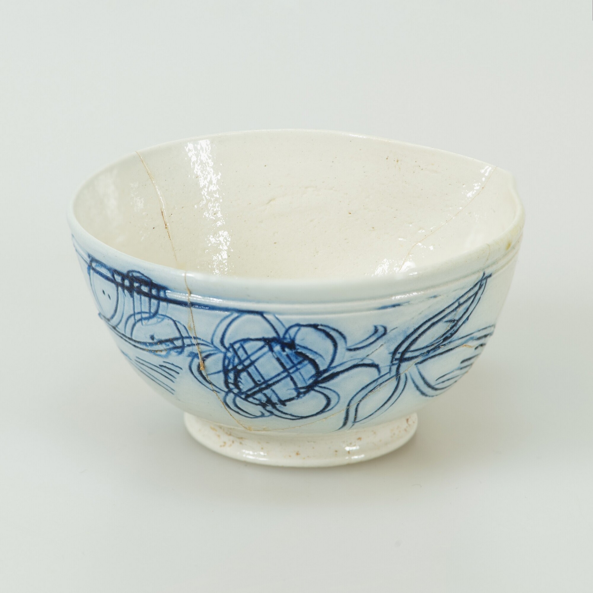 Kom; s3-kom-6; steilwandige kleine kom met iets uitgebogen rand en schenklip, standring, lintoor (helft ontbreekt); industrieel steengoed (white salt-glazed stoneware); zoutglazuur; uitwendig gekerfde patronen met blauwe accenten (scratch blue): florale motieven; herkomst: Engeland, Staffordshire