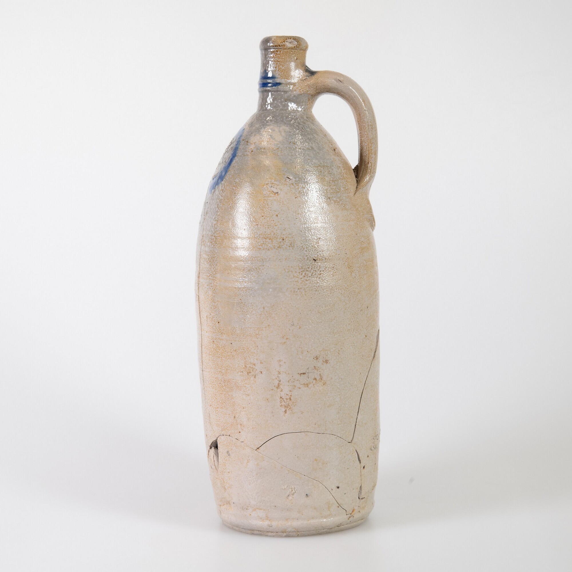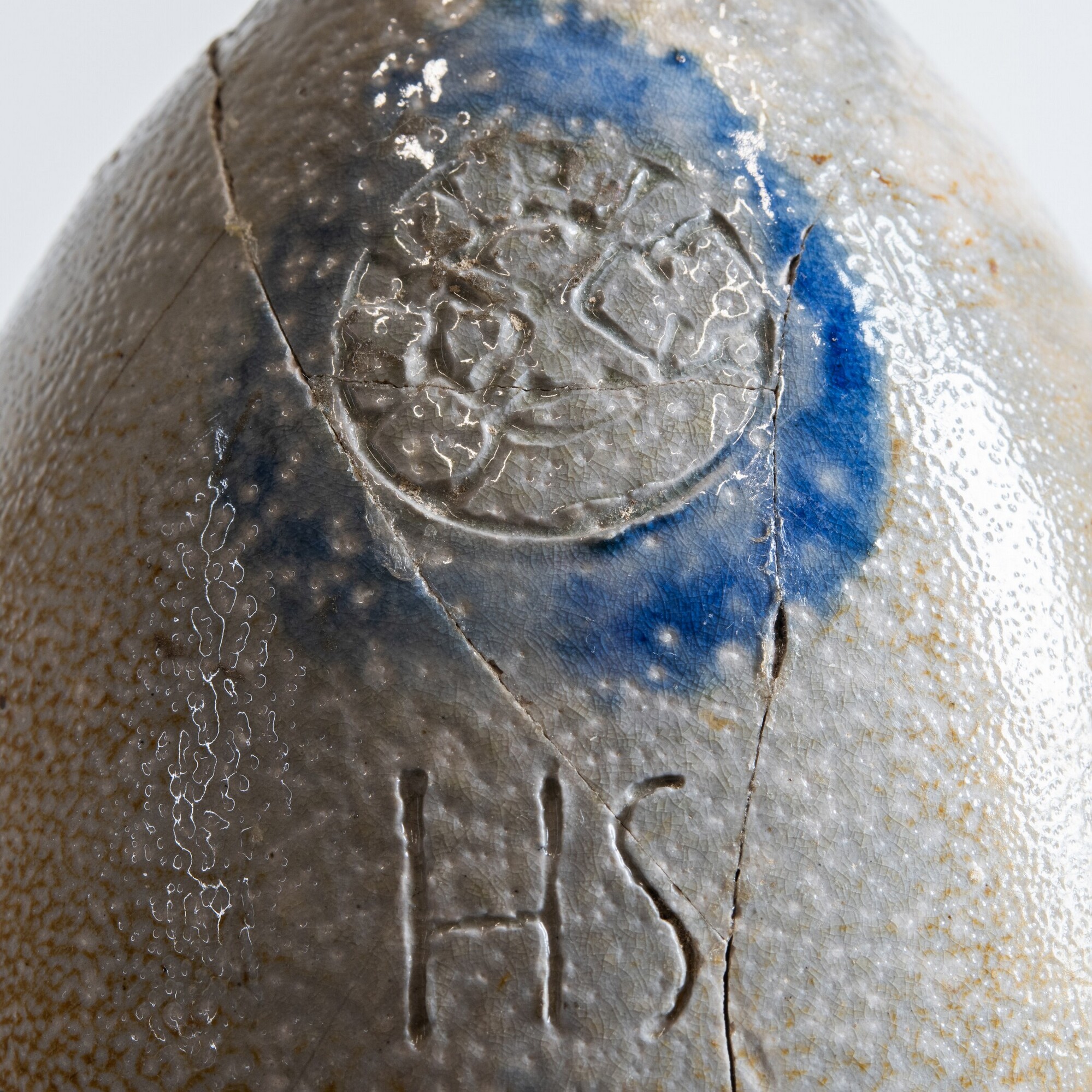 Mineraalwaterfles; s2-fle-2; iets bolle fles met cilindrische nek en verdikte lip, ribbel op hals, standvlak; steengoed met oppervlaktebehandeling: zoutglazuur; op schouder rond merkstempel van de Selters-bron in het Keurvorstendom Trier met blauwe beschildering rondom en blauwe beschildering op halsribbel; herkomst: Westerwald