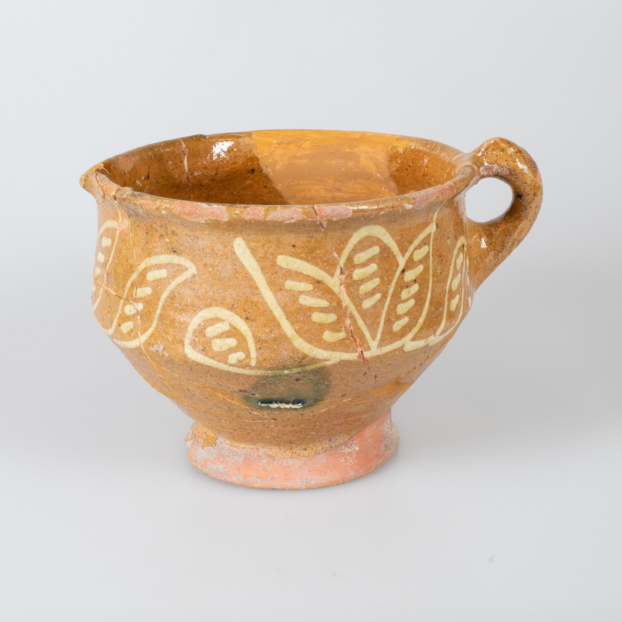 Kan / melkpot; r-kan-5; wijdmondige kan met afgeronde buikknik, zonder hals, met iets uitgebogen (verdikte) afgeronde rand, schenklip, standring, verticaal worstoor; roodbakkend aardewerk; loodglazuur; ringeloorversiering: inwendig witte sliblaag, uitwendig tulpmotieven van witte kleislib; tweedekeus product: resten van aangebakken voorwerp van witbakkend aardewerk op wand; herkomst: Friesland